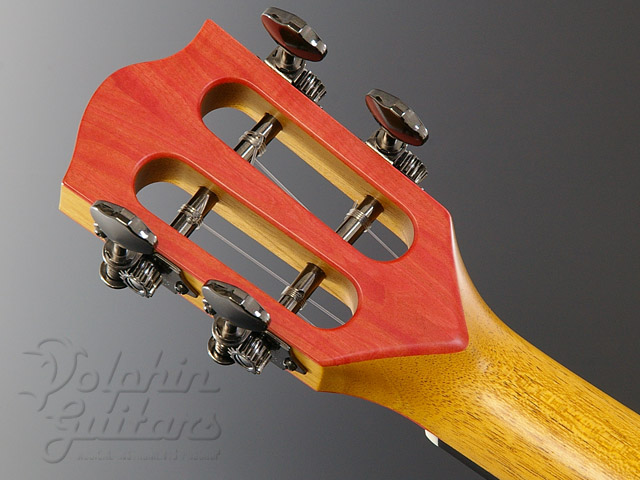 今回のモデルは特に女性的なイメージでと言うことでオーダーしており、ロゼッタにはネックレスをイメージし、小さなドット・アバロンをあしらい、ボディ全体に赤のラインを基調、アバロンでの装飾よりも木の組み合わせで全体的にファンシーでゴージャスなルックスに仕上げて見ました。