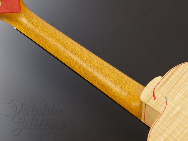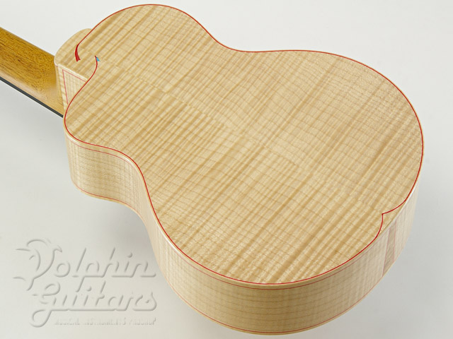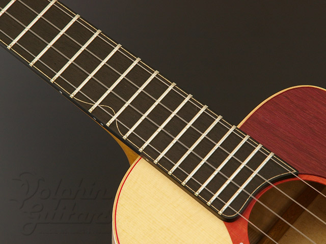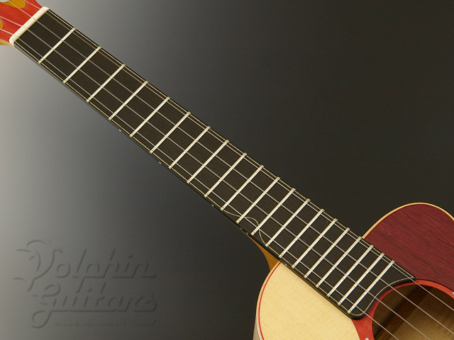 トップには均整の整った色白のイングルマン・スプルースを、木目のギッシリと詰まったきめ細かなカーリー・メイプルをサイド&バックに仕様、ホンジュラス・マホガニー・ネック、エボニー指板&駒、カッタウェイ、スロテッド・ヘッド、ヘッド突板とロゼッタにはピンク・アイボリー、ピックガードにはパープルハートを使用。