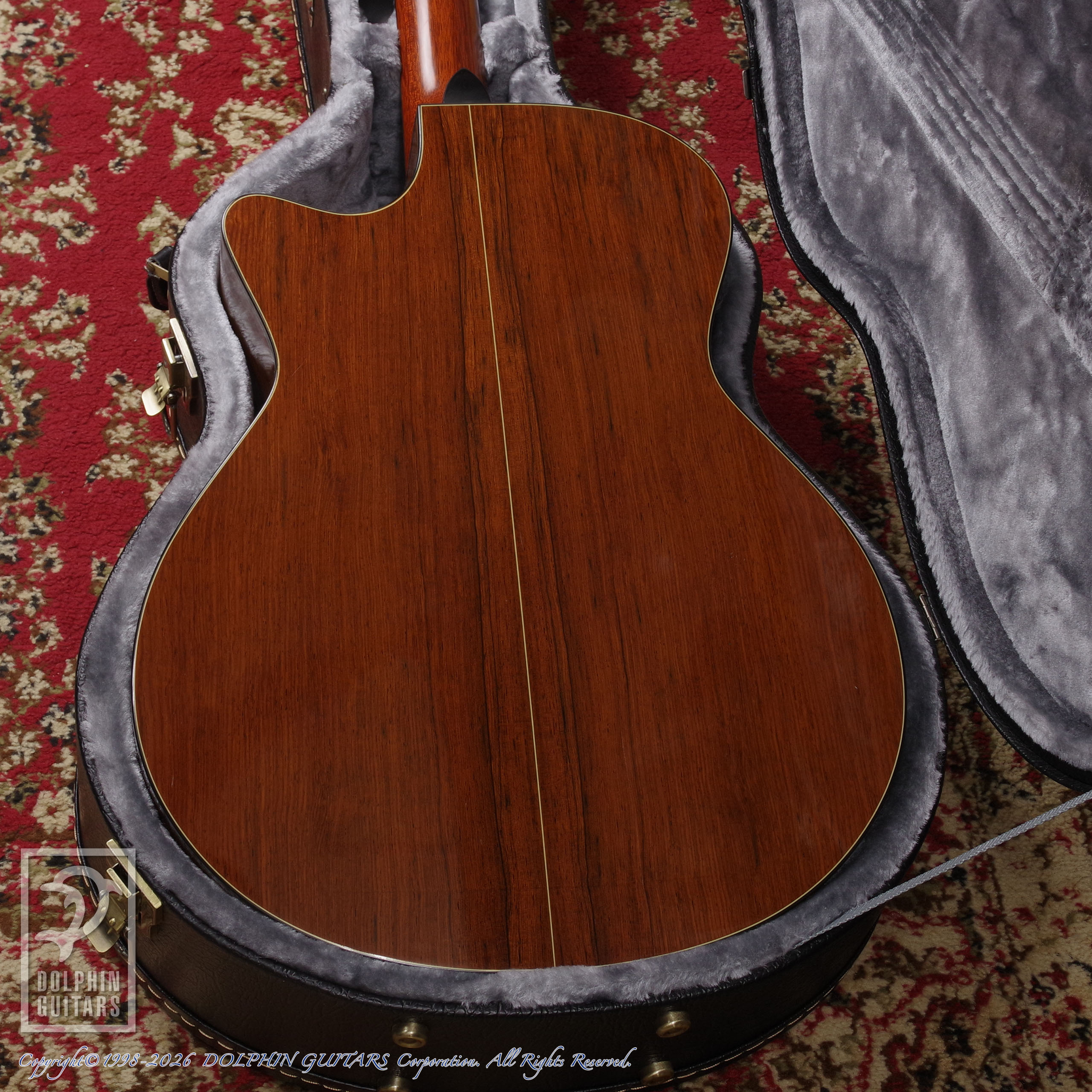 本器はグランドコンサートモデルのカッタウェイ仕様、サイド&バック材にカスタムオプションのマダガスカルローズウッドやフラワー指板インレイを採用したカスタムモデル G23-SGCT FlowerのUSED品。
