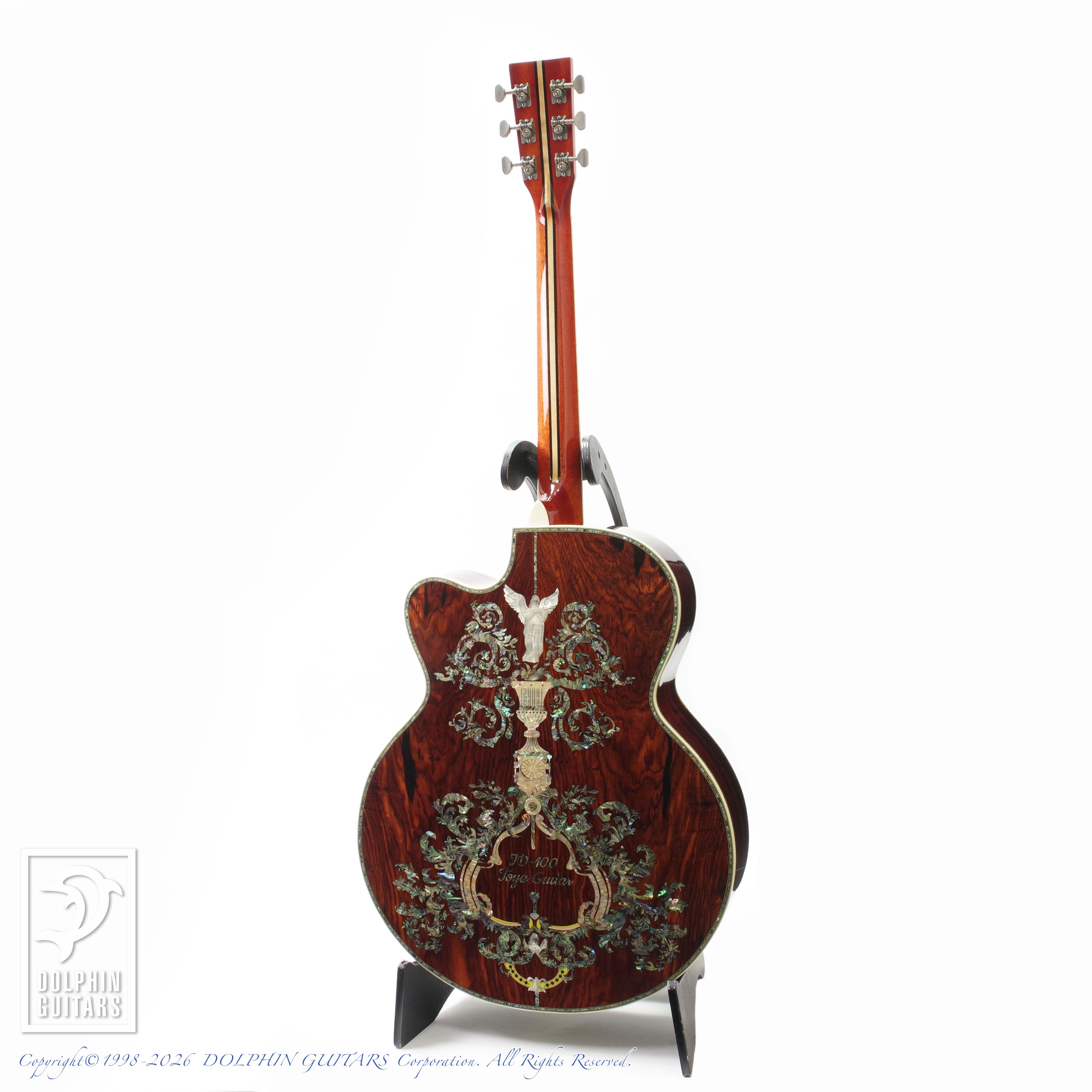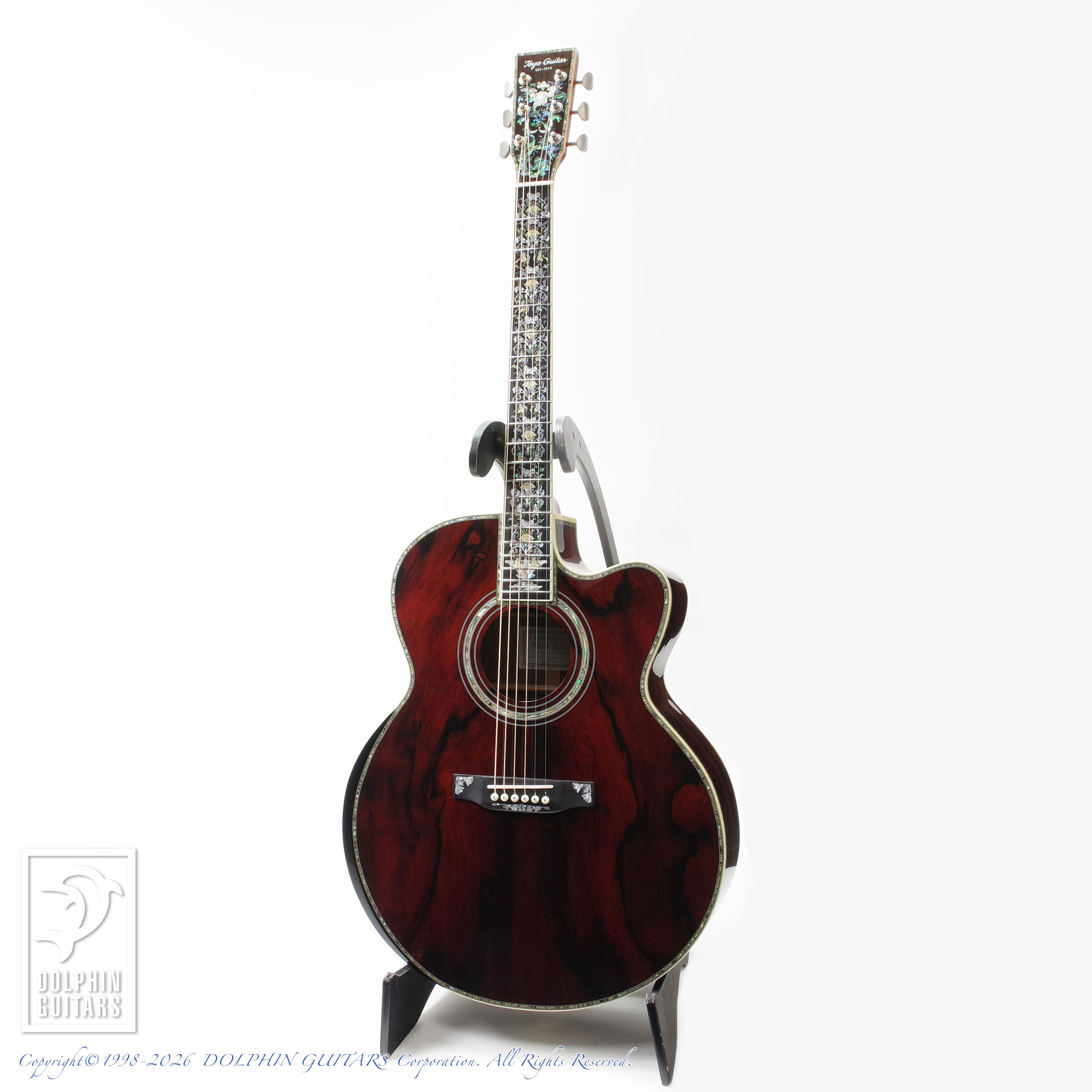 ボディにはダイナミックな木目のココボロ単板を全面に使用。ダークな色合いのココボロボディに施された煌びやかなアバロンインレイが映えるギターです。