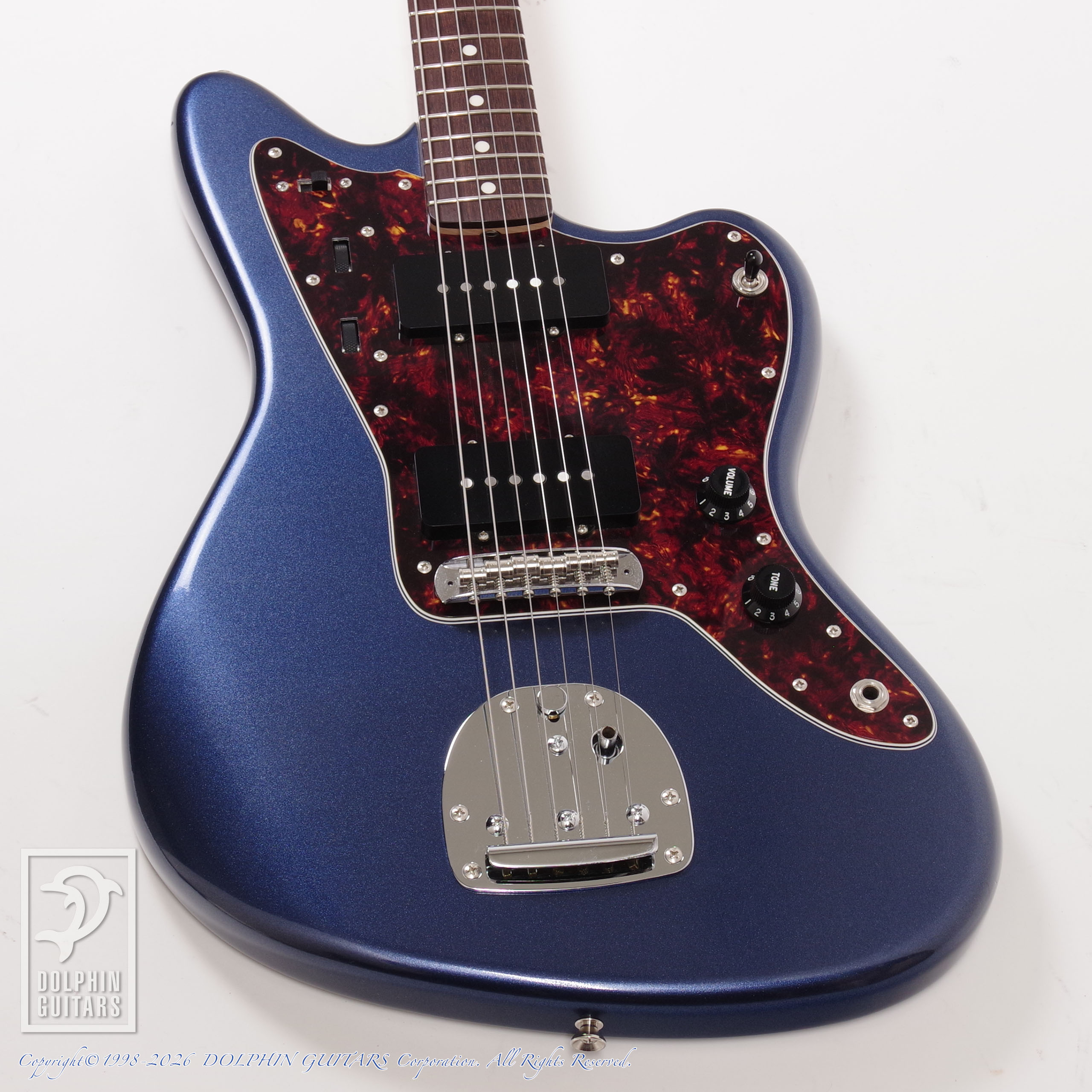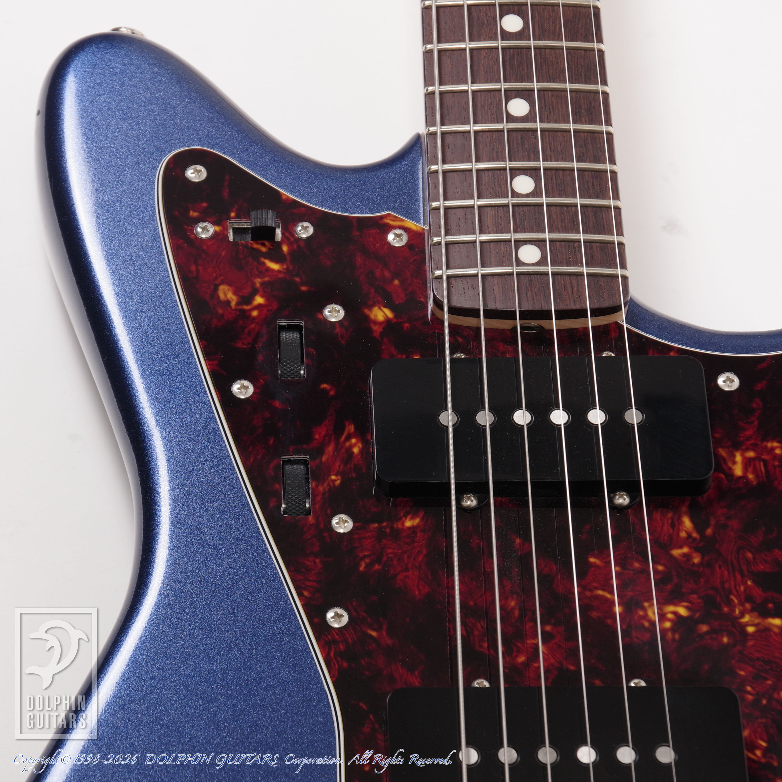 メルセデスブルーのボディにベッコウ柄のピックガードがポップながら落ち着いた雰囲気を演出しております。また、マイナーチェンジ以前のためヘッド形状が現行品とは異なる点も本器の特徴の一つです。