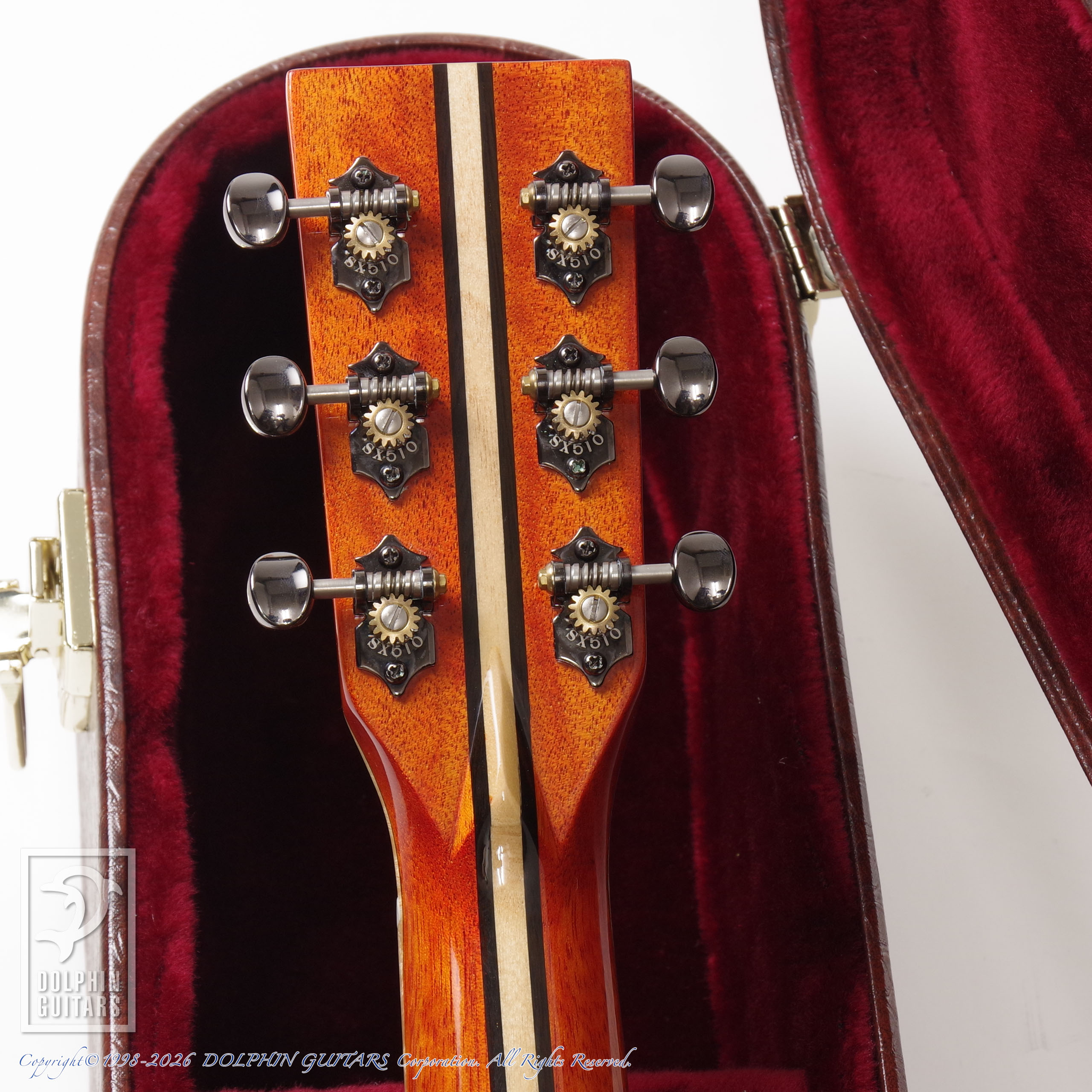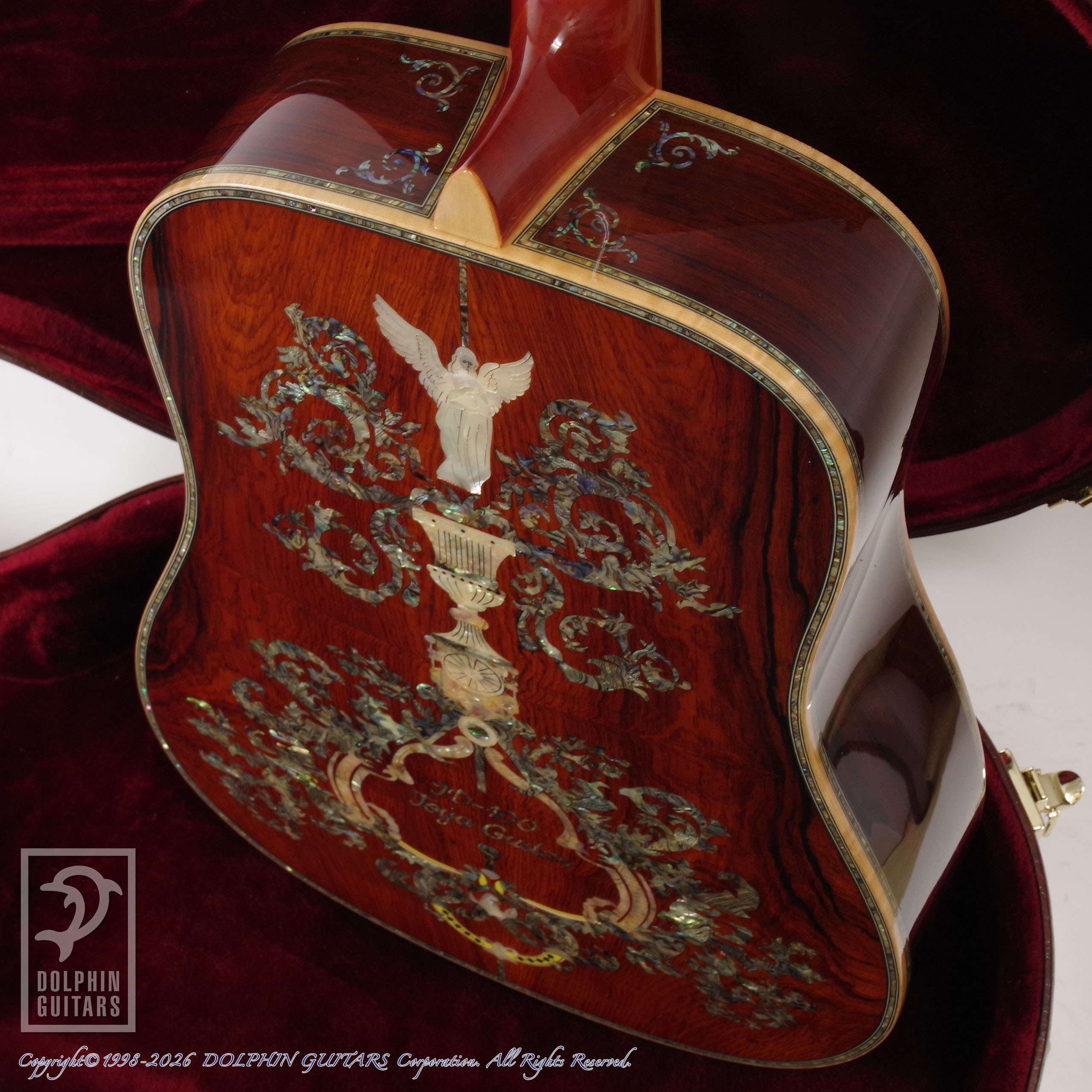 サイド&バックにはダイナミックな木目のココボロ単板を使用。ダークな色合いのココボロボディに施された煌びやかなアバロンインレイが映えるギターです。