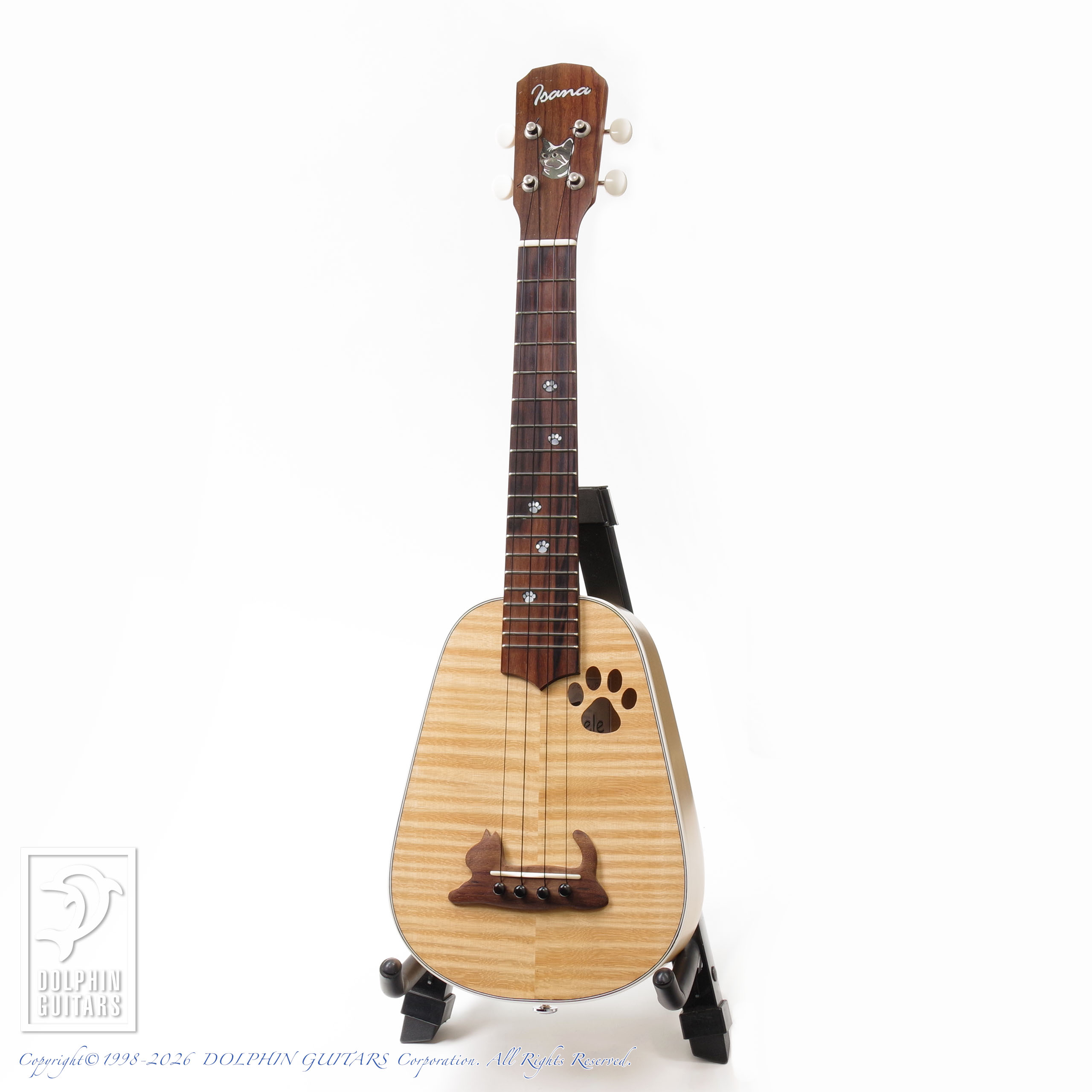 フレイム杢の美しいシカモアをボディ全体に使用し、バインディングもアイボロイドとなっており、明るい色味を基調とし、肉球を模ったサウンドホールや指板インレイに、猫のシルエットのブリッジなど猫好きにはたまらない可愛らしいルックスのウクレレです!
