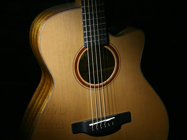 シダートップ、マホガニーサイド&バック、エボニー指板&駒、ラウンド・バック、フォークピンを使わないスルータイプのブリッジ、シルクフラット・フィニッシュ、B-BANDピックアップ搭載。