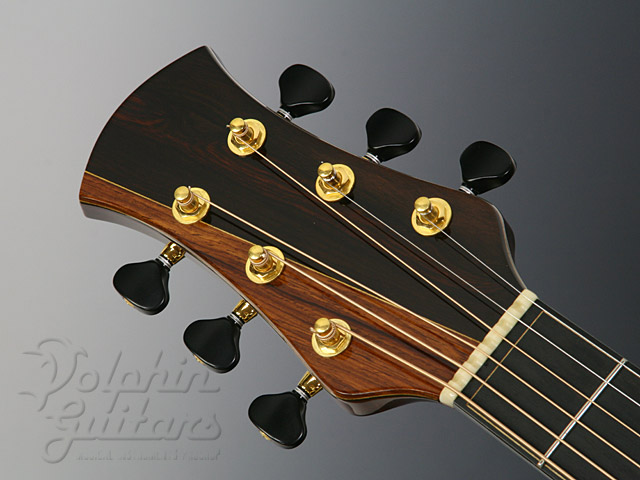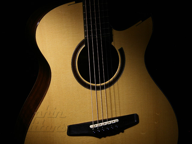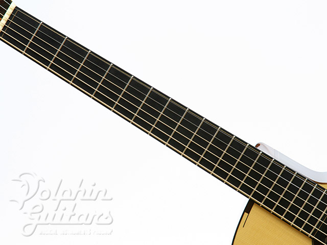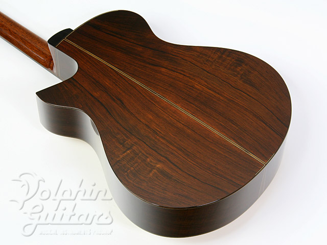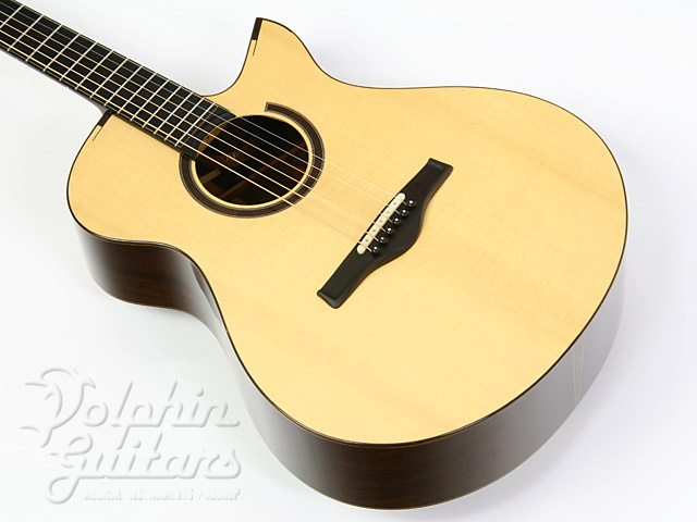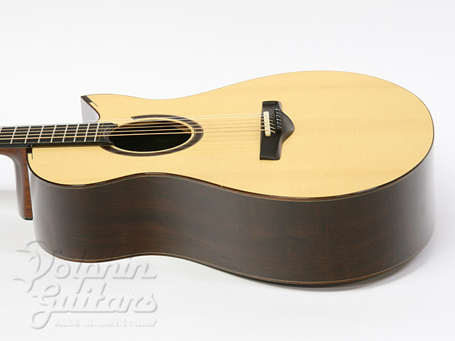 イタリアン・スプルース・トップ、ハイグレードの美しいハカランダ材をサイド&バックに使用、ウッド・バインディング、エボニー指板&駒、ゴトー糸巻き、フレーレンタイン・カッタウェイ、ジョイント部分にはハイポジションでのセーハーを想定してヒール部分の加工が施されております。
