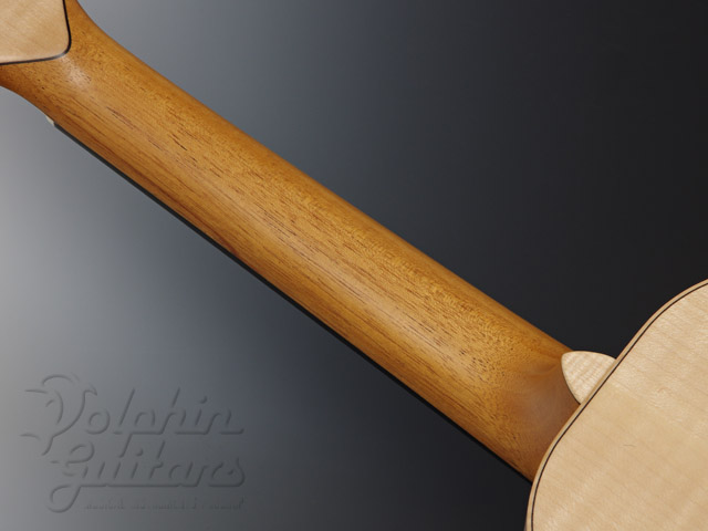 非常に木目の整った美しいスプルーストップとメイプルの組み合わせたボディがとても美しく、こういったコンビネーションには戸田氏独特のセンスが光ります。