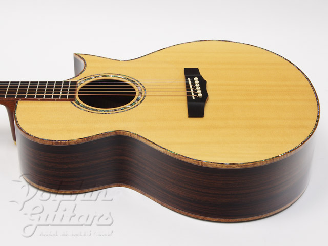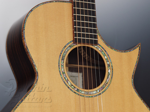 シトカ・スプルース・トップ、インディアンローズウッド・サイド&バック、マホガニー・ネック、エボニー指板&駒、アバロン・ロゼッタ、フローレンタイン・カッタウェイ。