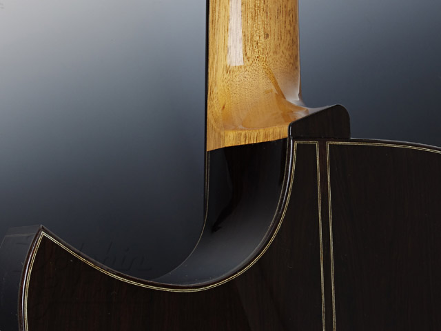 サウンド面のみならず強度面や安定性にも重点を置き、トップ材は部分的に厚みを調整し、ネック内部補強もアジャスタブルロッドに加え、挟むように2本のカーボンファイバーを仕込み、強度面も確保しております。