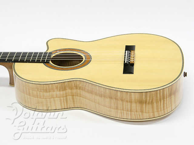 表面にはエゾマツを、そしてサイド&バックには極上の杢目を持つメイプルを使用、ウッドのサウンドホールロゼッタも相まって仕上がりはまるで工芸品のようです。