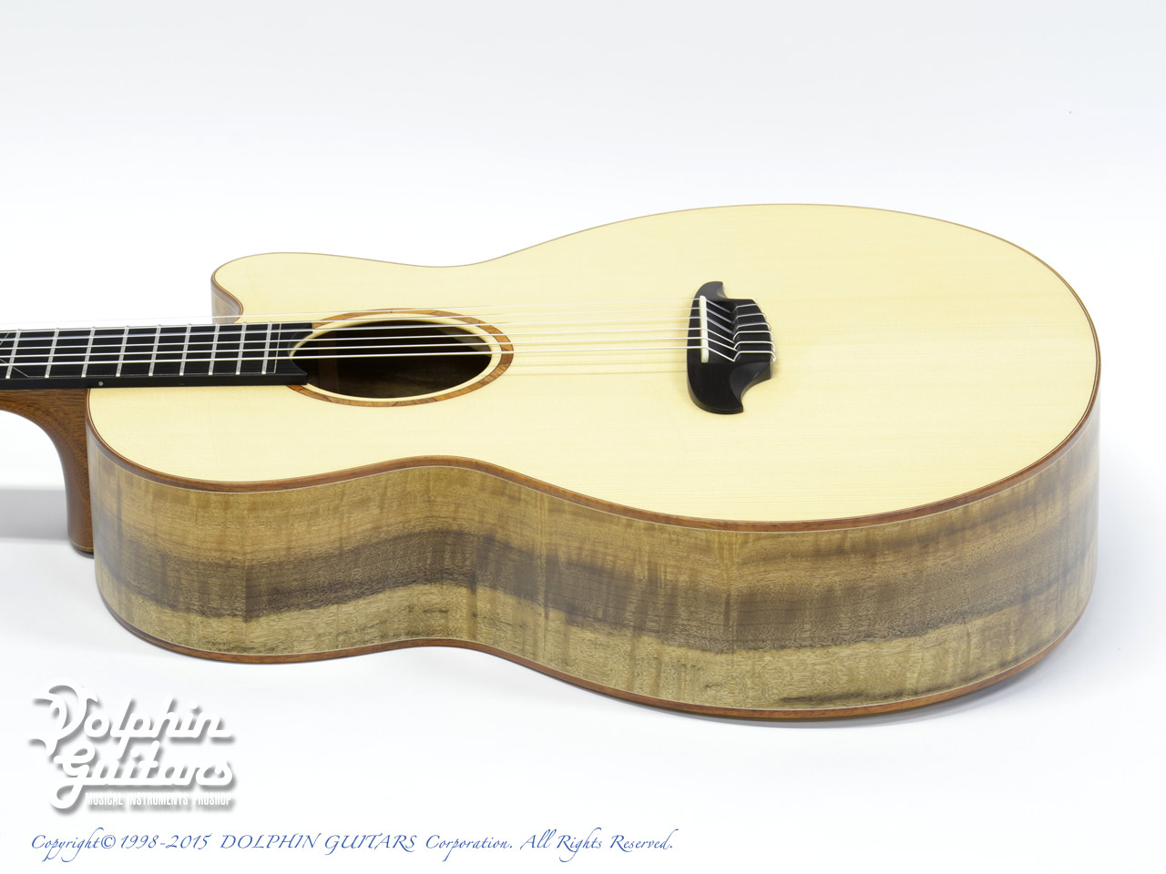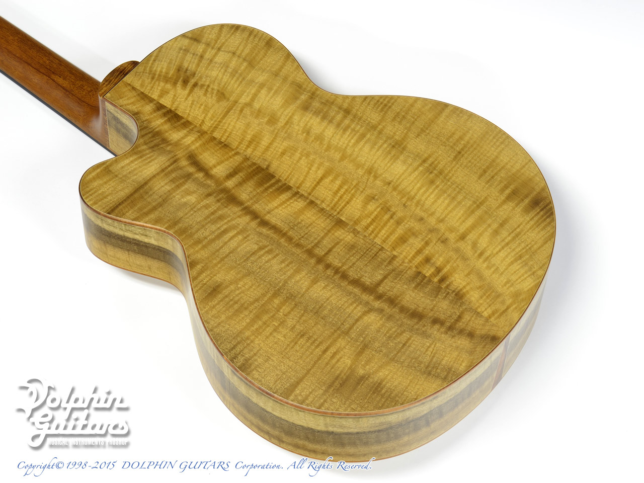 ジャーマン・スプルーストップ、フィギャード・マートルウッドサイド&バック、ホンデュラスマホガニーネック、エボニー指板&ブリッジ、スキャロップドXブレイス、48mmナット幅、647mmスケール、ベネチアンカッタウェイ、コアバインディング&ロゼッタ、オリジナルクリアPG×2、シャートラー製糸巻き仕様。