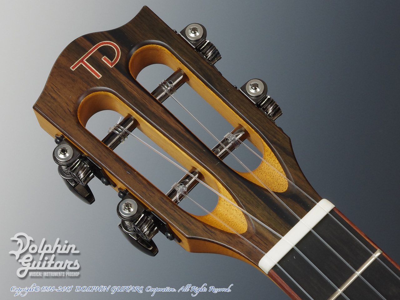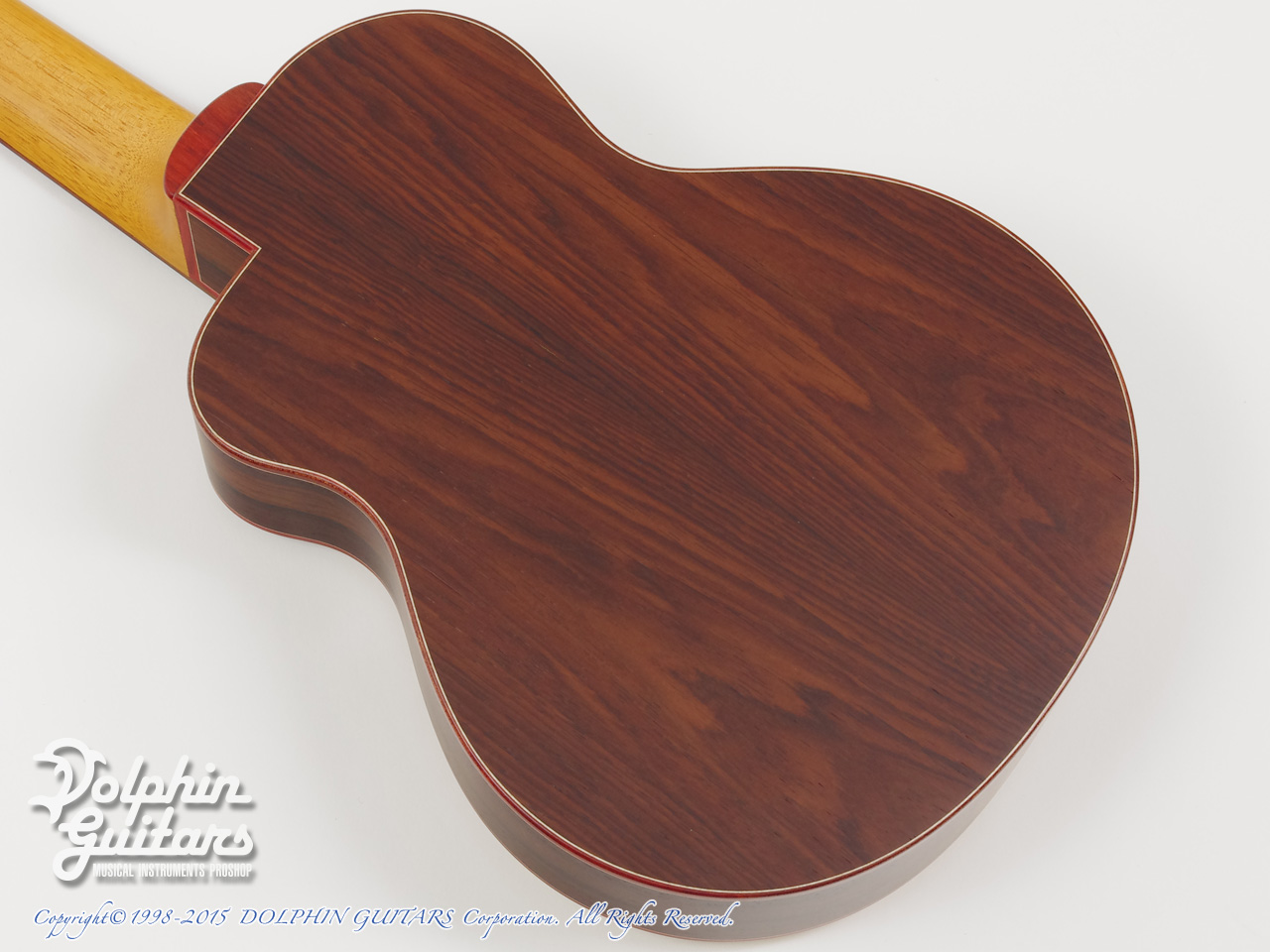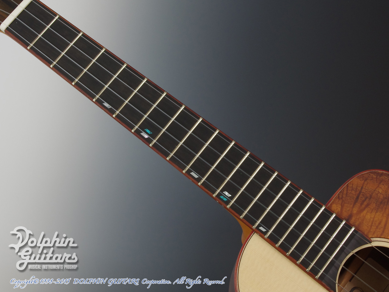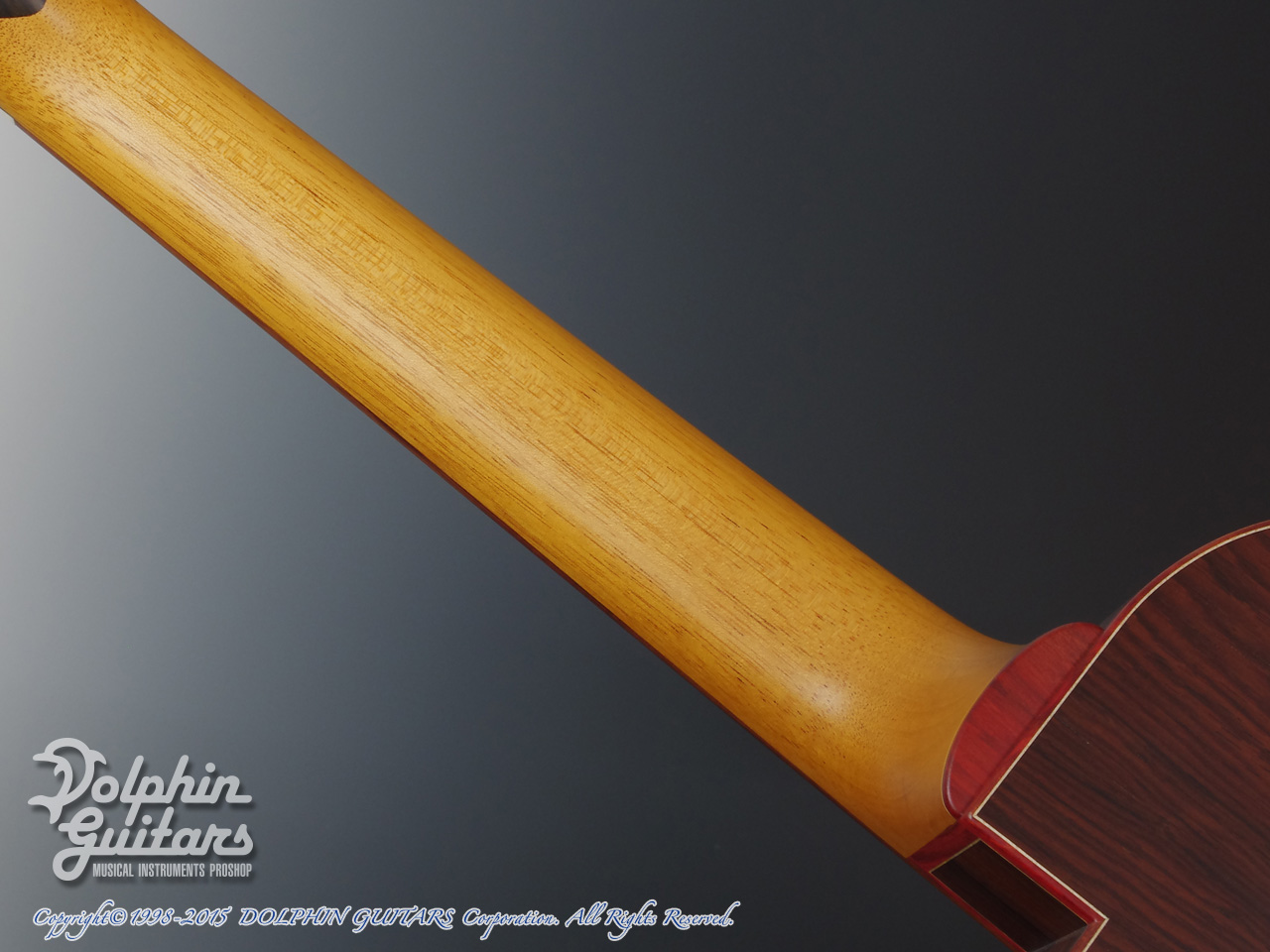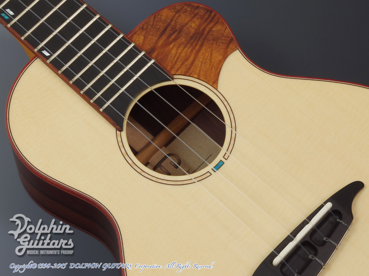 ジャーマン・スプルーストップ、アマゾン・ローズウッドサイド&バック、マホガニー1ピースネック、エボニー指板&駒、チャクテコック・ウッドバインディング、カーリーメイプル&ターコイズ・ロゼッタ、スロッテッドヘッド、ハワイアンコア・ピックガード、カリマンタン・エボニーヘッドプレート、ベネチアン・カッタウェイ、ゴトー製糸巻き仕様。