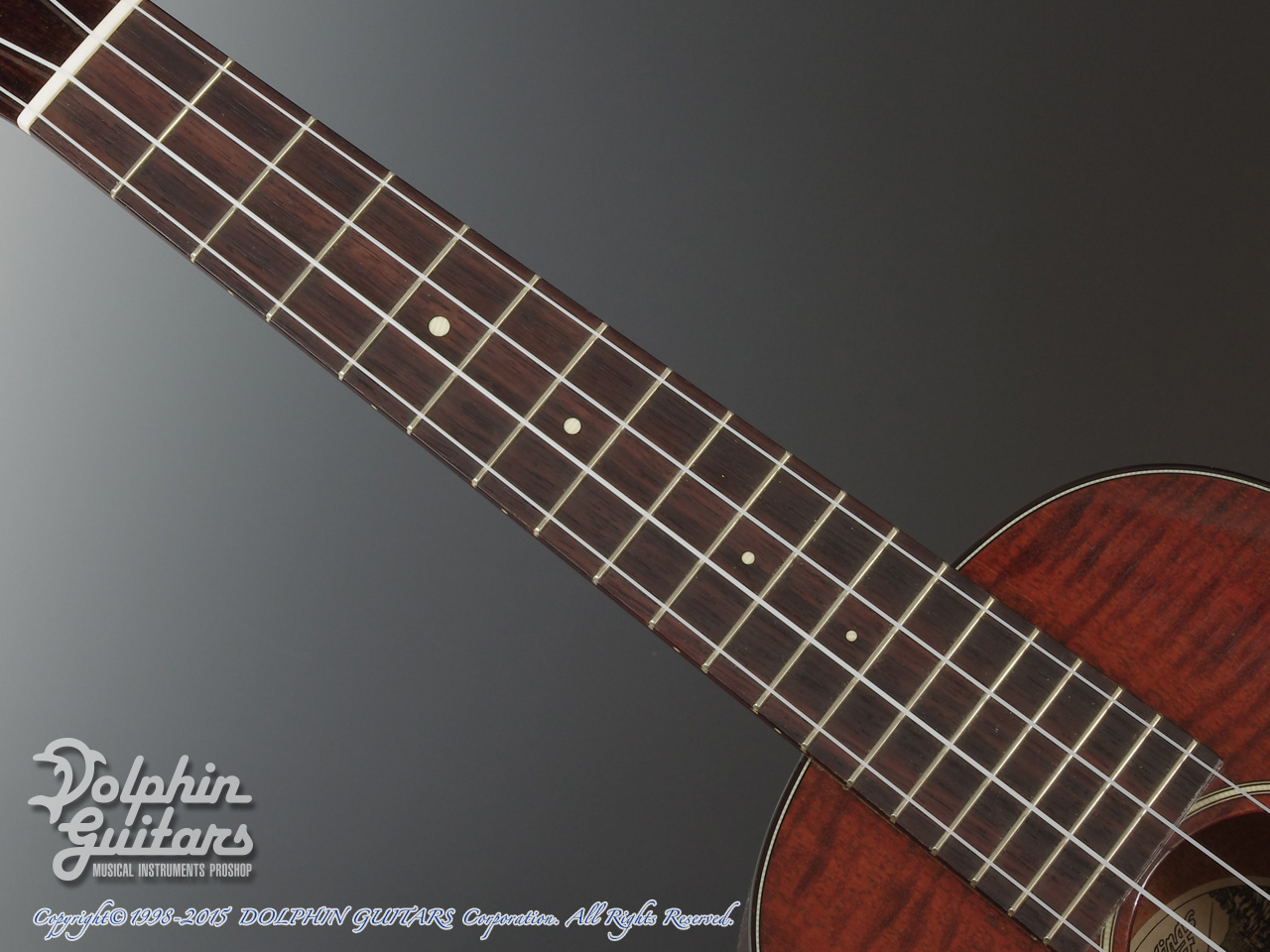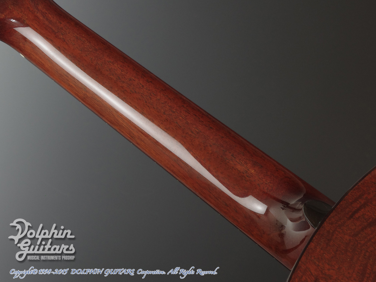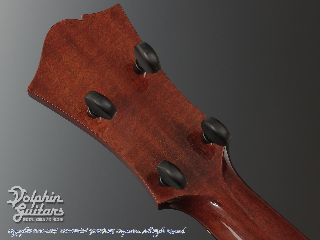 フィギャード・マホガニーボディ、マホガニーネック、ローズウッド指板&ブリッジ、382mmスケール、べっ甲柄バインディング、ニトロセルロース・ラッカーグロスフィニッシュ、一見フリクションペグに思える糸巻きは "pegheds"社製4:1のギアを持つタイプを採用しています。