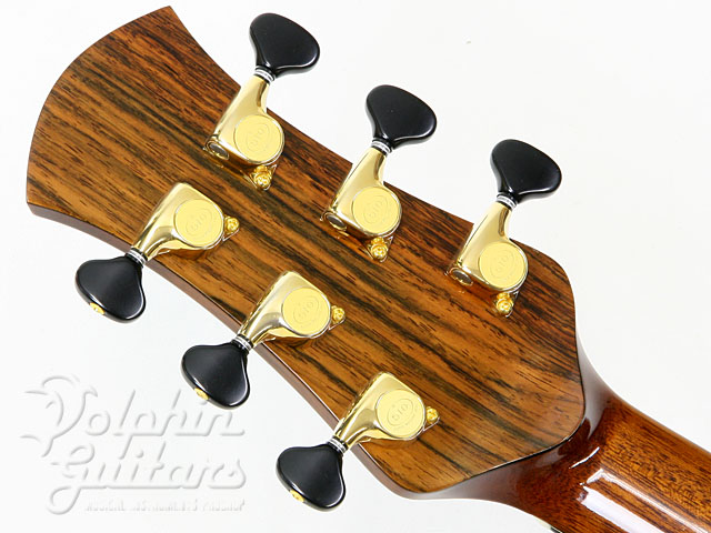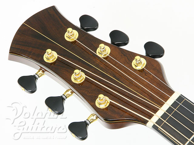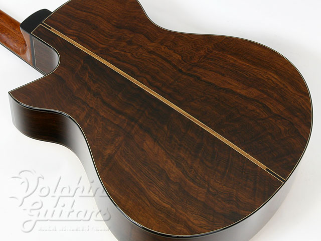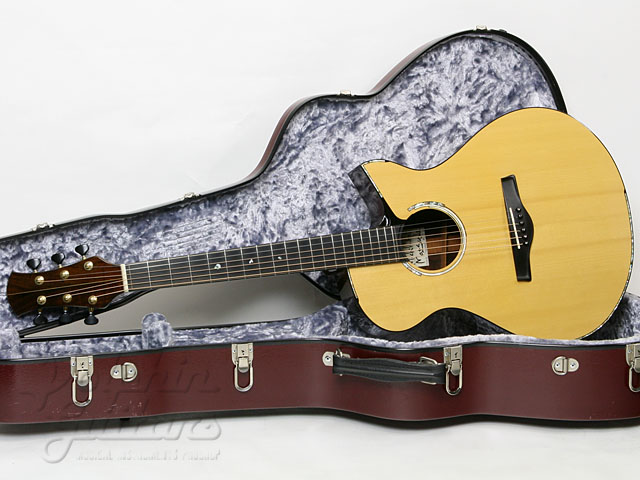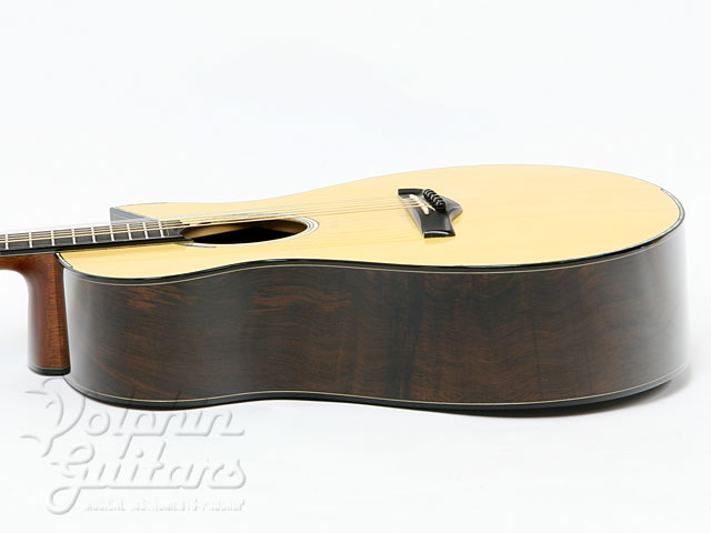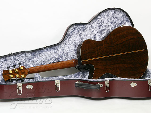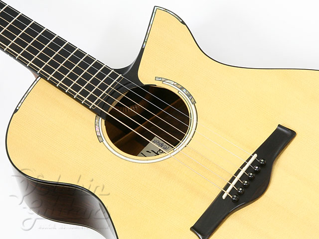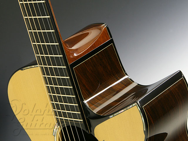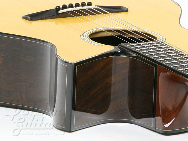 トップには均等な木目を持つ美しいジャーマン・スプルースを、サイド&バックにはワイルドな木目のフィギャードハカランダを使用、マホガニー・ネック、エボニー指板、ハカランダ・ブリッジ、フローレンタイン・カッタウェイ、オリジナル・ウッドロゼッタ。