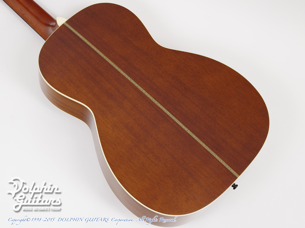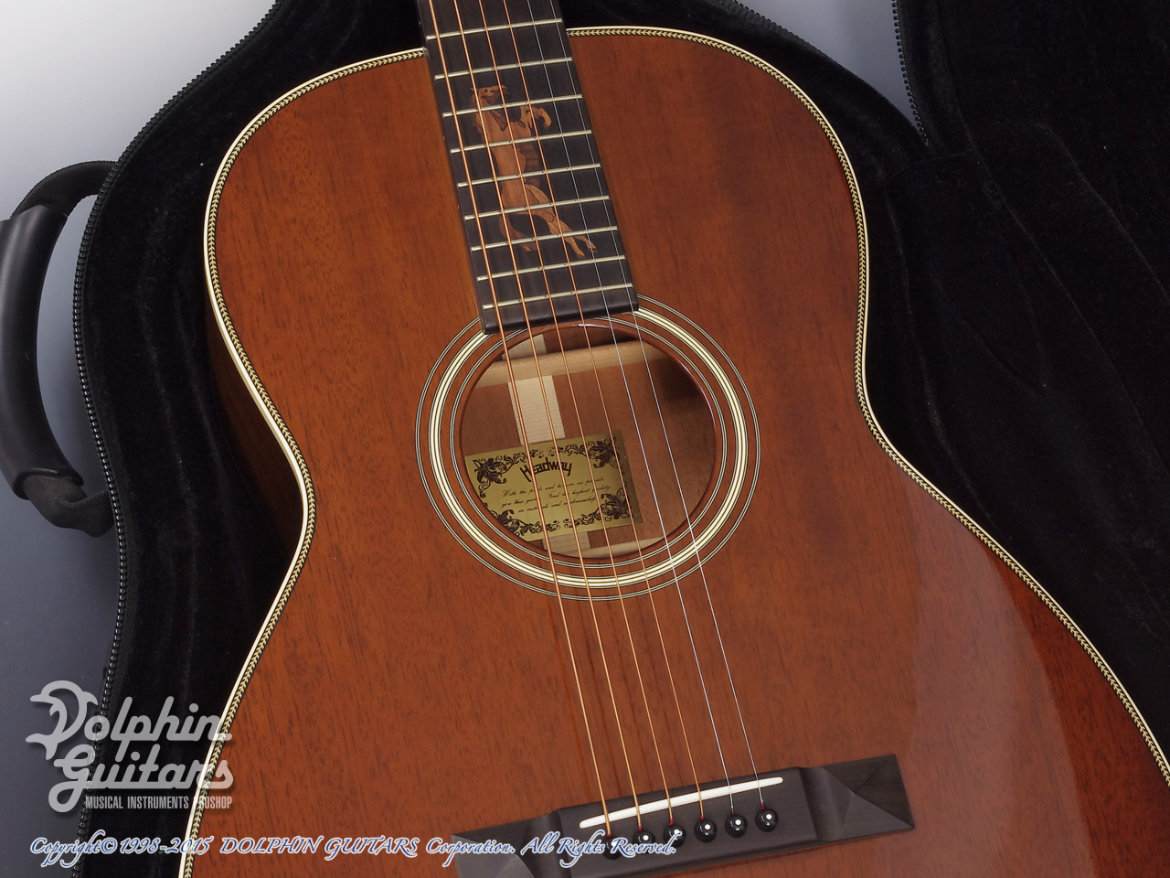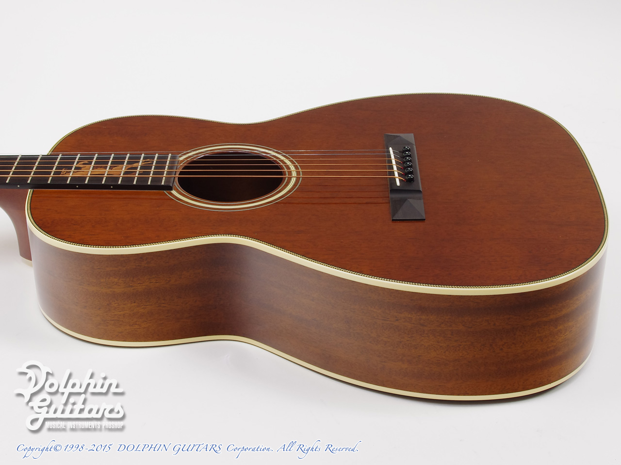 オールマホガニーボディ、マホガニーネック(アジャスタブルロッド)、エボニー指板&ブリッジ、ホースインレイ、ヘリンボーントリム、12Fジョイント、スロテッドヘッド、ゴトー製オープンバック糸巻き仕様。
