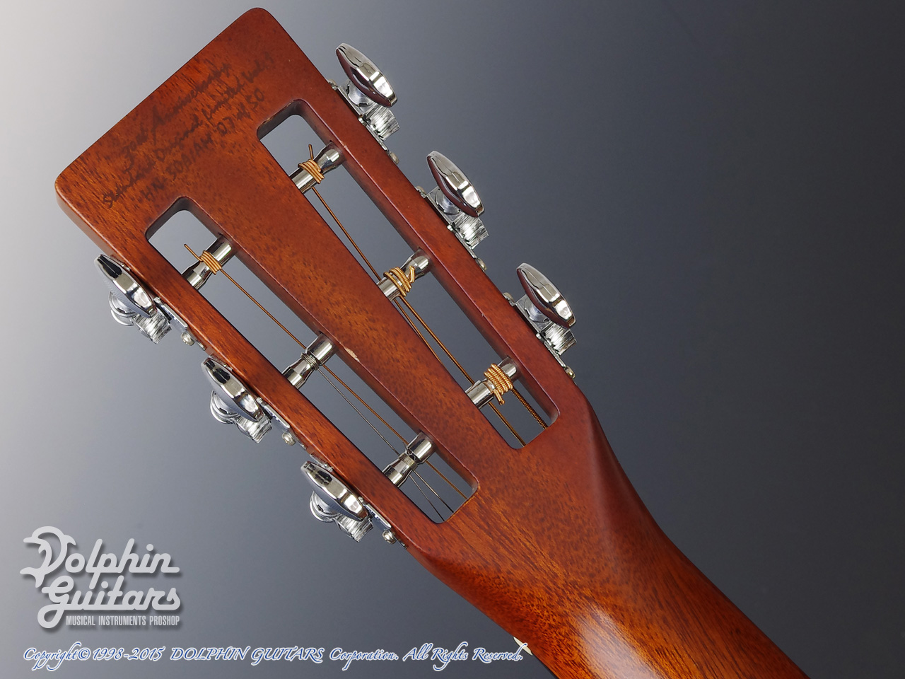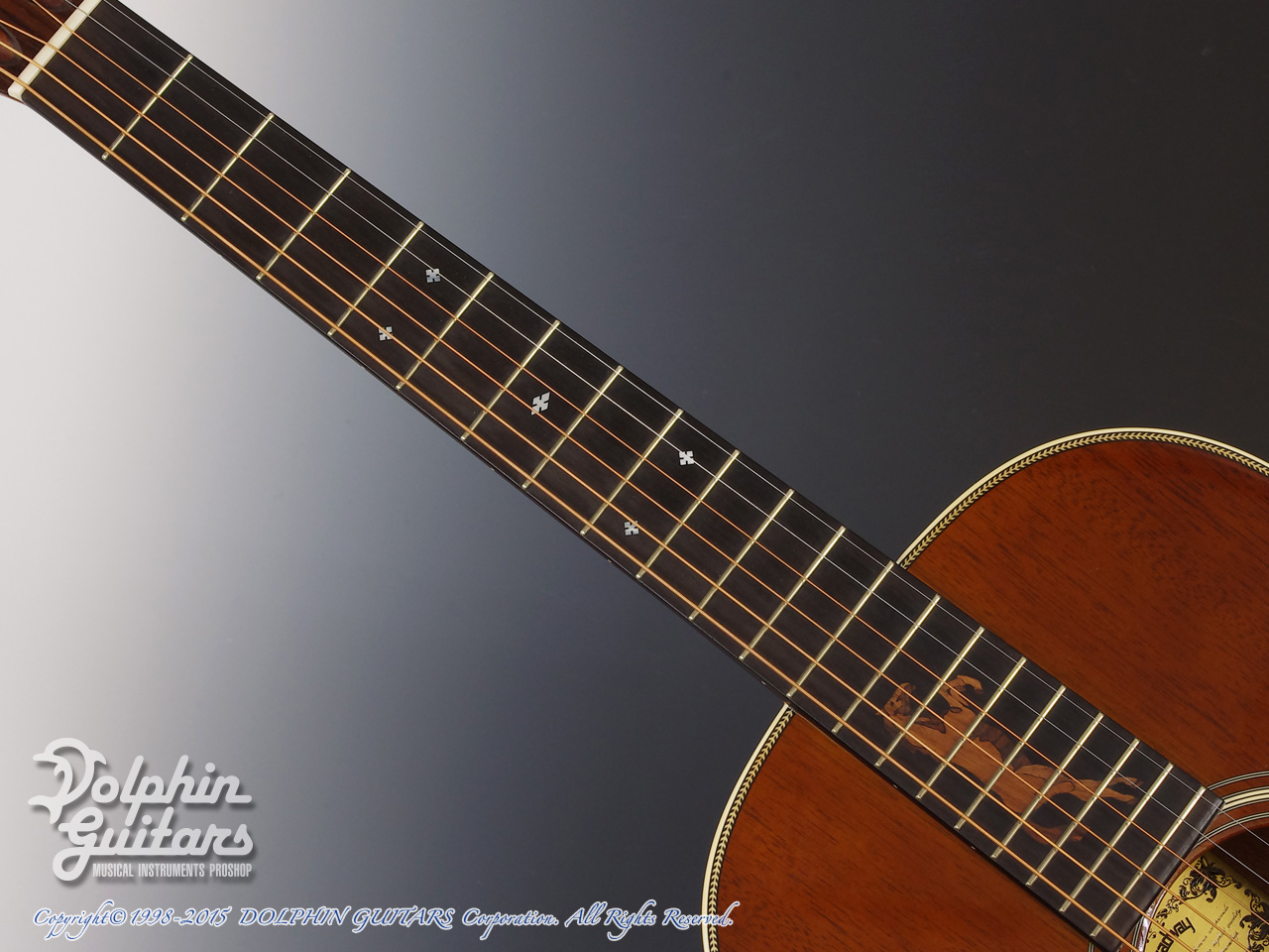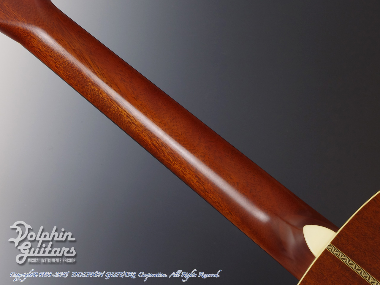 オールマホガニーボディ、マホガニーネック(アジャスタブルロッド)、エボニー指板&ブリッジ、ホースインレイ、ヘリンボーントリム、12Fジョイント、スロテッドヘッド、ゴトー製オープンバック糸巻き仕様。