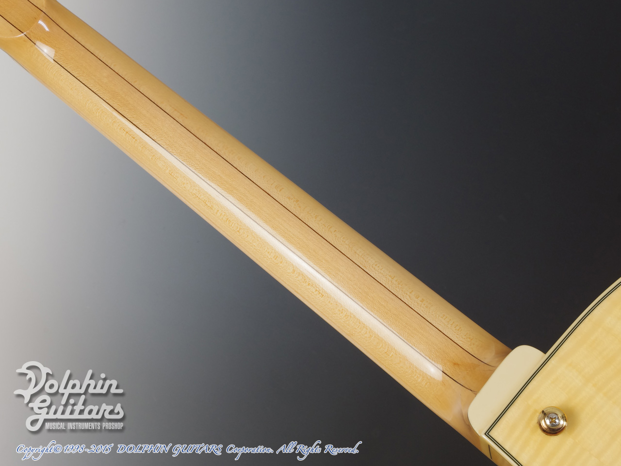 フレイム・メイプルボディ、メイプルネック、ローズ指板&ブリッジ&サドル、メイプルPG、ウッドノブ、オリジナル2ハムPU、42mmナット幅、628mmスケール、ロトマティック糸巻き仕様。