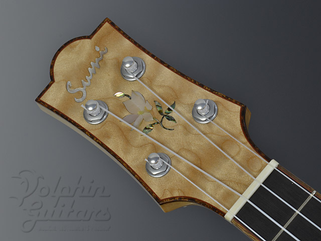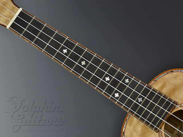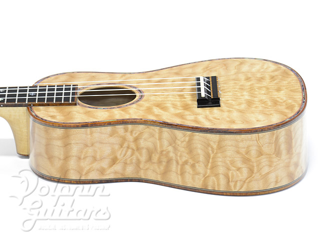鱗のような杢目が輝くキルテッドメイプルと、アバロントリム+コアバインディングで飾ったとても美しいウクレレ。どれも天然の輝きなので、上品にまとまっています。