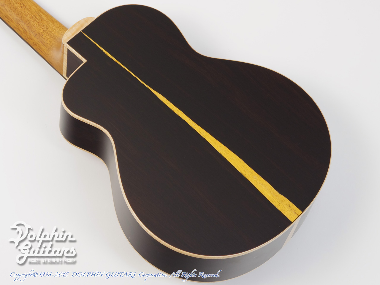 トップにはマスターグレードのコア材を、サイド&バックにはサップの入ったアフリカン・ブラックウッド、ホンデュラン・マホガニー1ピース・ネック、エボニー指板&駒、カッタウェイ、パール・ロゼッタ、パール&ターコイズ・ポジション・マーク、サイド・サウンド・ホール、アフリカン・ブラックウッド・ピックガード、スロテッド・ヘッド、ステルス・チューナ。