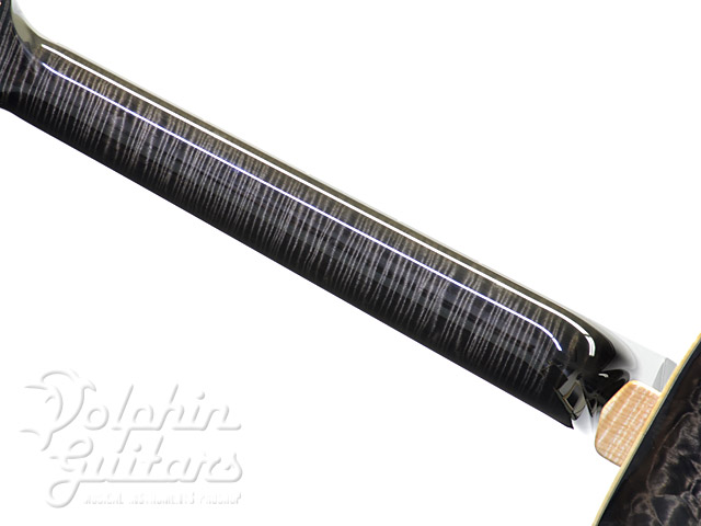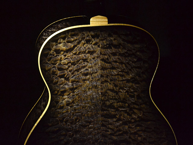 繊細なアバロンの飾りが美しいのですが、バックから見るメイプルのアーティスティックな杢は誰もがうっとり魅せられることでしょう。Espresso with "micro-bursts"と銘打たれた独特のフィニッシュが深みを生んでおります。