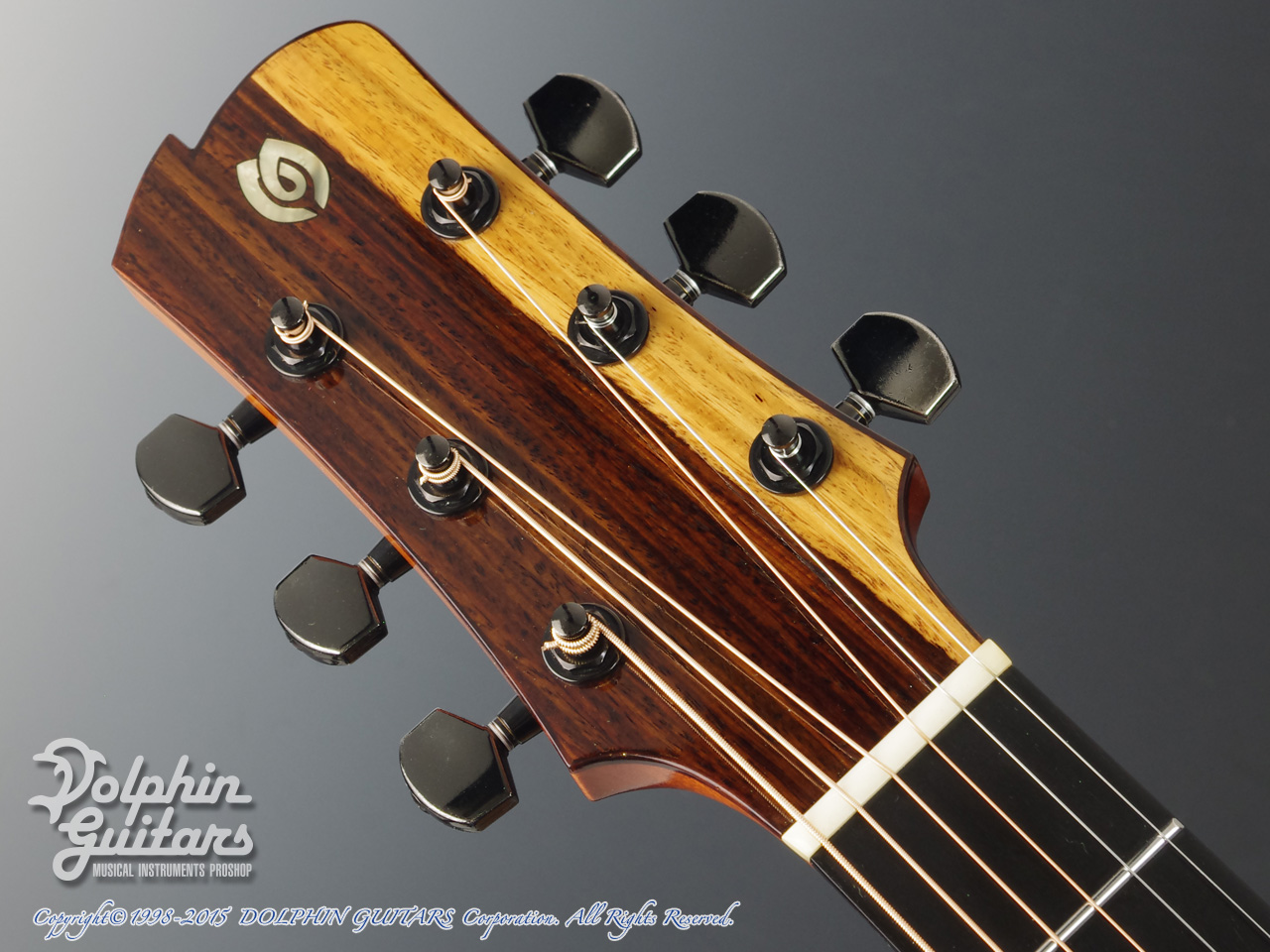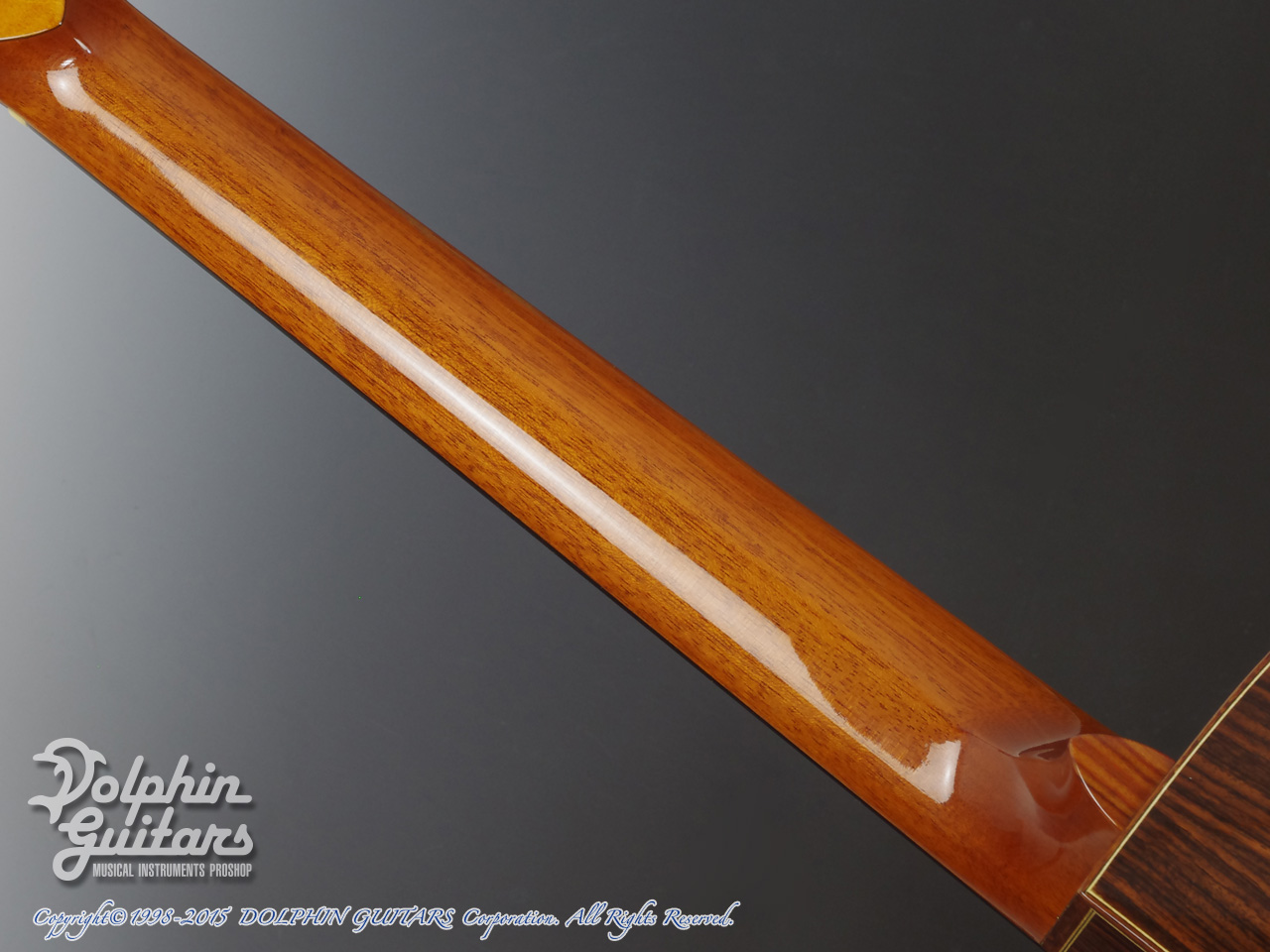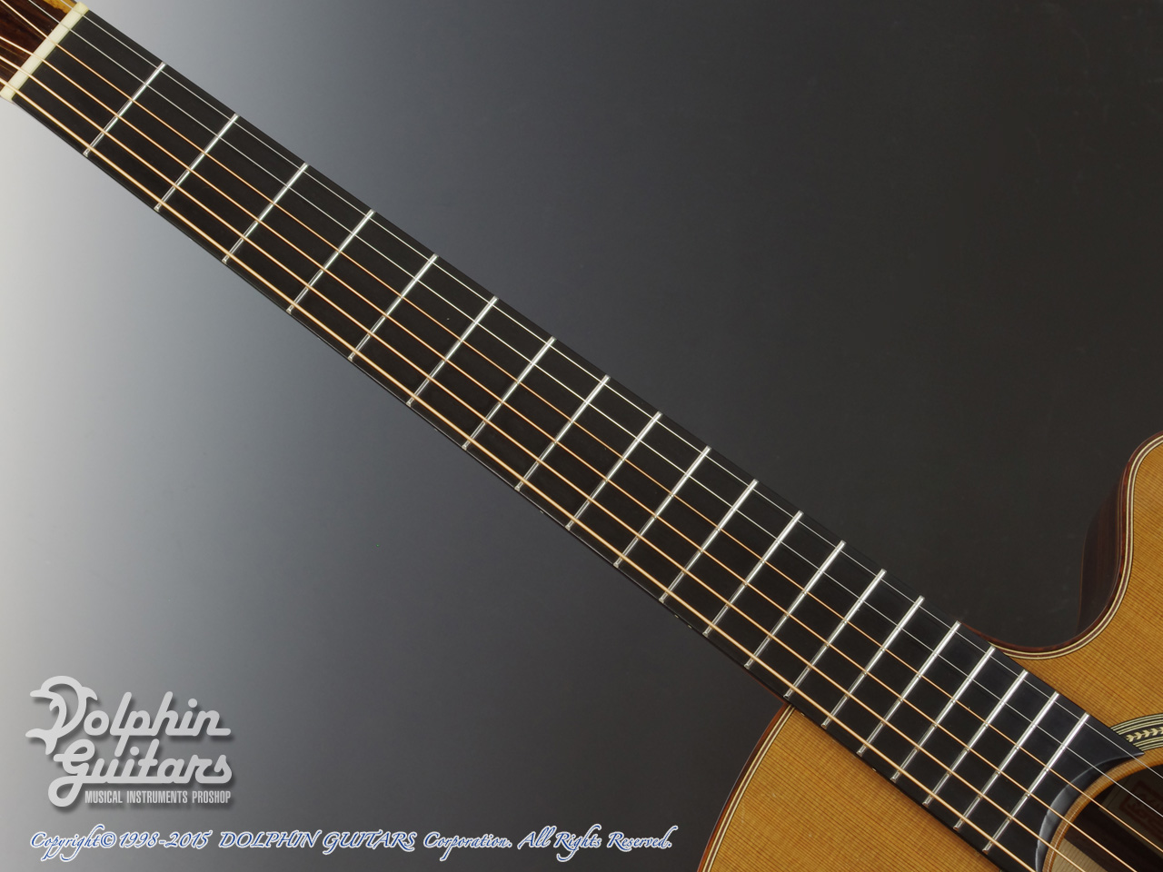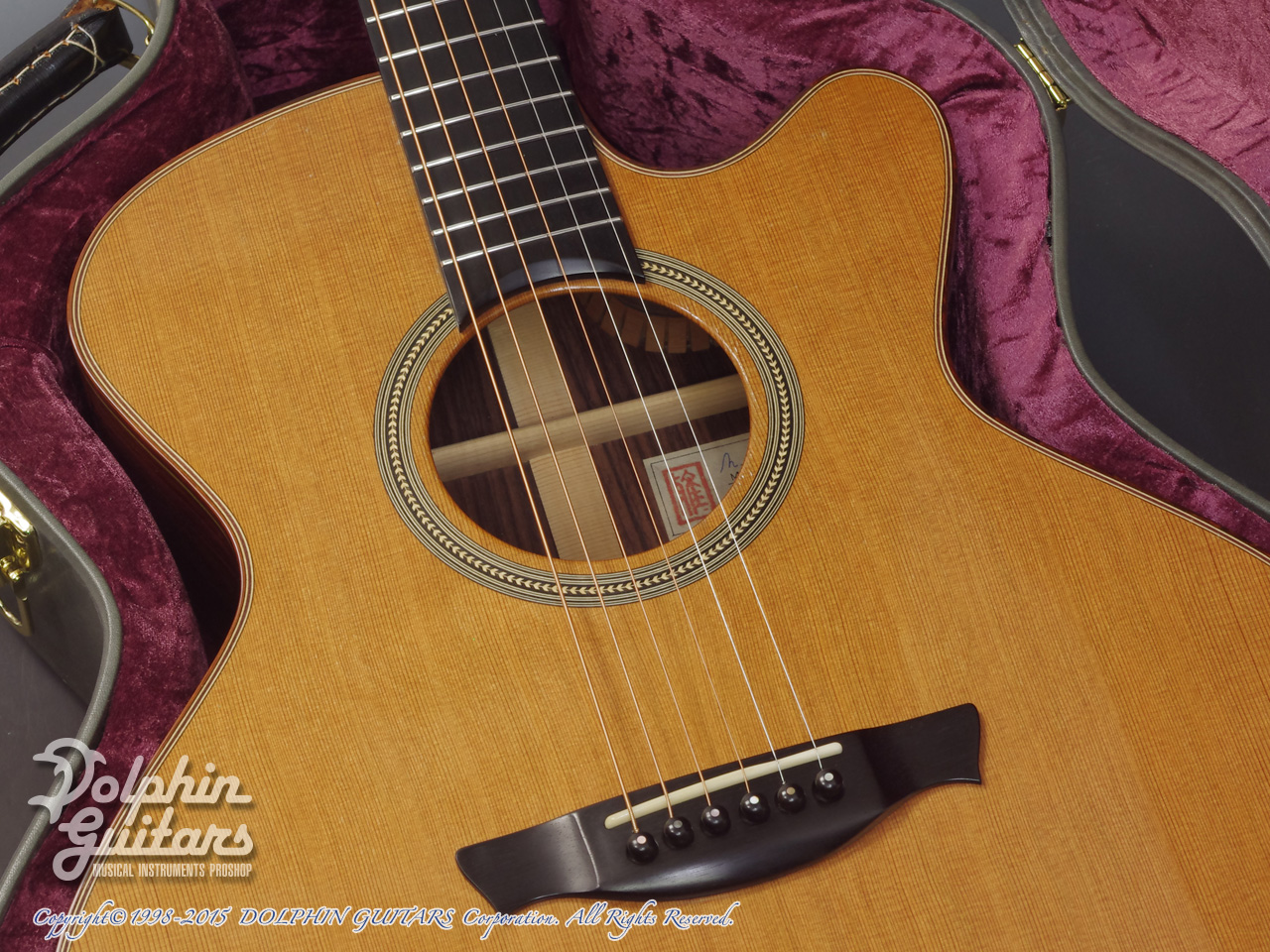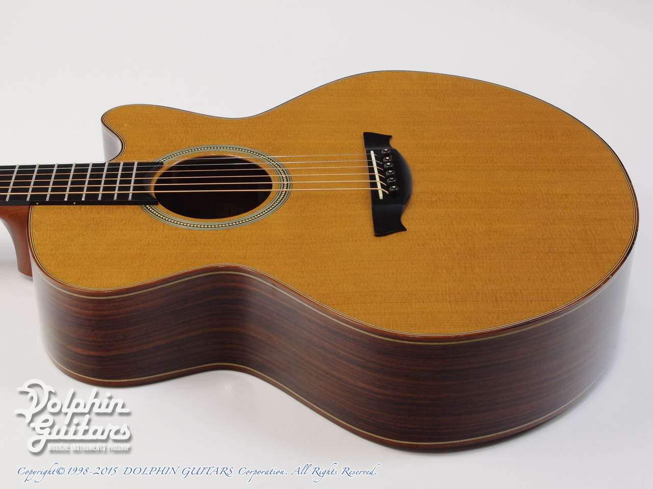 大分県の個人製作家日高 雅樹作。 愛媛県のシーガル弦楽器工房を経て独立し、現在は年間2〜4本ほどの製作本数のため、市場ではあまりお目にかかれない製作家の一人。 現在はわずかながらオリジナル・シェイプのギターを中心にトラディショナルなスタイルや、他にも様々なタイプのモデルも製作をしています。 本器は2005年製作、16インチ・ボディのMJ CutawayのUSED品。 シダートップ、インディアン・ローズウッドS&B、マホガニーネック、エボニー指板&ブリッジ、カッタウェイ、アンフィニーカスタムワークス製コンタクト・ピエゾPU搭載(後付け)。 豪快で見事な鳴りと豊かなボリュームを放つ素晴らしいサウンドの個体です。シダートップならではのダークさとキレのあるサウンドが非常に印象的です。 アンフィニカスタムワークス製コンタクト・ピエゾが搭載されており、ライン出力でも原音に近いサウンドを出力することができますので、特にフィンガースタイル・ソロギター用としてオススメです。 またステレオ出力にも対応してますので、マグネット・ピックアップを増設することでステレオアウトにすることも可能です。 コンディションとしてはボディ全体に細かなウェザーチェックが入っている程度で、目立つキズもなく安定感抜群のUSED品。ネックはストレート、ナット・サドル・フレット等の消耗パーツ類も交換し、セットアップも万全ですので、様々なシーンで即戦力としてお使い頂けます。ハードケース付属。