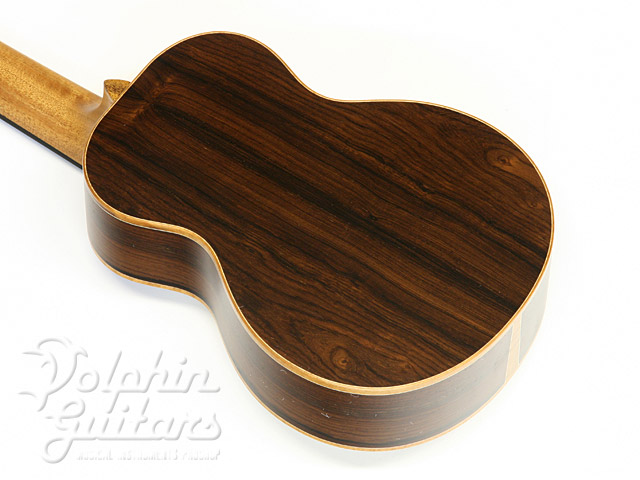 非常に木目の整った美しいスプルーストップとエキゾチックなアマゾンローズの組み合わせたボディがとても美しく、こういったコンビネーションには戸田氏独特のセンスが光ります。