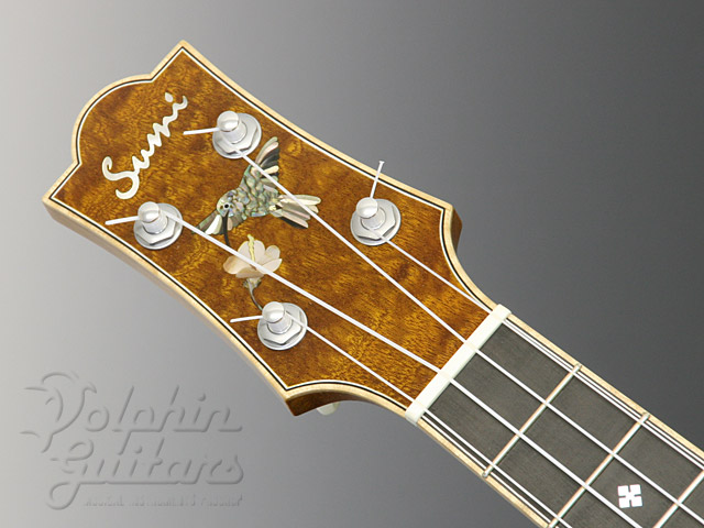本器はキルテッド・サペリ・ボディ、ヘッドにハチドリのインレイをあしらったコンサートウクレレ、S-UKCQS (ハチドリ)。
