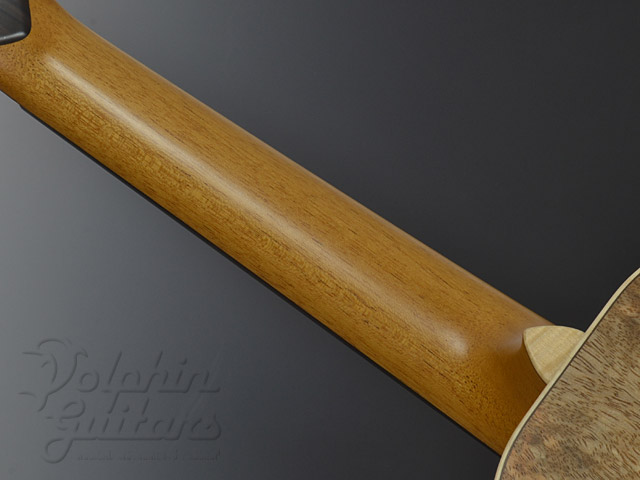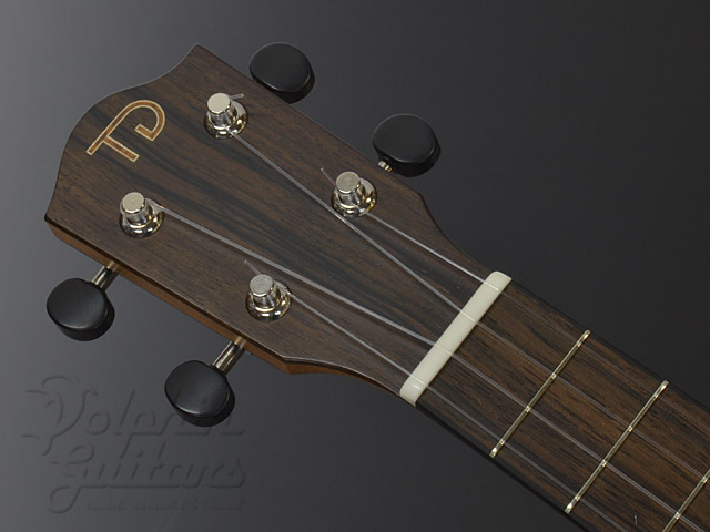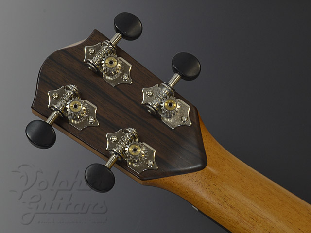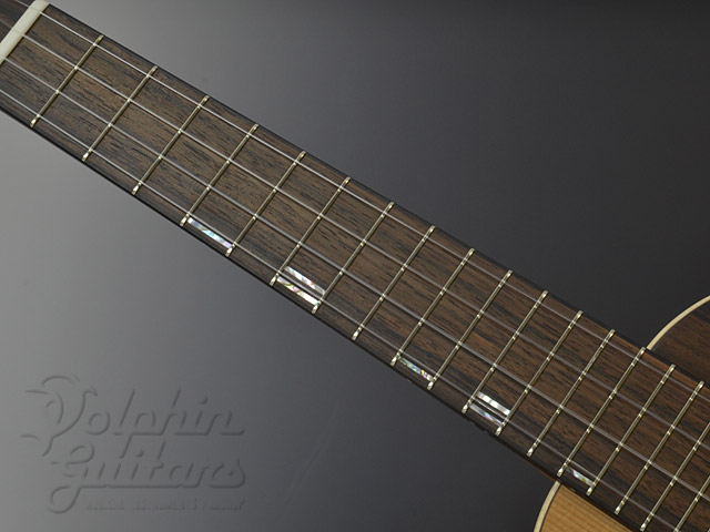 シダー・トップ、マンゴー・サイド&バック、ホンジュラスマホガニーネック、エボニー指板、駒&ピックガード、カーリーメイプルとアバロンのロゼッタがシンプルながらアクセントになっています。