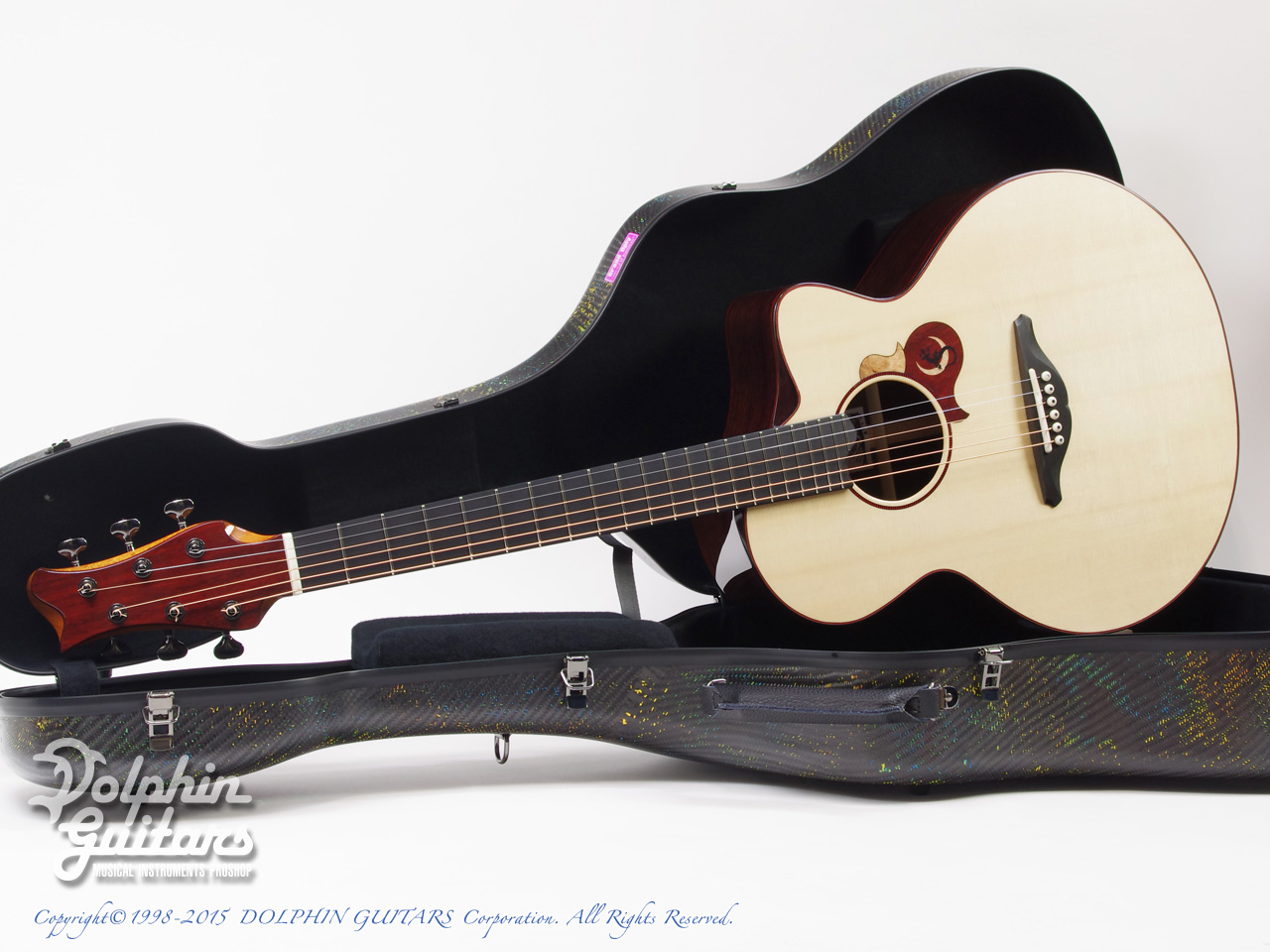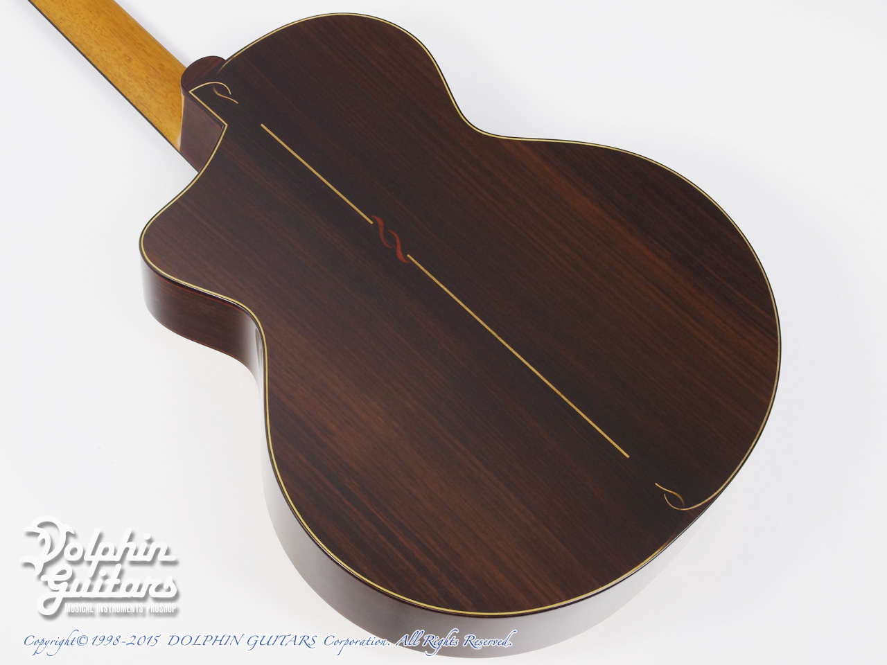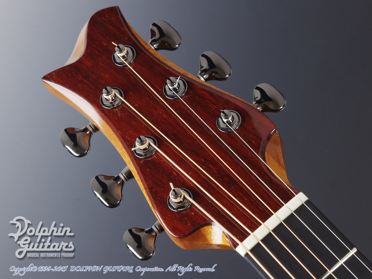 ジャーマン・スプルーストップ、インディアン・ローズウッドS&B、マホガニーネック、エボニー指板&ブリッジ、ヒールレス・ネックジョイント、ベータチタニュウム製のトラスロッド、べヴェルド・カッタウェイ、スポルテッド・メイプル×パドックによるビルトイン・ピックガード。