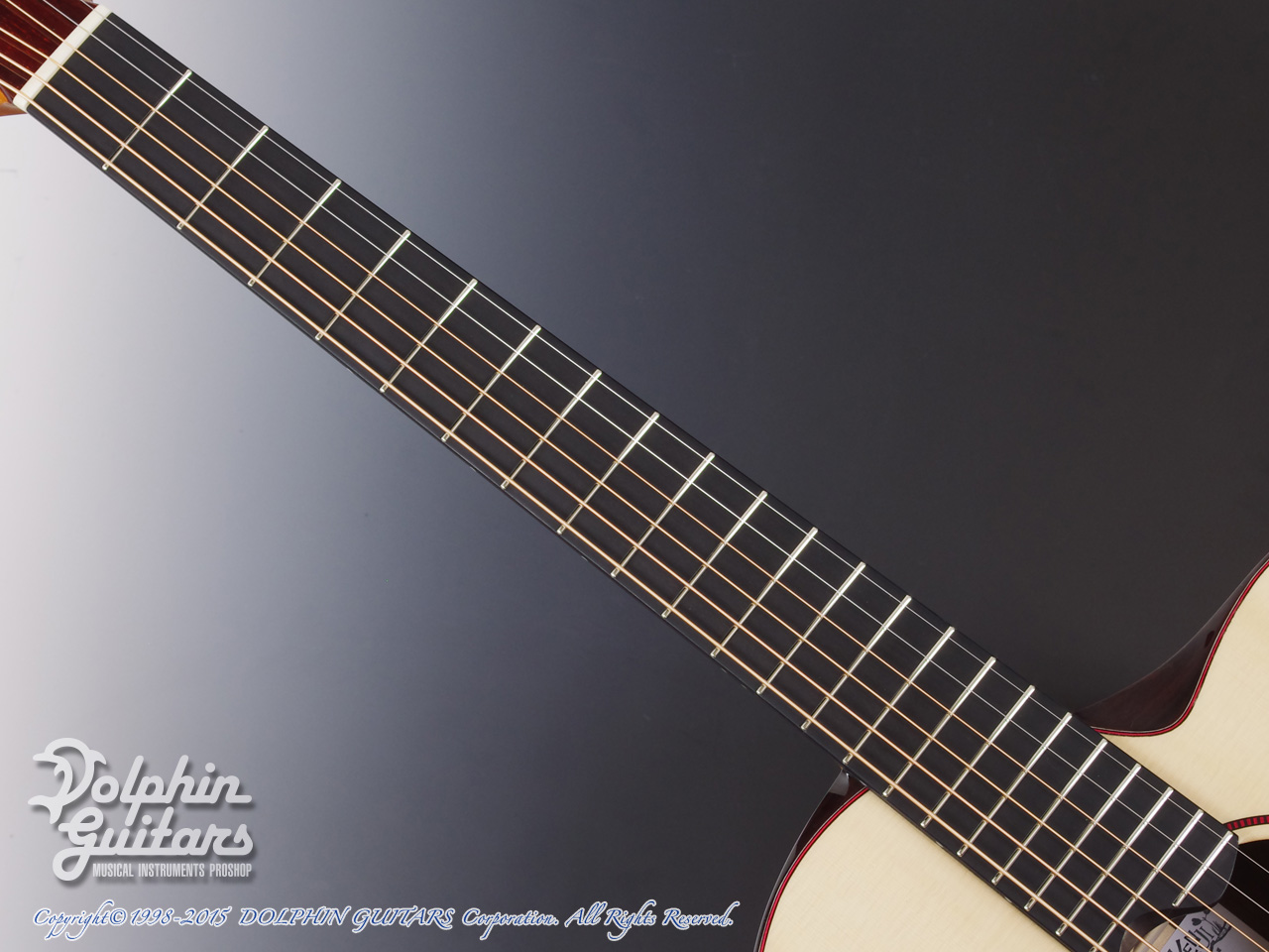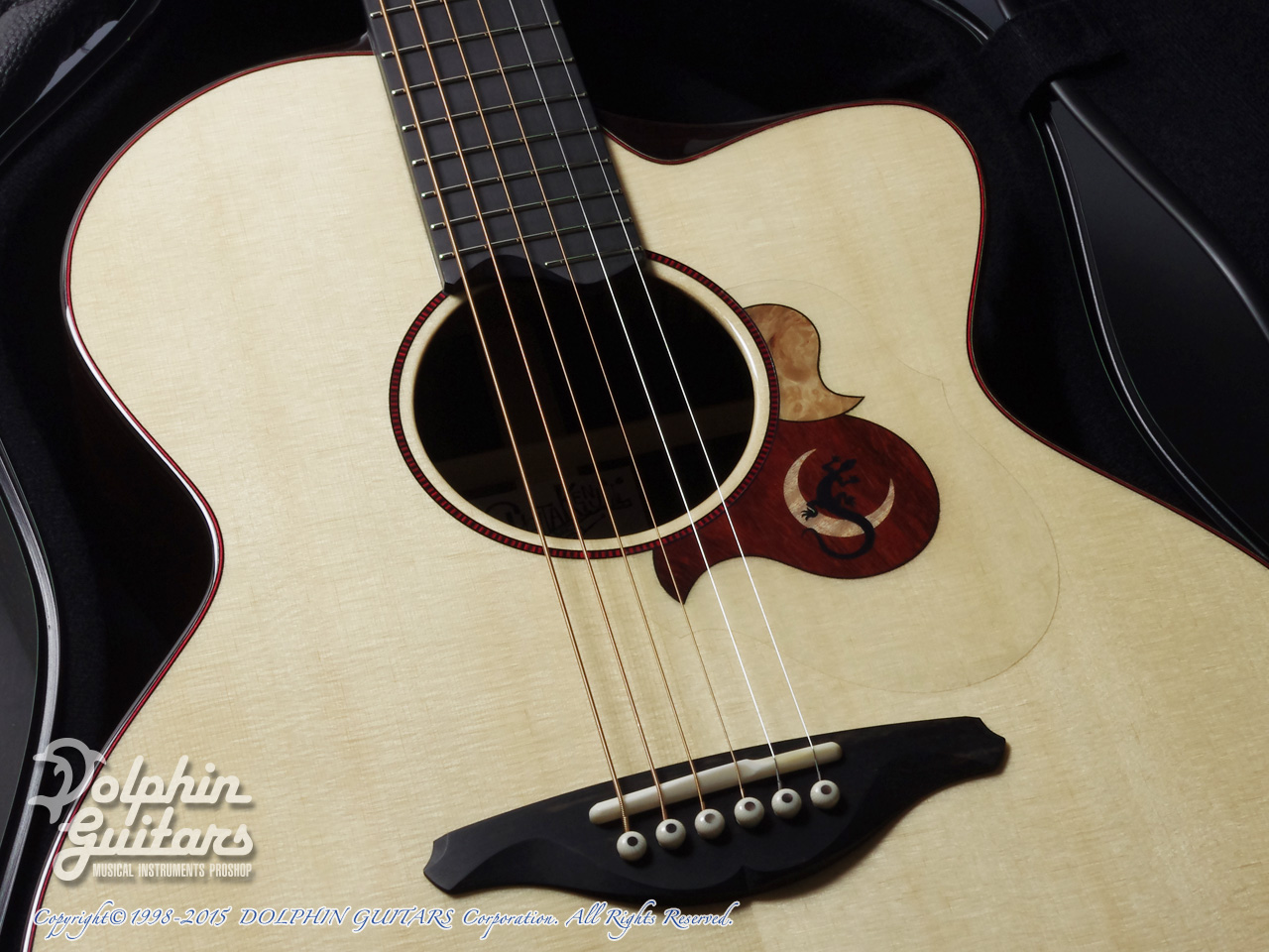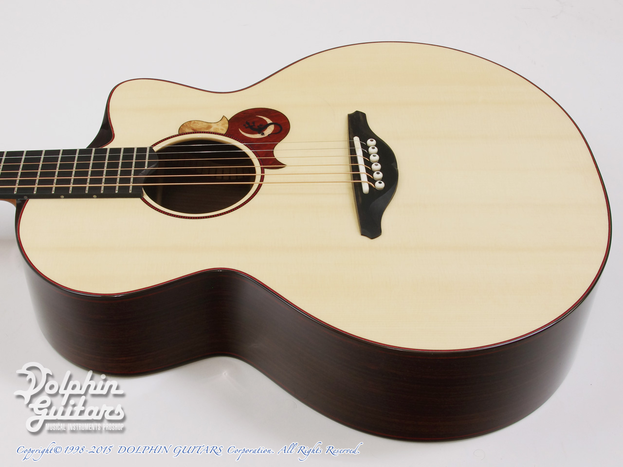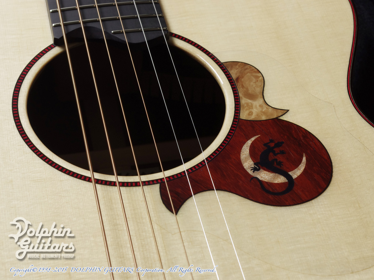 ジャーマン・スプルーストップ、インディアン・ローズウッドS&B、マホガニーネック、エボニー指板&ブリッジ、ヒールレス・ネックジョイント、ベータチタニュウム製のトラスロッド、べヴェルド・カッタウェイ、スポルテッド・メイプル×パドックによるビルトイン・ピックガード。