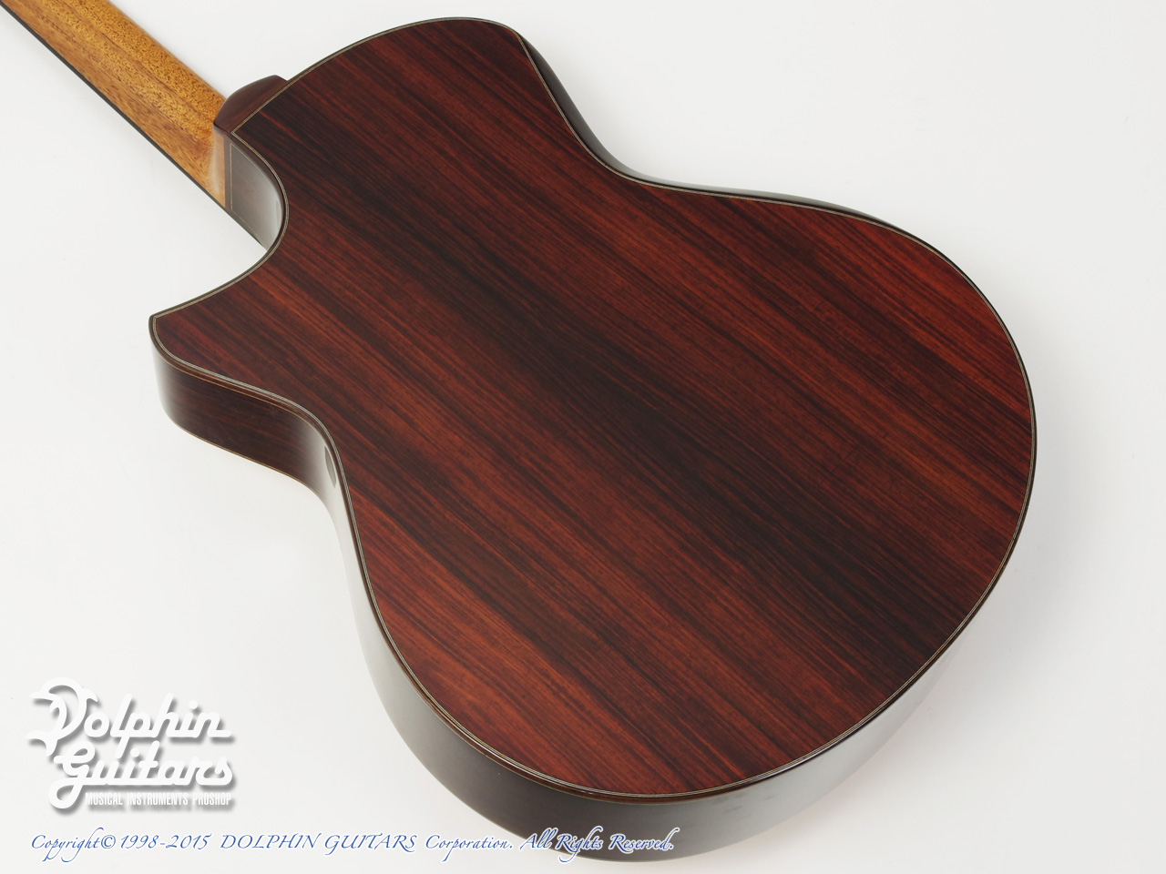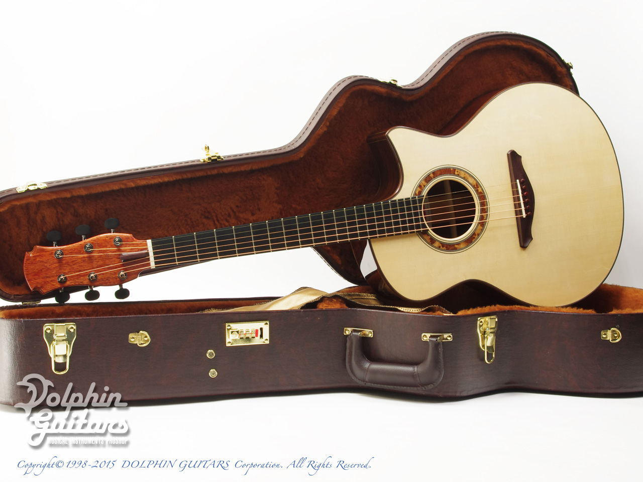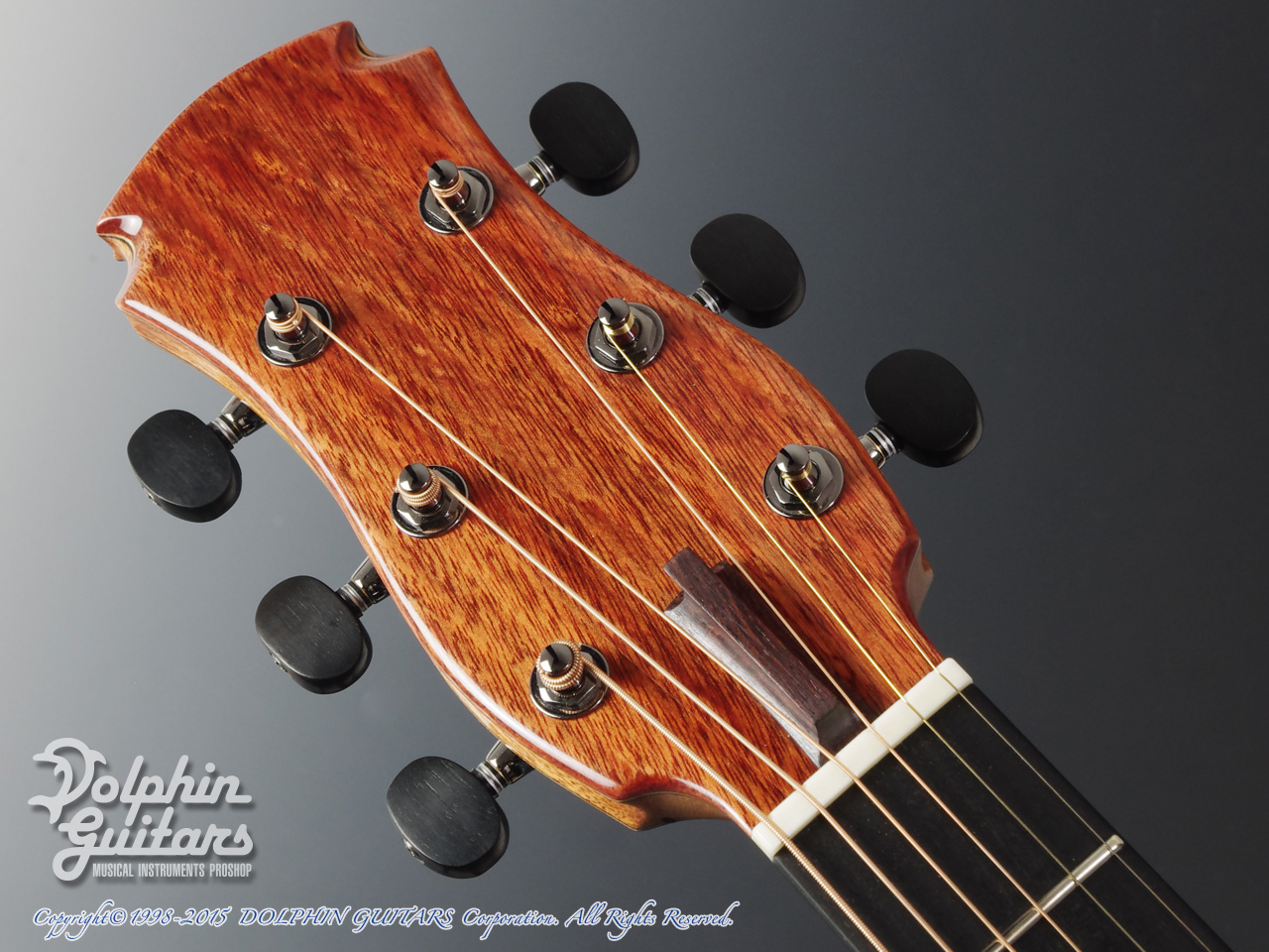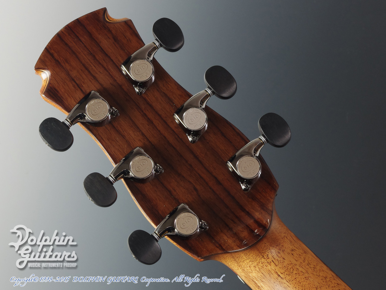 ジャーマン・スプルーストップ、ココボロS&B、マホガニーネック(アジャスタブルロッド)、エボニー指板、アマゾンローズブリッジ、リブレスト(バックコンター)、オリジナルウッドロゼッタ、ゴトー510糸巻き、フローレンタインカッタウェイ仕様。