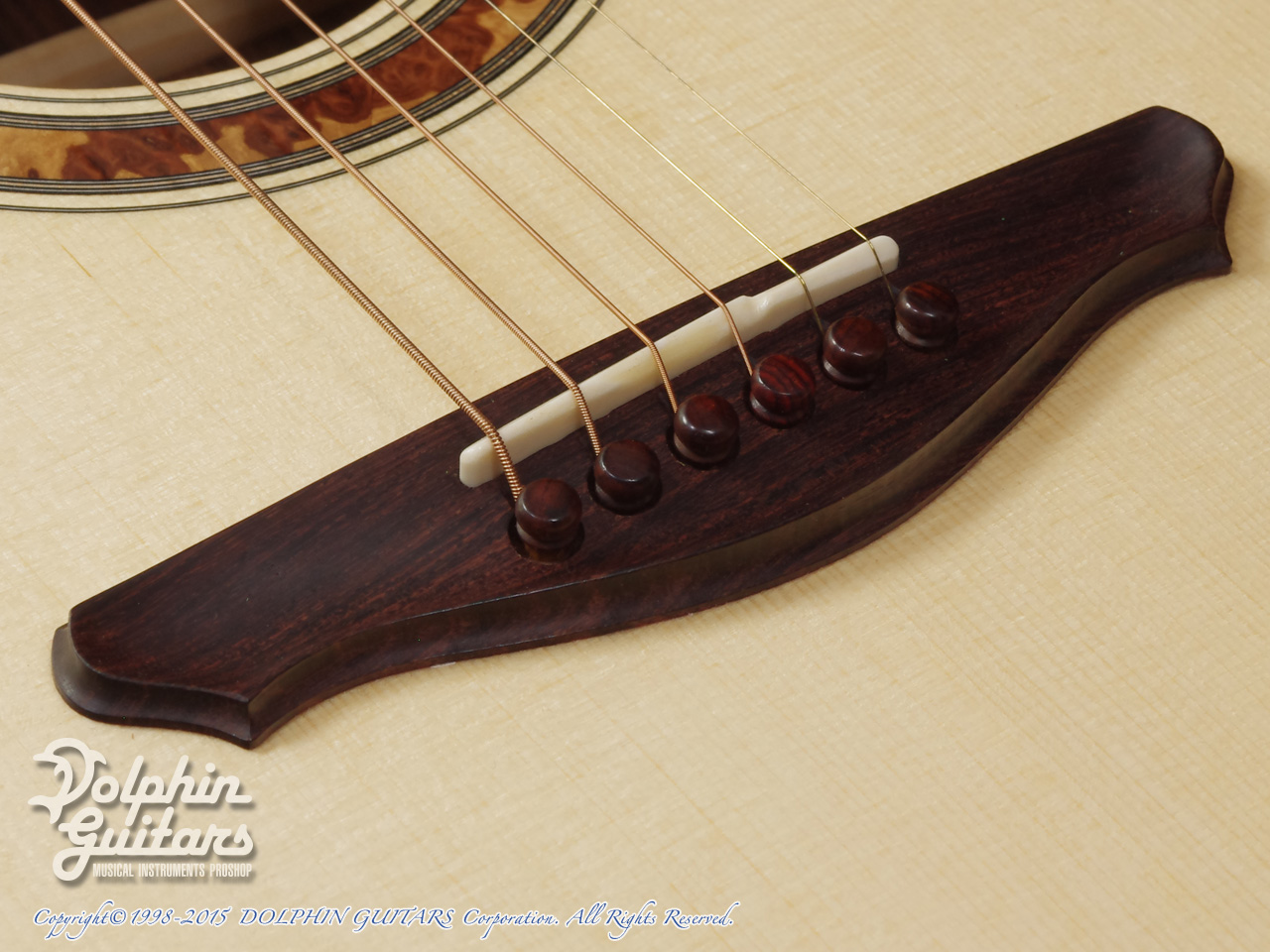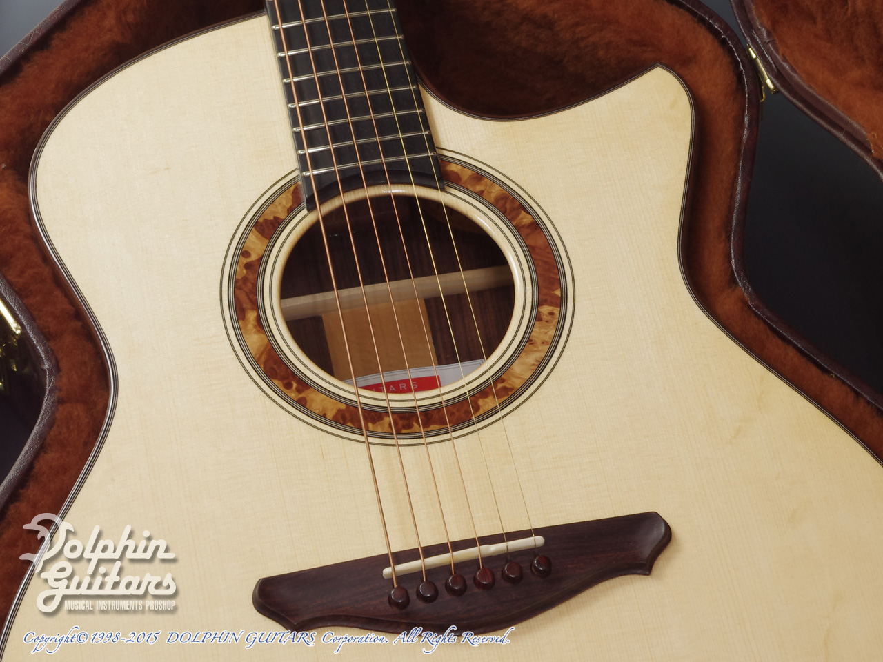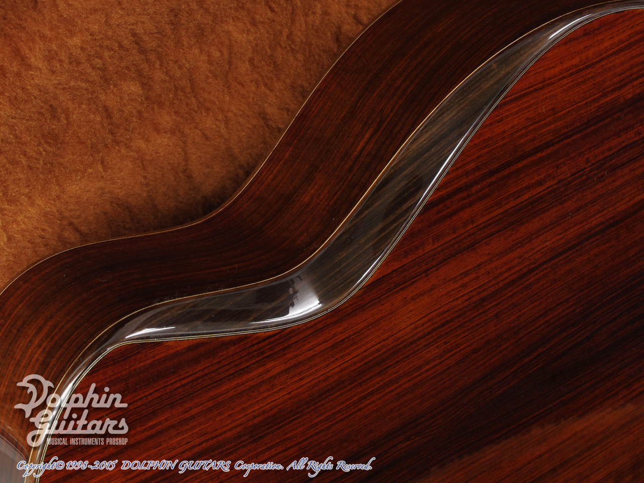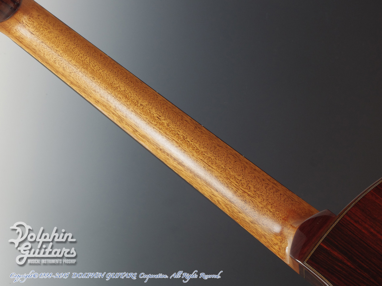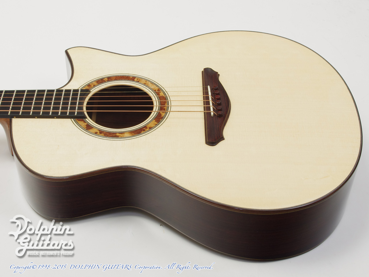 ジャーマン・スプルーストップ、ココボロS&B、マホガニーネック(アジャスタブルロッド)、エボニー指板、アマゾンローズブリッジ、リブレスト(バックコンター)、オリジナルウッドロゼッタ、ゴトー510糸巻き、フローレンタインカッタウェイ仕様。