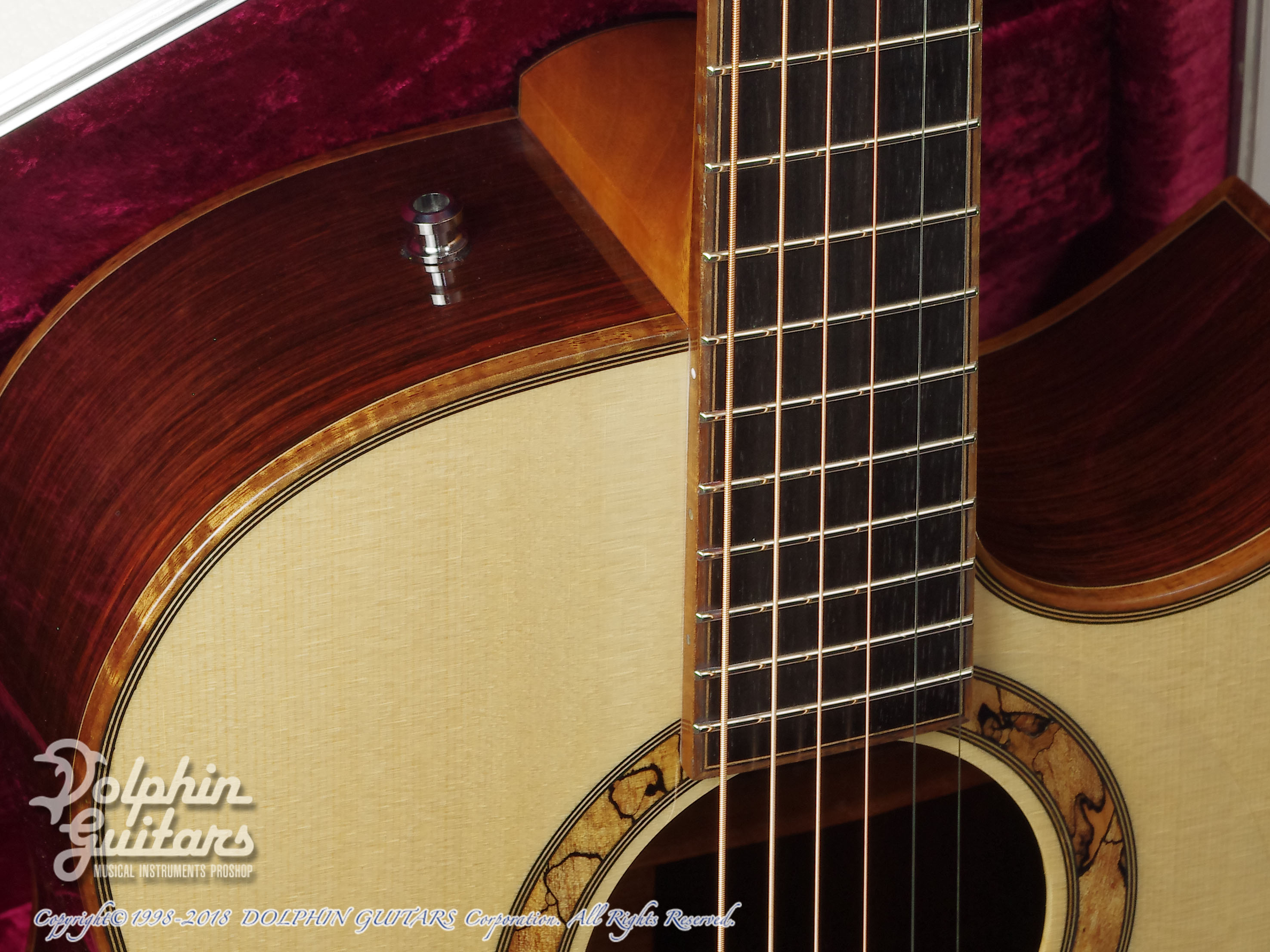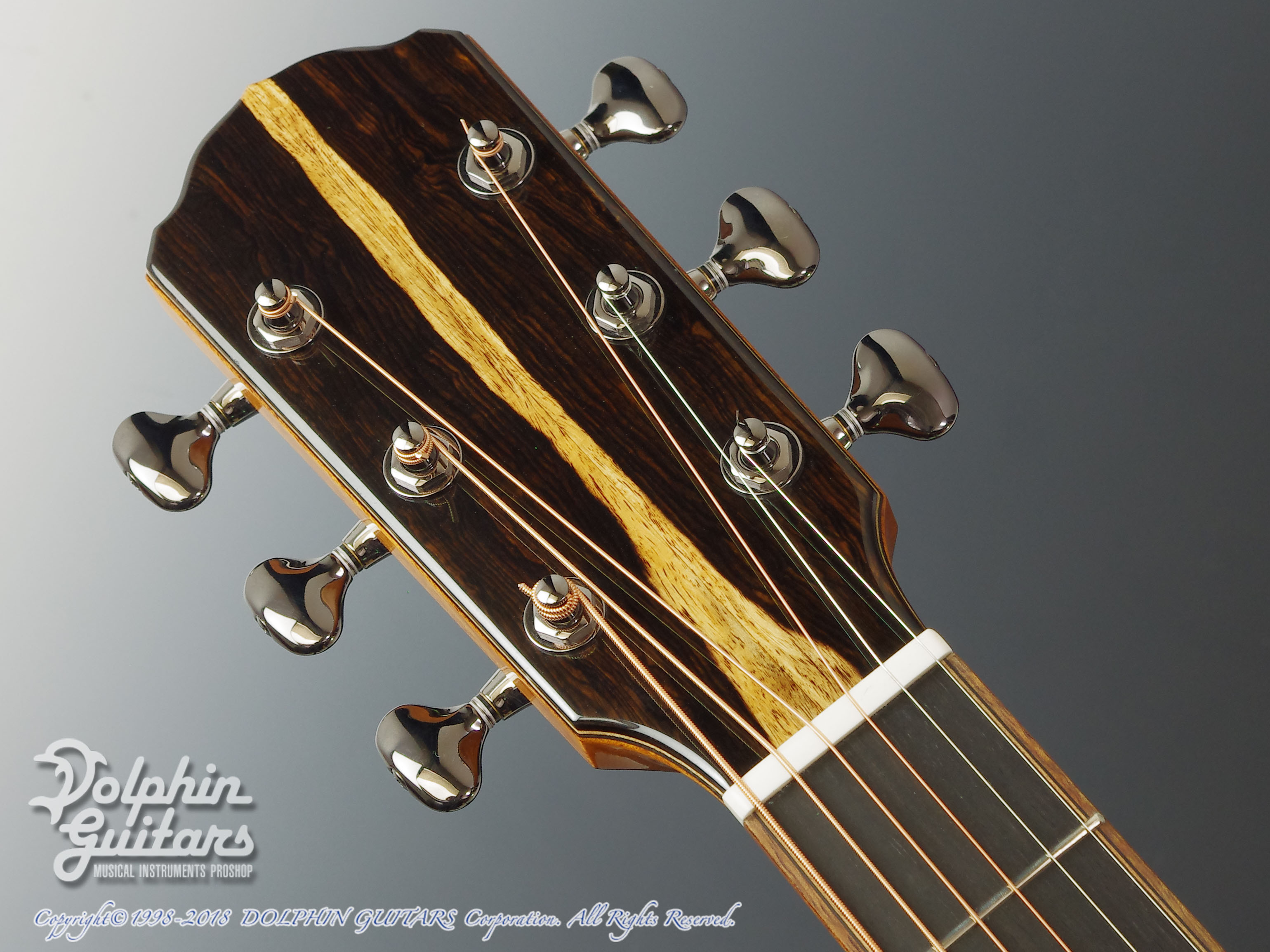 ヨーロピアン・スプルーストップ、マダガスカル・ローズウッドS&B、マホガニーネック(アジャスタブルロッド)、エボニー指板、ハカランダブリッジ、アフリカン・ブラックウッドヘッドプレート、ハワイアン・コアバインディング、スポルテッド。メイプルロゼッタ、44mmナット、644mmスケール、クリアPG、ラッカーフィニッシュ、Gotoh510ペグ使用。税込販売価格¥691,200
