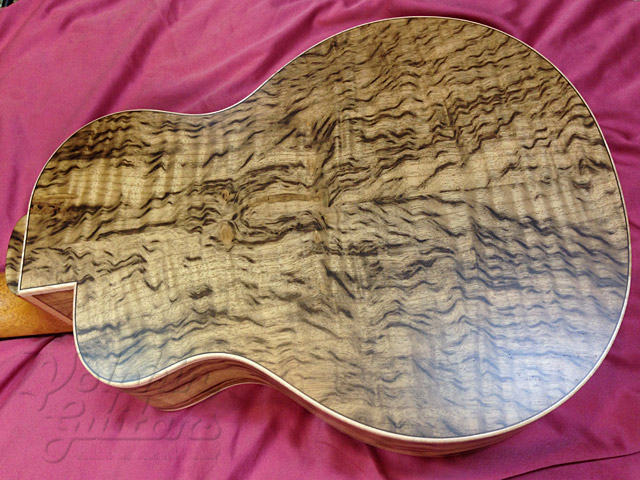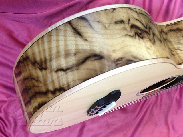 ジャーマン・スプルース・トップ、フィギャード・タイガー・マートルウッド・サイド&バック、マホガニー・ネック、エボニー指板&駒、フレイムコア・ピックガード。