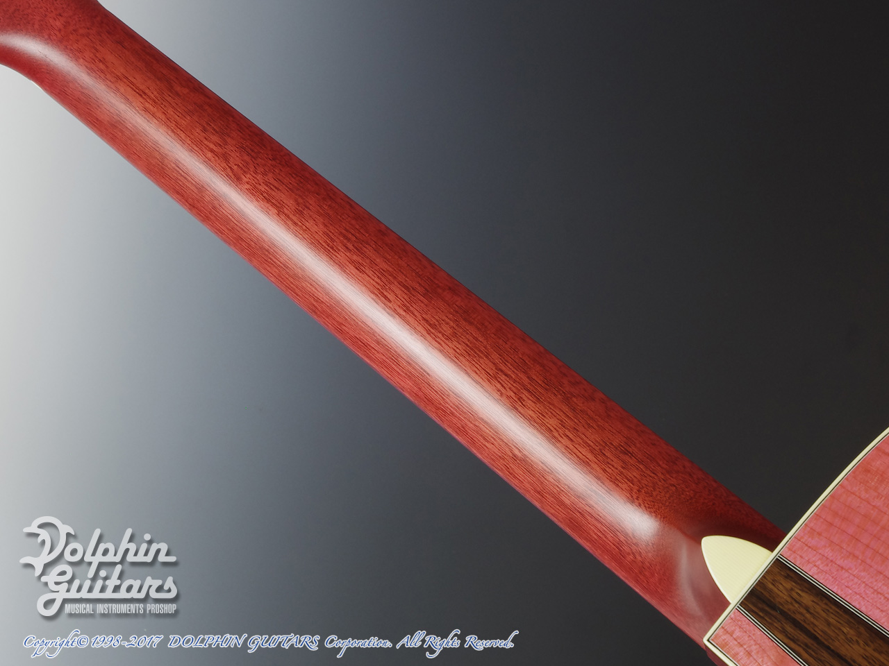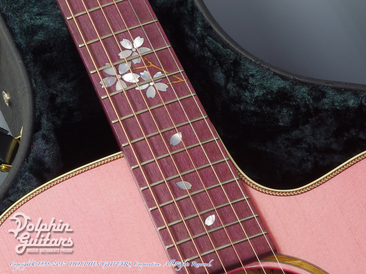 セレクト・シトカ・スプルース・トップ、桜サイド&バック、マダガスカル・ローズウッド・センターの3ピース・バック、ホンデュラス・マホガニー1ピース・ネック、パープルハート指板&駒&ピックガード、ヘッドから指板エンドにかけ、桜のインレイを施し、ボディにはシースルー・ピンクに着色しファンシーなルックスに仕上げました。