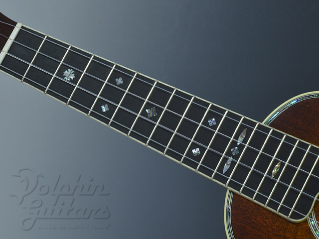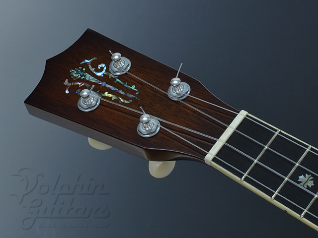 アバロンで綺麗に装飾されたフラワーポッドインレイ、ロゼッタ、トップトリム、ポジションインレイなど、淡いサンバーストフィニッシュのマホガニーとのコントラストがとても美しいウクレレです。