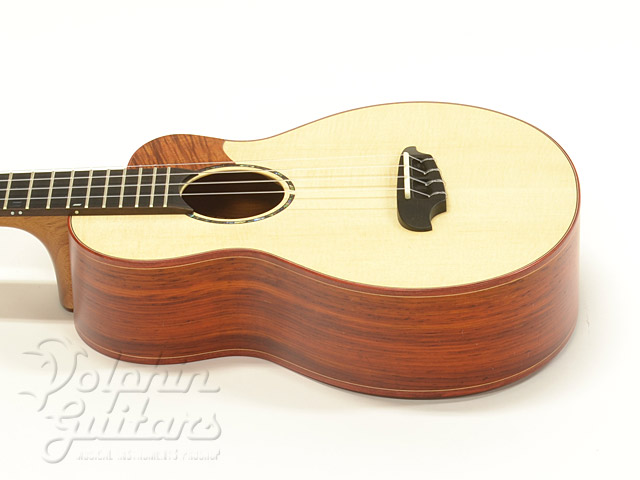 白く輝くイングルマンスプルースでと赤く艶やかなココボロの組み合わせが美しいウクレレ。