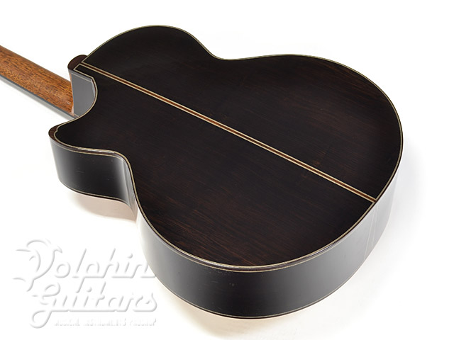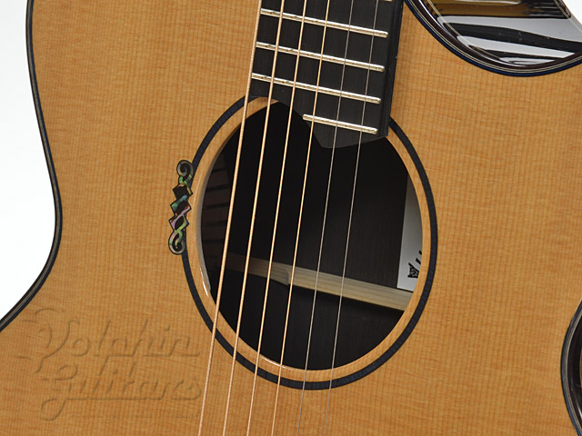 シトカ・スプルース・トップ、アフリカン・ブラックウッド・サイド&バック、エボニー指板&駒、サウンドホールにはネックレスをイメージしたインレイを施しました。