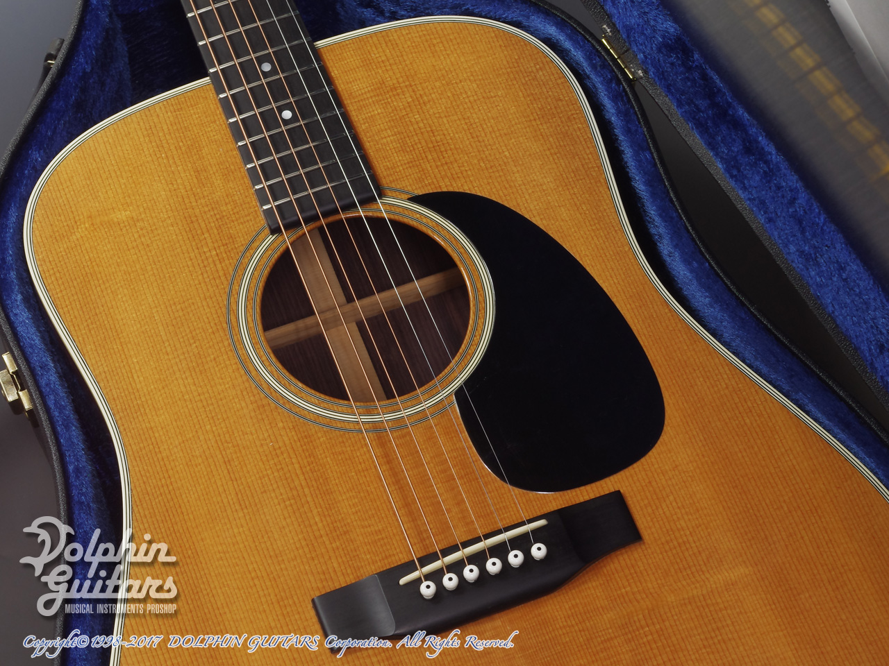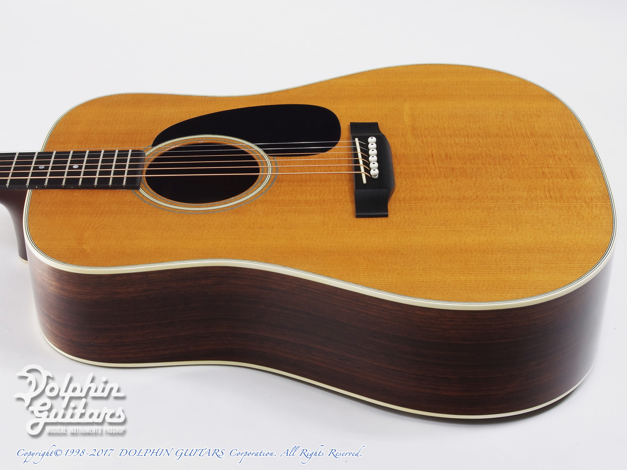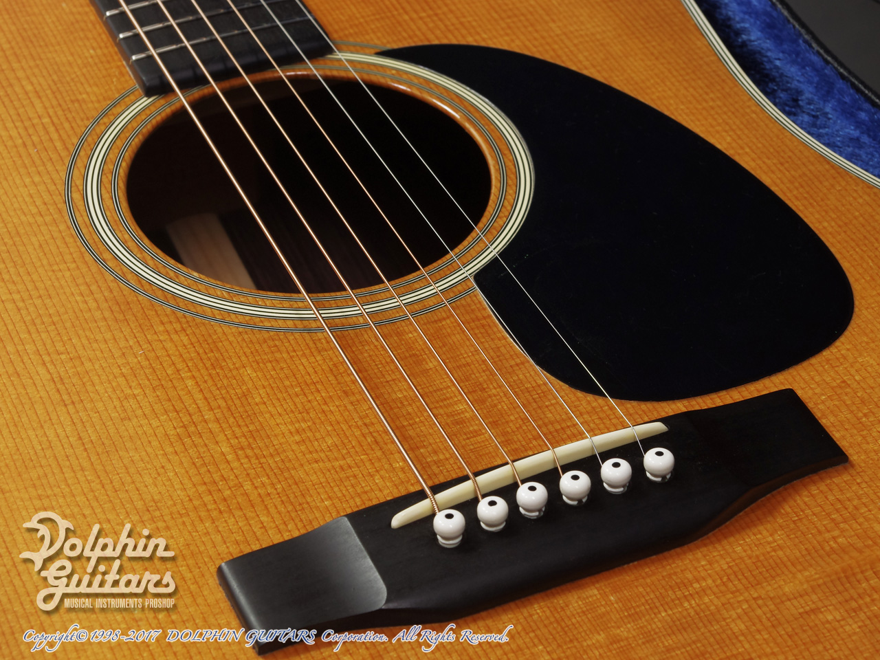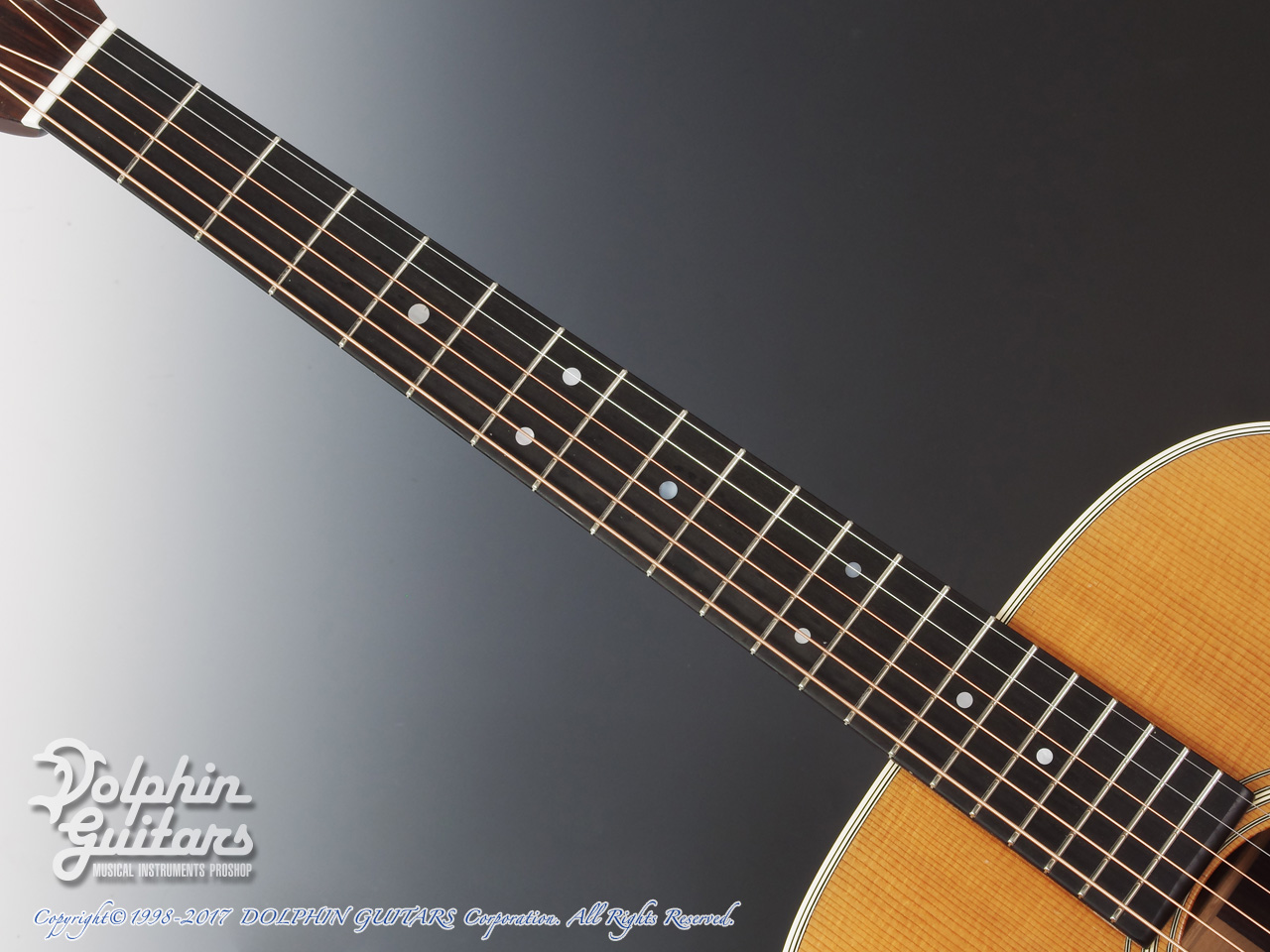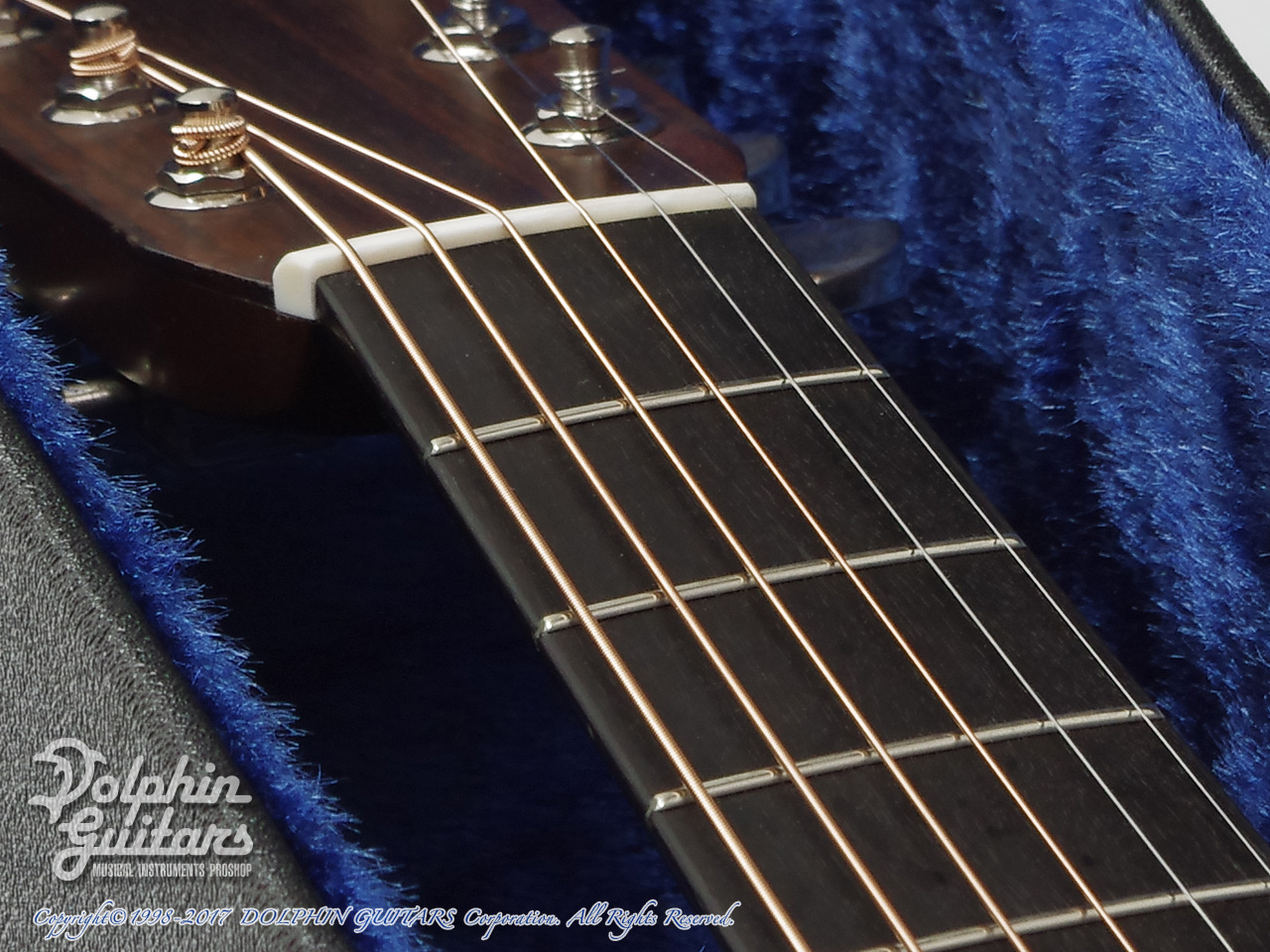 当店入荷後にフレット打換え、ナット作成交換を施し、サウンドや演奏性も最高の状態にセットアップ済みです。パッと見は本家と見間違うほどの作り込みで、細部の形状や塗装面の質感など70's〜80'sの28の雰囲気を持ち、ルックス・サウンドともにヴィンテージの風格を漂わせ、マーティンD-28+塩崎氏のエッセンスが加わった極上のサウンドです。枯れ具合やクリアさ、音抜け、ボリュームすべてにおいて素晴らしい個体です。鳴りや音抜けの良さからテンション感も程よく、余分な硬さも感じさせない弾き心地です。その他ネックはストレート、弦高は6弦12F約2.6mm、1弦約2.0mmのセッティング。仕込み角度も完璧でサドル高さも十分です。ノークラック、トップは弾き傷らしい傷もなく、大変美しいコンディションの1985年製です。