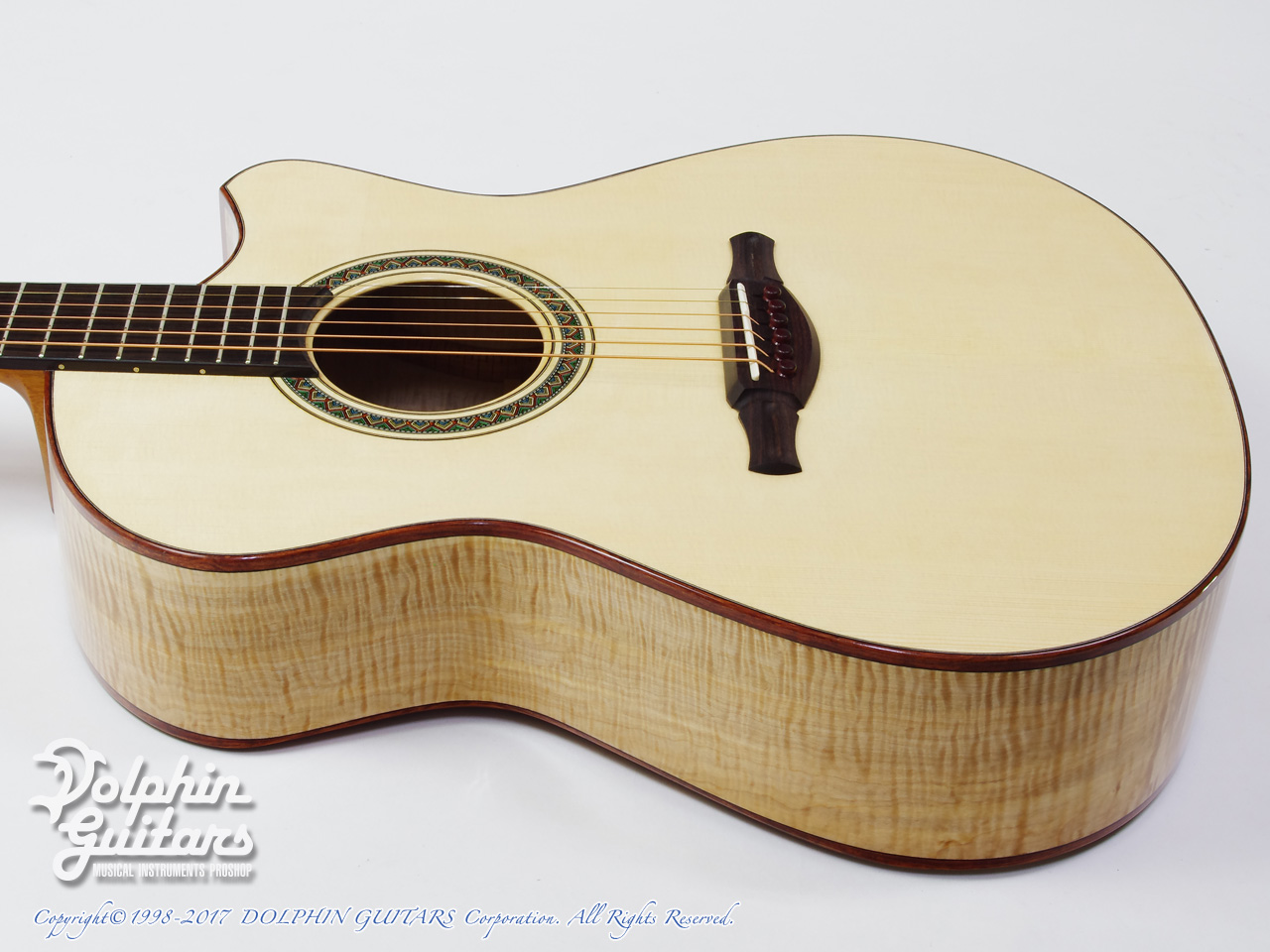 フィエンメ・スプルーストップ、栃 (歪み杢)S&B、ホンデュラス・マホガニーネック(アジャスタブルロッド)、44,5mmナット幅、ローズウッド指板&ブリッジ、ウッドロゼッタ(オリジナルデザイン)、バックコンター加工、Gotoh510ペグ。