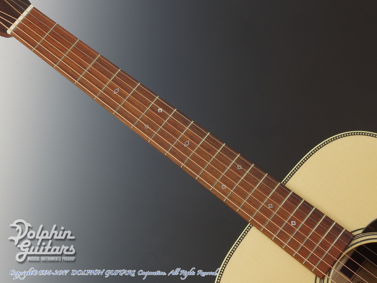 トップはその名の通り色白できめ細かく大変美しいホワイトスプルースを採用。このホワイトスプルースはヨーロピアンスプルースにも似た性質を持ち、シトカスプルースなど他のものに比べて柔らかめな質感を持ちます。サウンド面でもこれが影響し、インディアンローズウッドとの相性も非常に良く、 幅があり空間に広がるような音色を得られます。