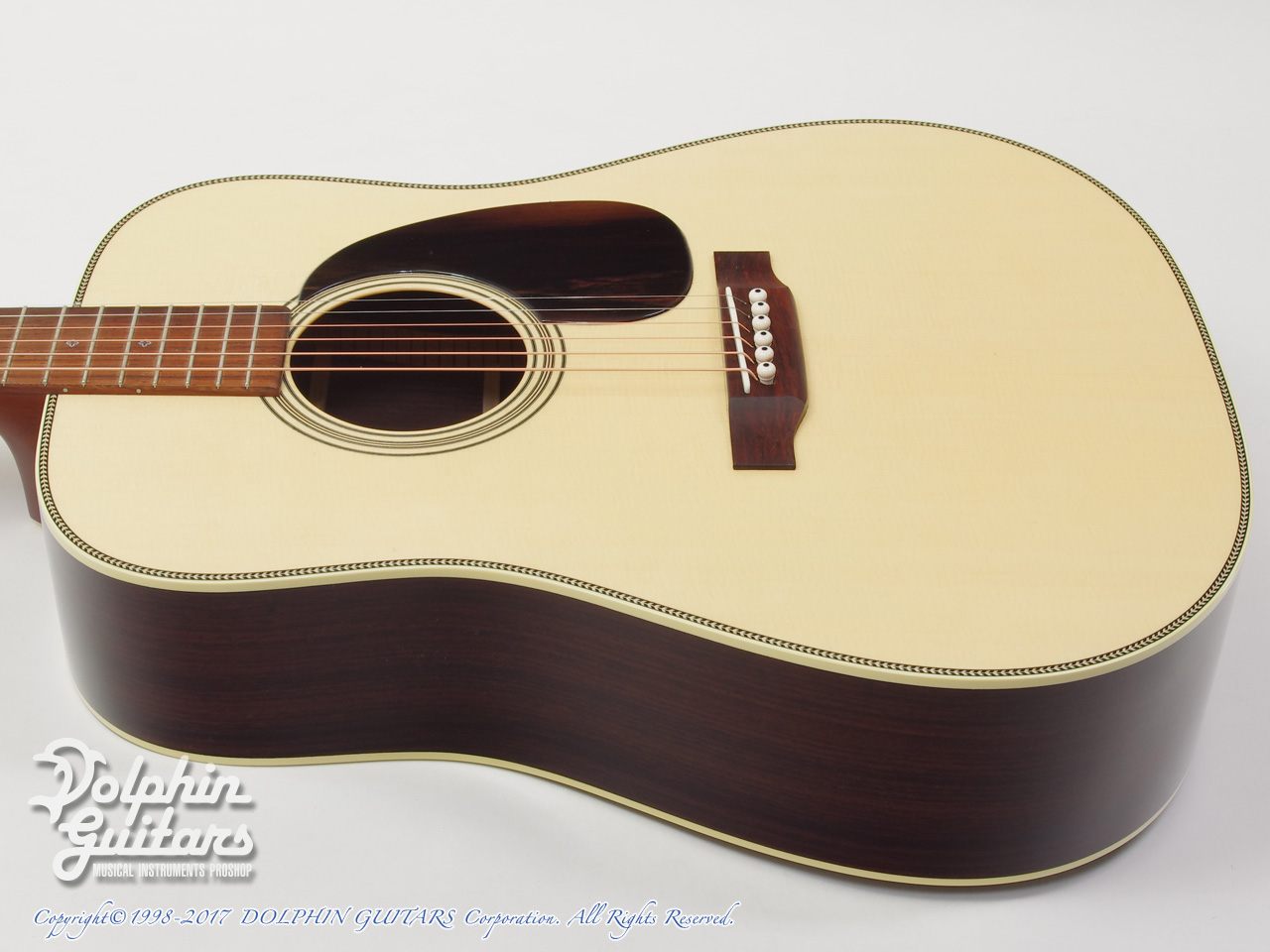 ホワイトスプルースTOP、インディアン ローズウッドS&B、スキャロップドXアドヴァンスド リアシフトブレイス、ホンジュラス マホガニー1Pネック、ハカランダ指板&ブリッジ&PG、Gotohオープンバックペグ、グロスフィニッシュ仕様。