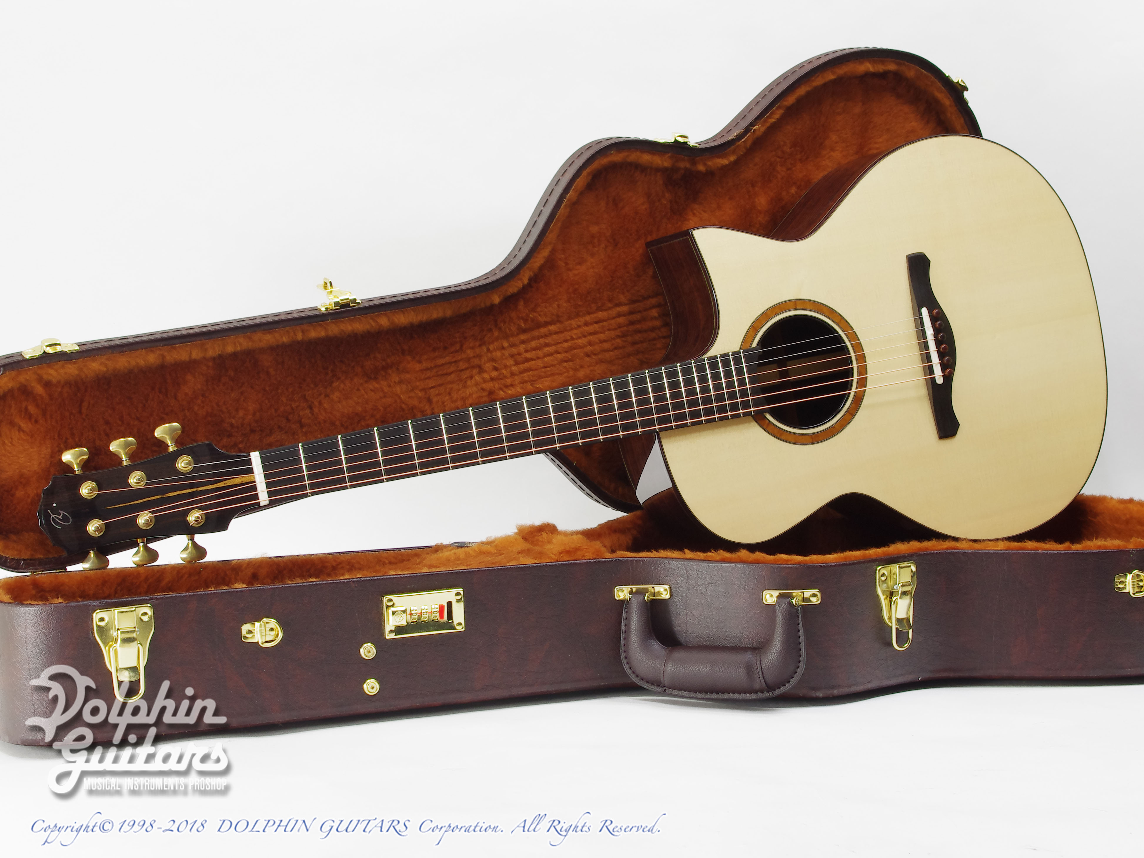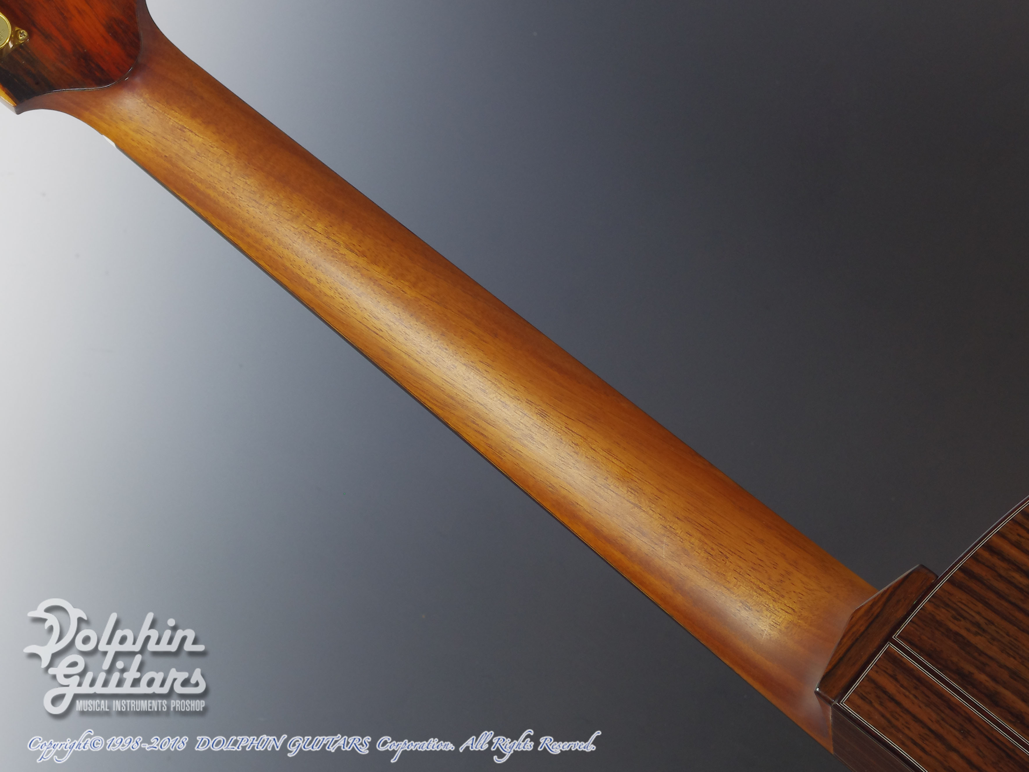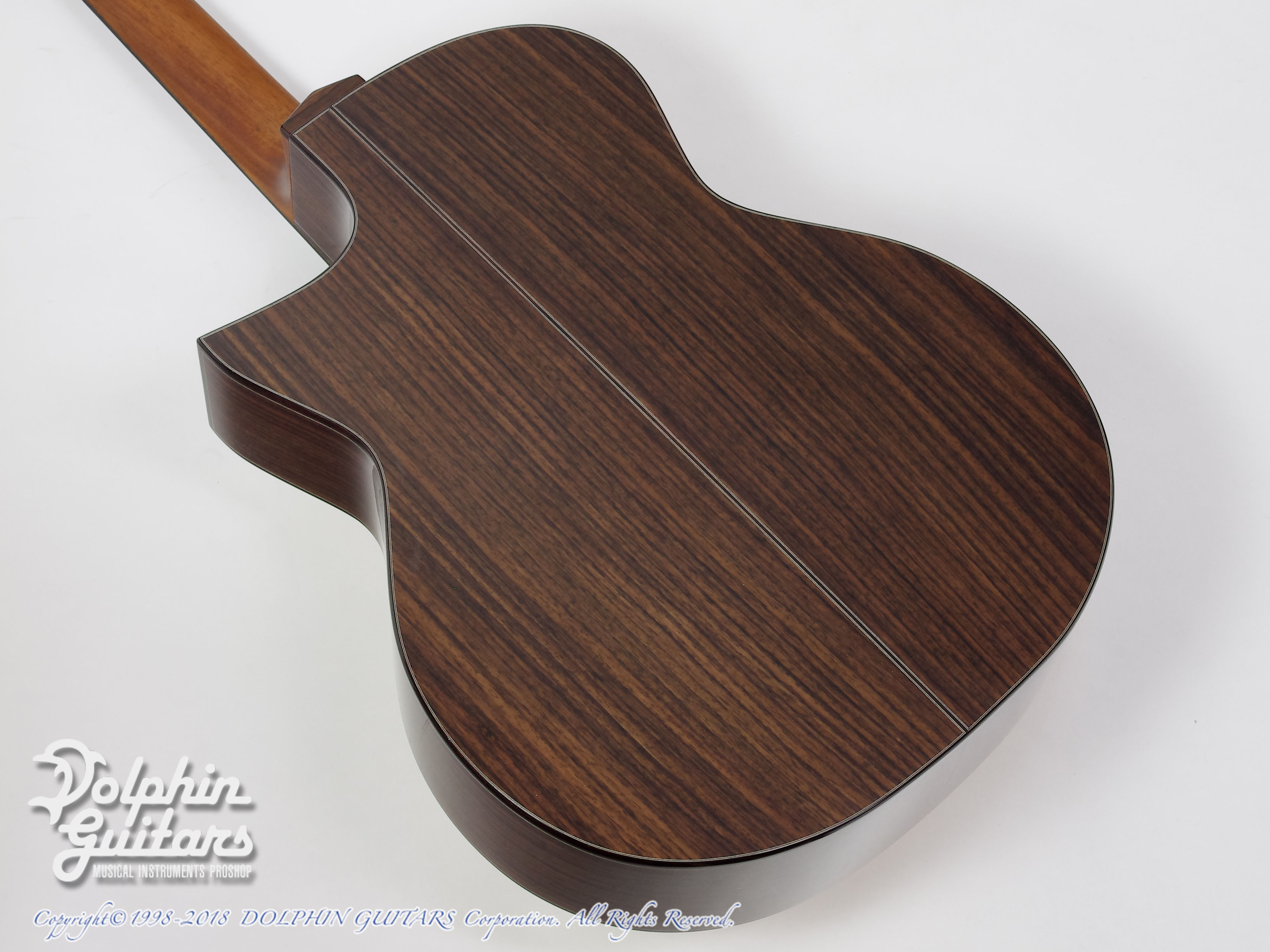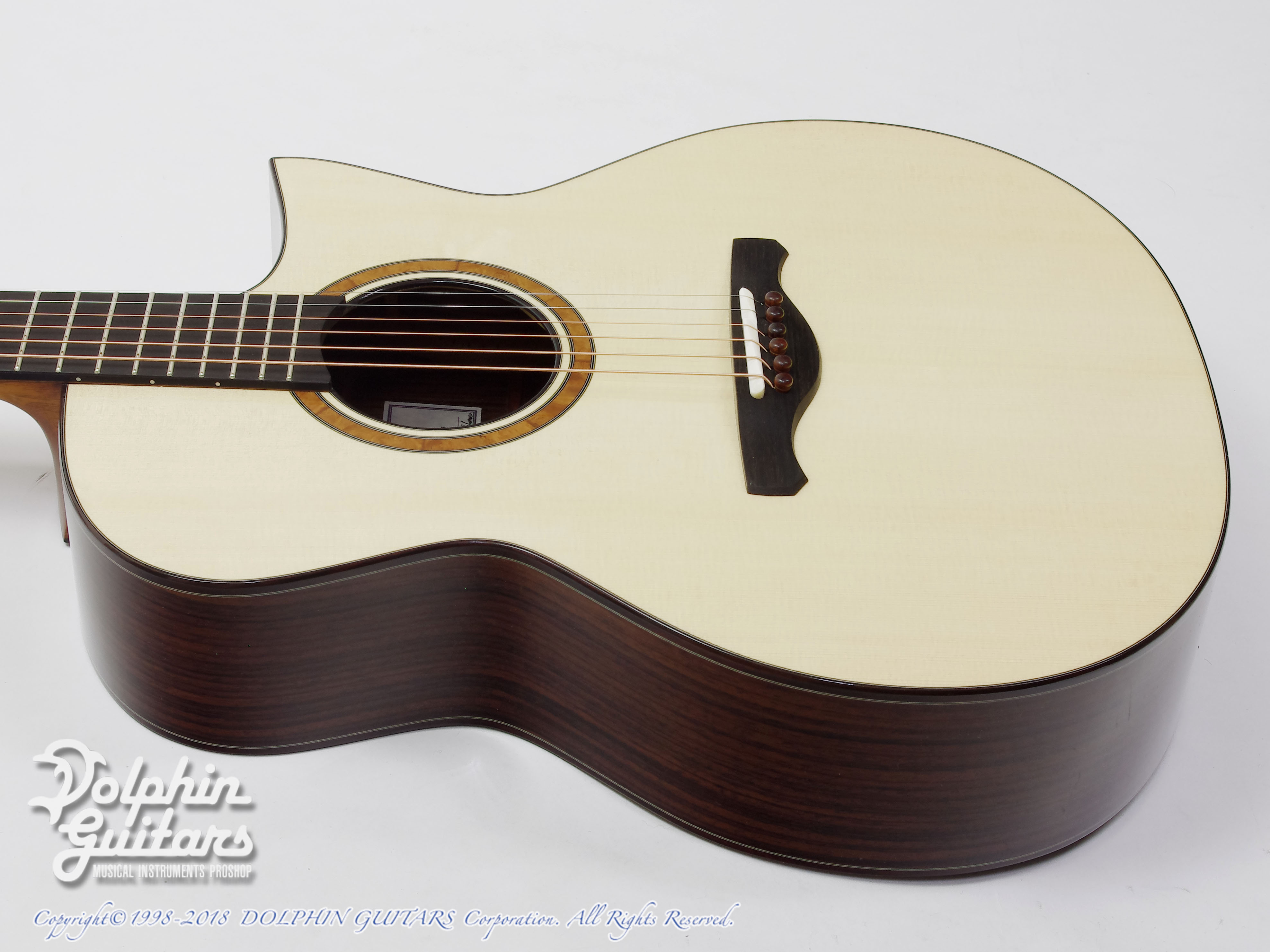 ジャーマン・スプルーストップ、インディアン・ローズウッドS&B、マホガニーネック、エボニー指板、ハカランダ・ブリッジ、ウッド・ロゼッタ、フローレンタイン・カッタウェイ。