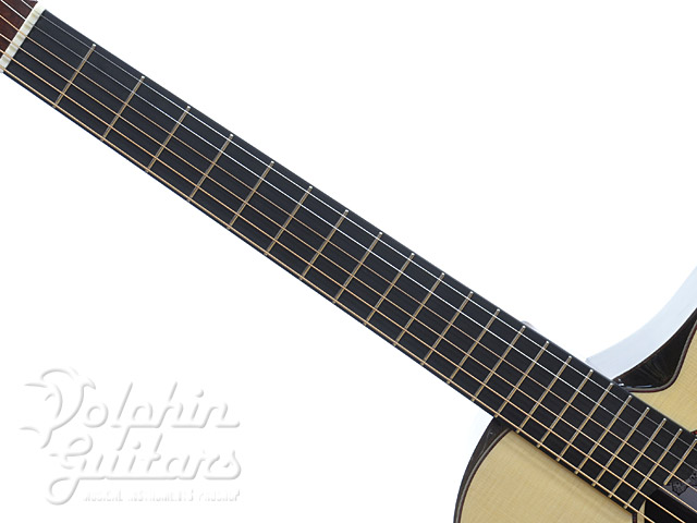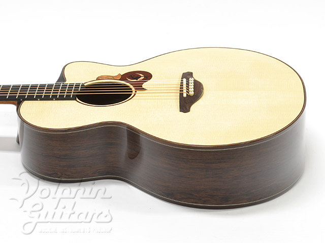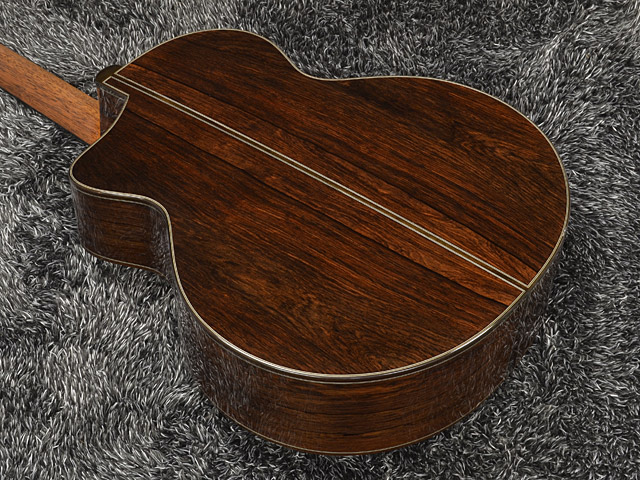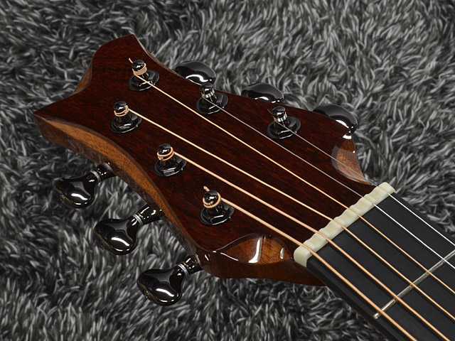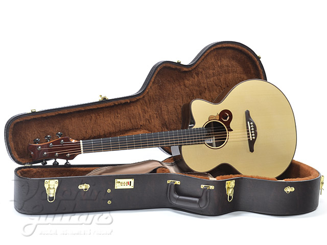 ジャーマン・スプルース・トップ、マダガスカル・ローズウッド・サイド&バック、マホガニーネック、エボニー指板&駒、ヒールレス・ネックジョイント、ベータチタニュウム製のトラスロッド、べヴェルド・カッタウェイ、スポルテッド・メイプル×パドックによるビルトイン・ピックガード。