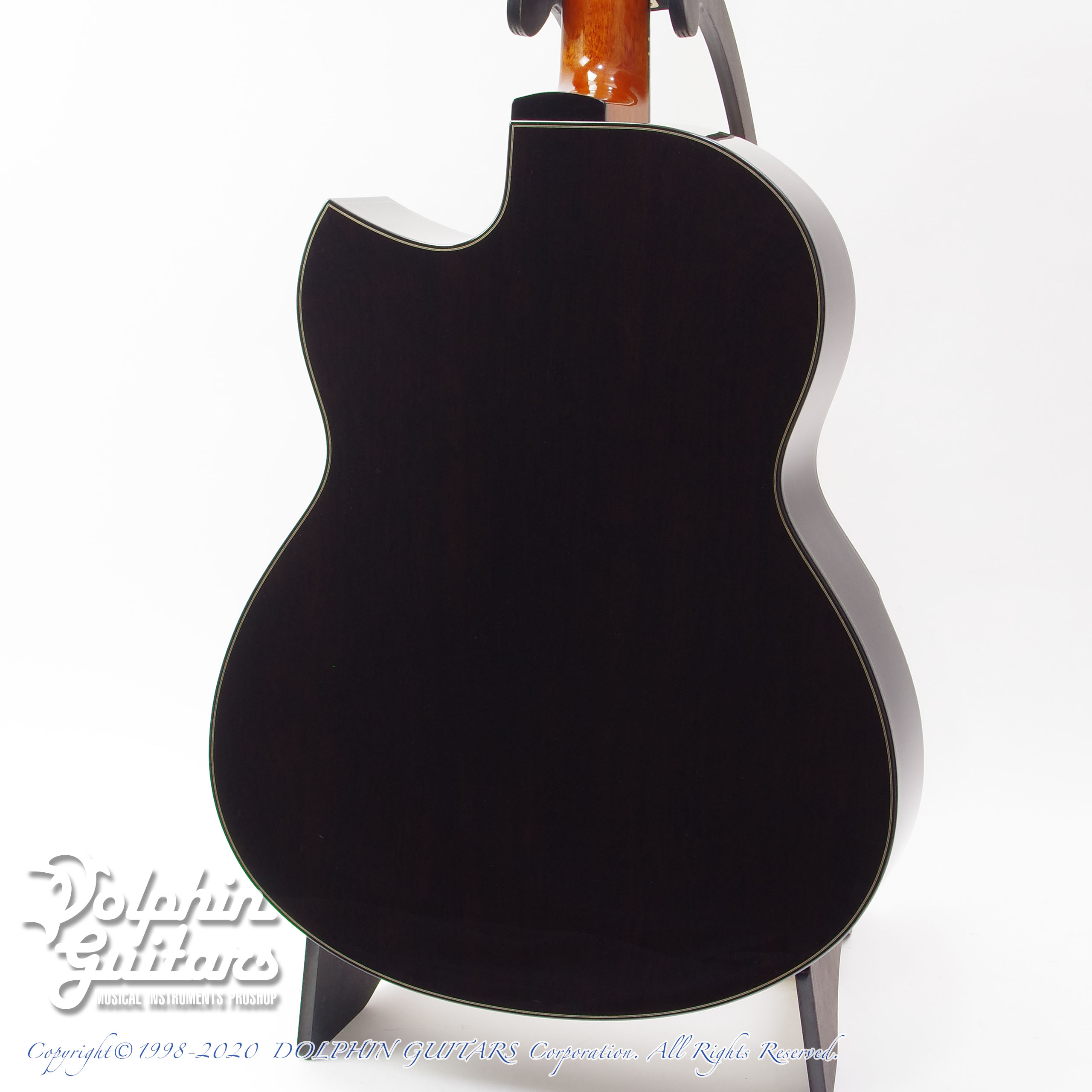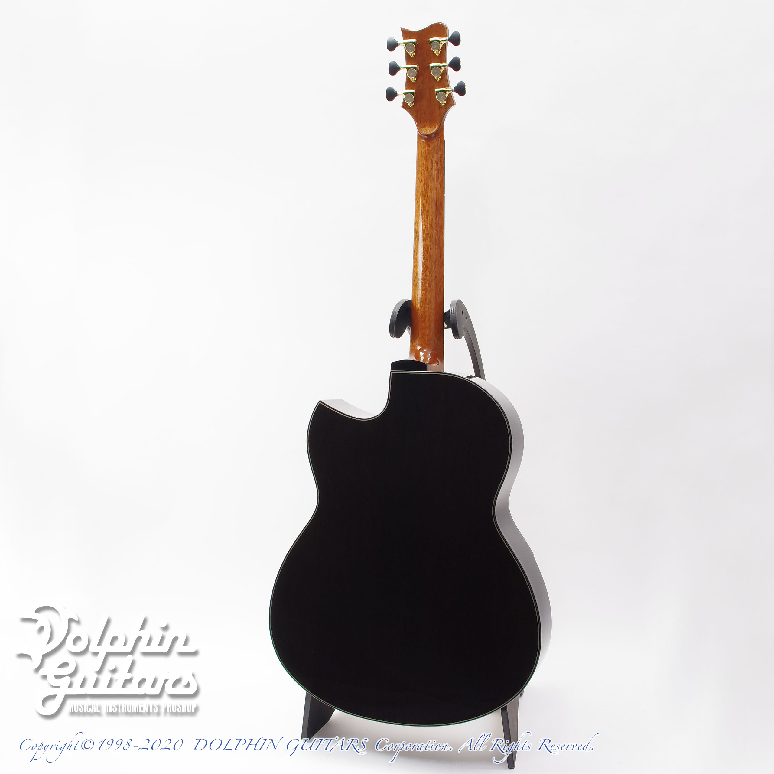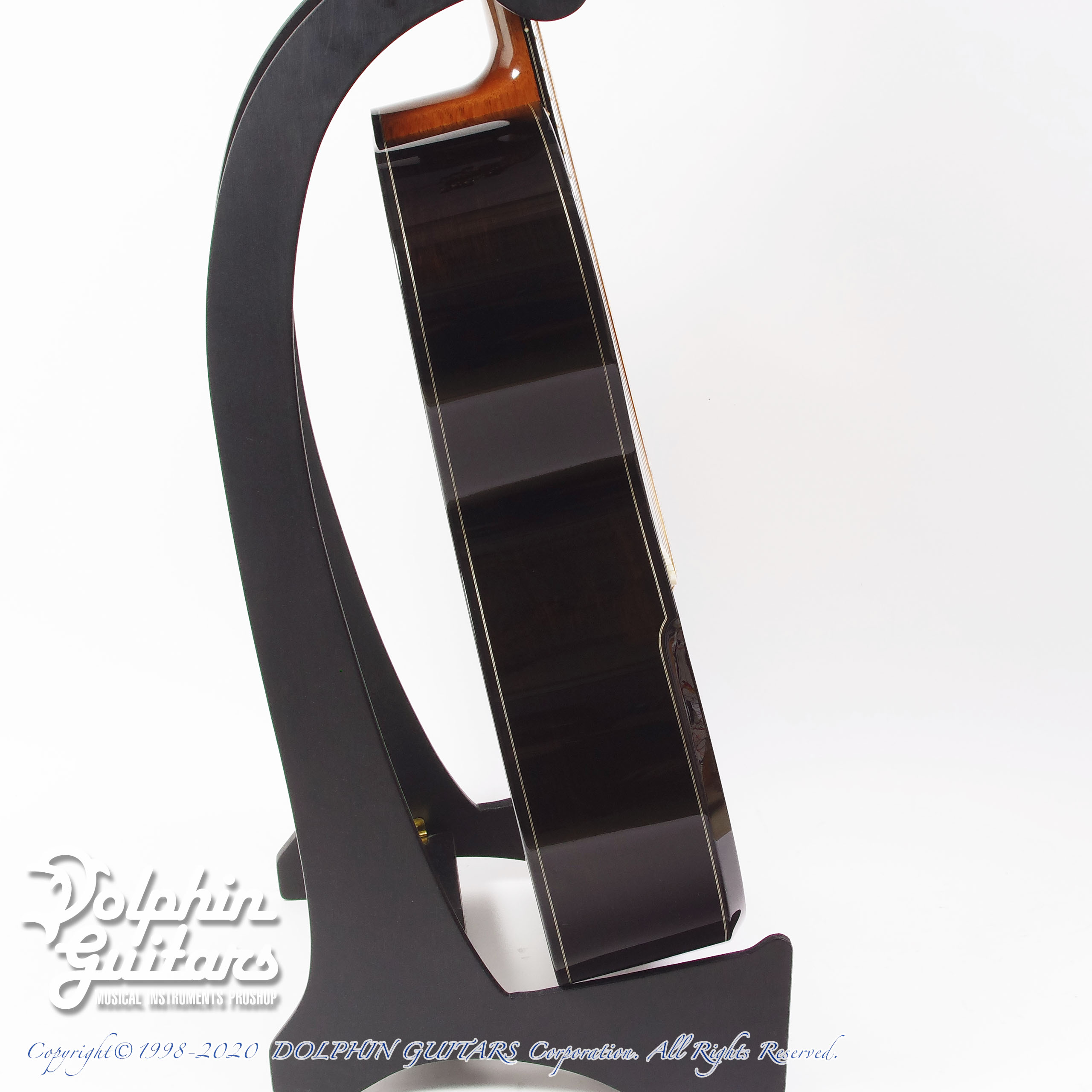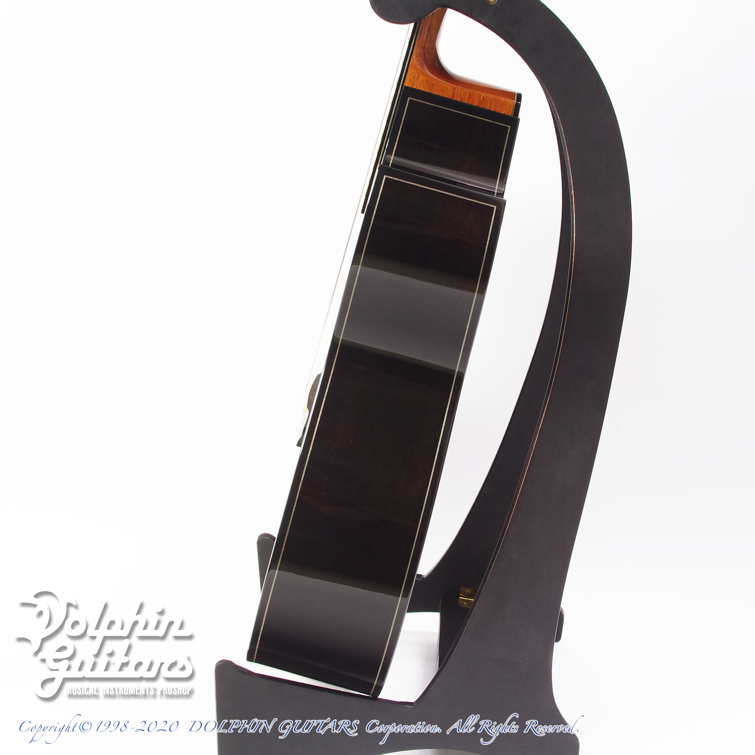 スイススプルースTOP(ムーンウッド)、アフリカンブラックウッドS&B(ラミネイテッドサイド)、ホンジュラスマホガニーネック、エボニー指板&ブリッジ(スルータイプ)、スポルテッド&パウアロゼッタ、ラスキンスタイル アームレスト、43,7mmナット、645mmスケール、GOTOH 510ペグ。