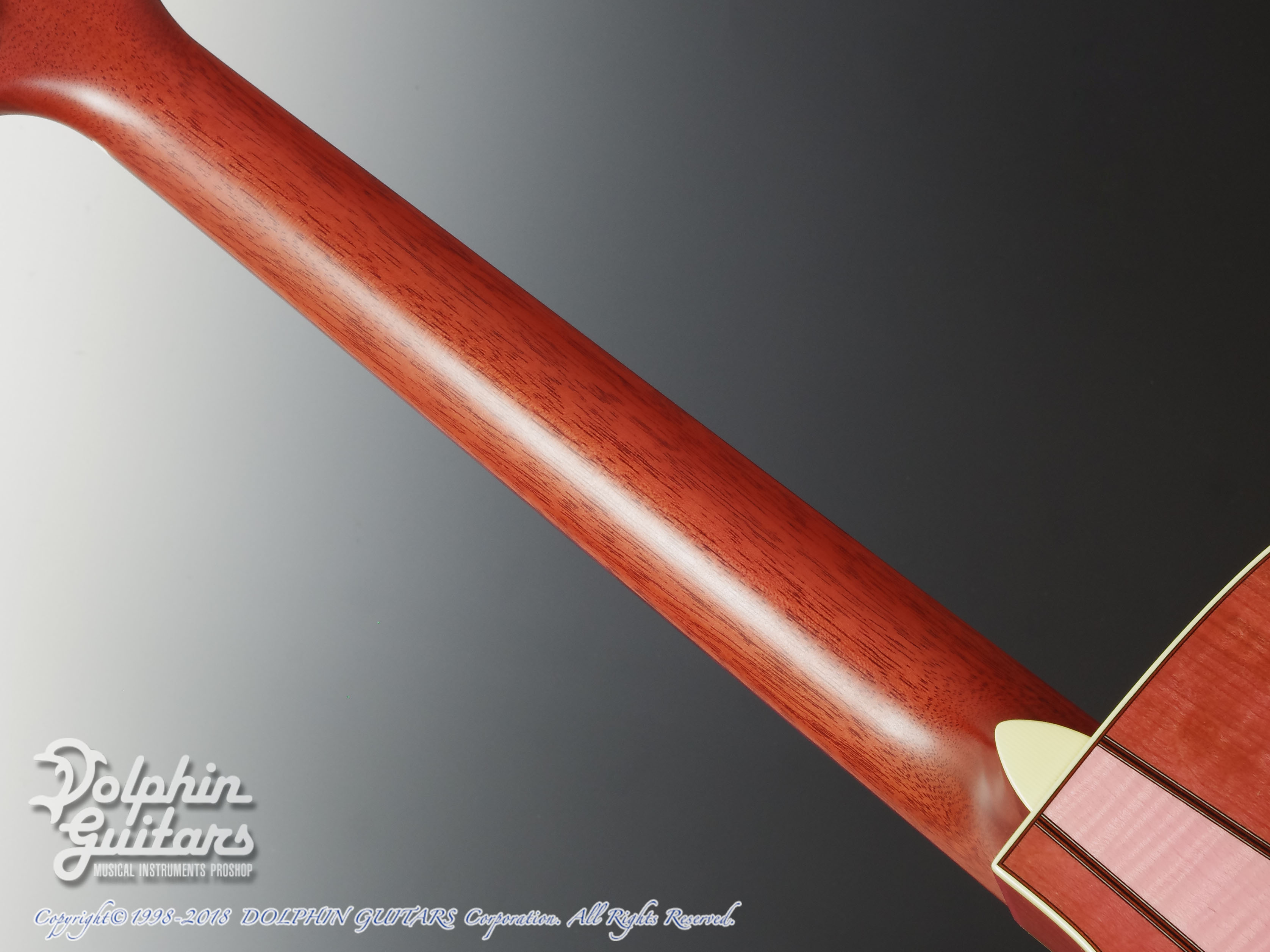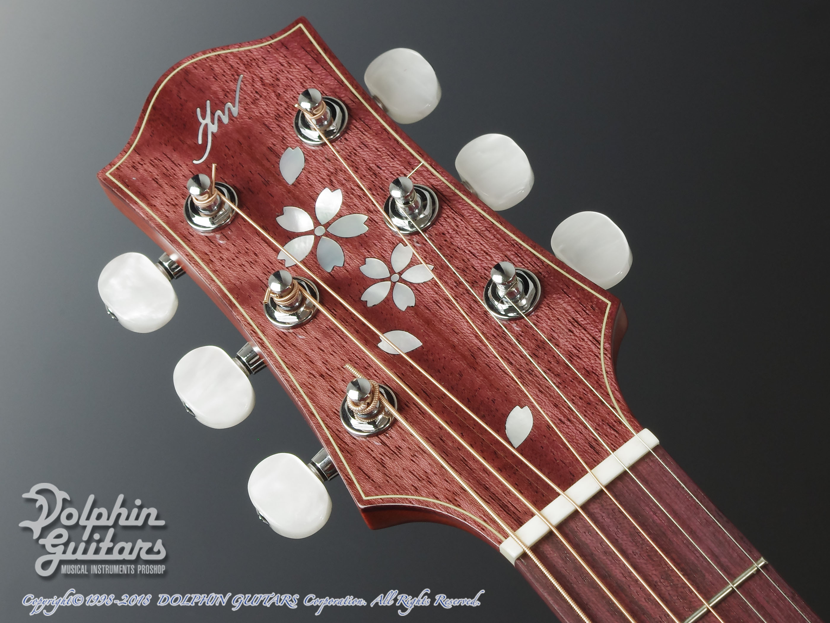 シトカ・スプルーストップ、桜サイド&バック(フレイム・メイプルバックセンター)、ホンデュラス・マホガニー1ピース・ネック、パープルハート指板&ブリッジ&ピックガード、Gotohペグ・パーロイドボタン。
