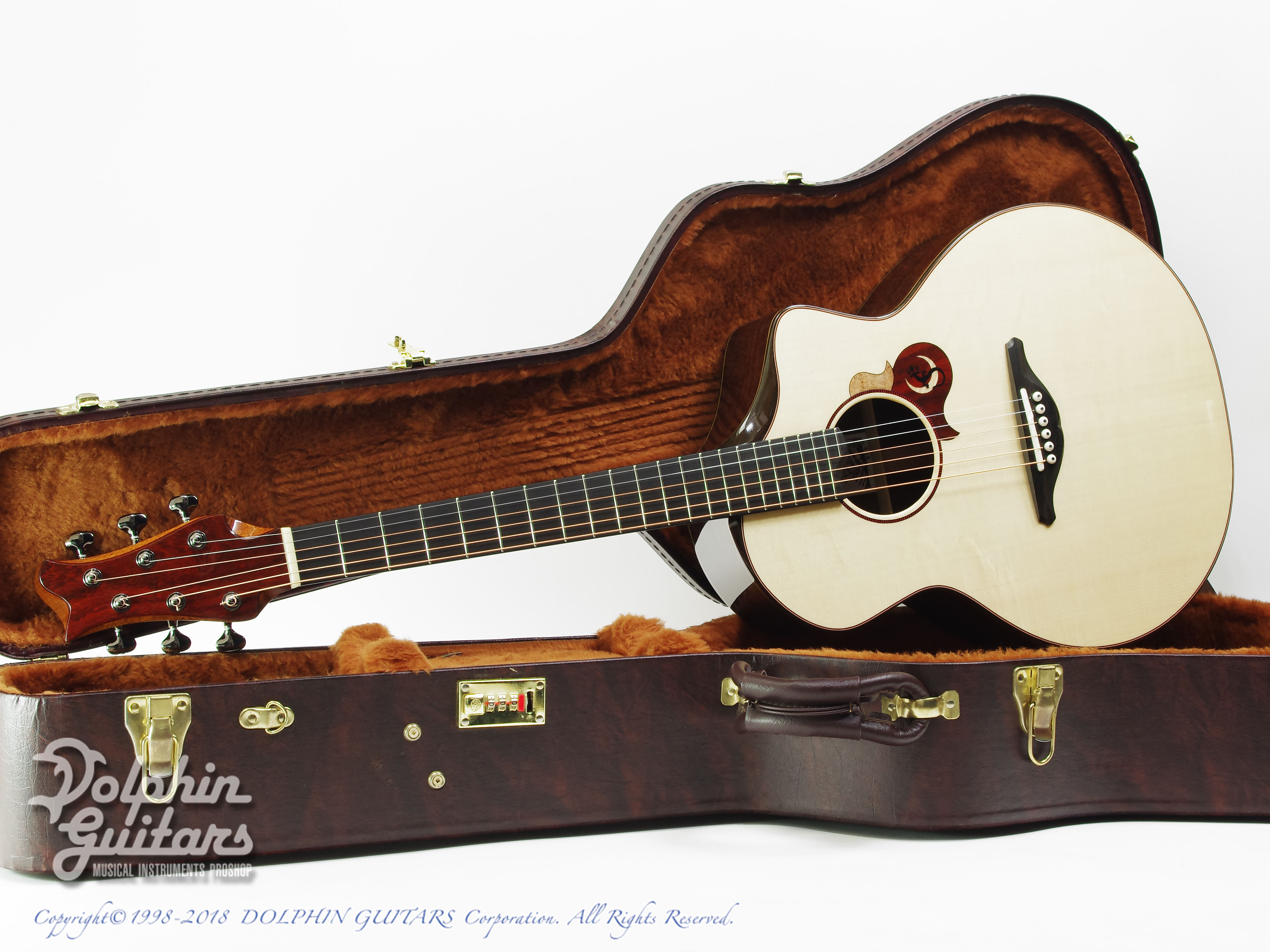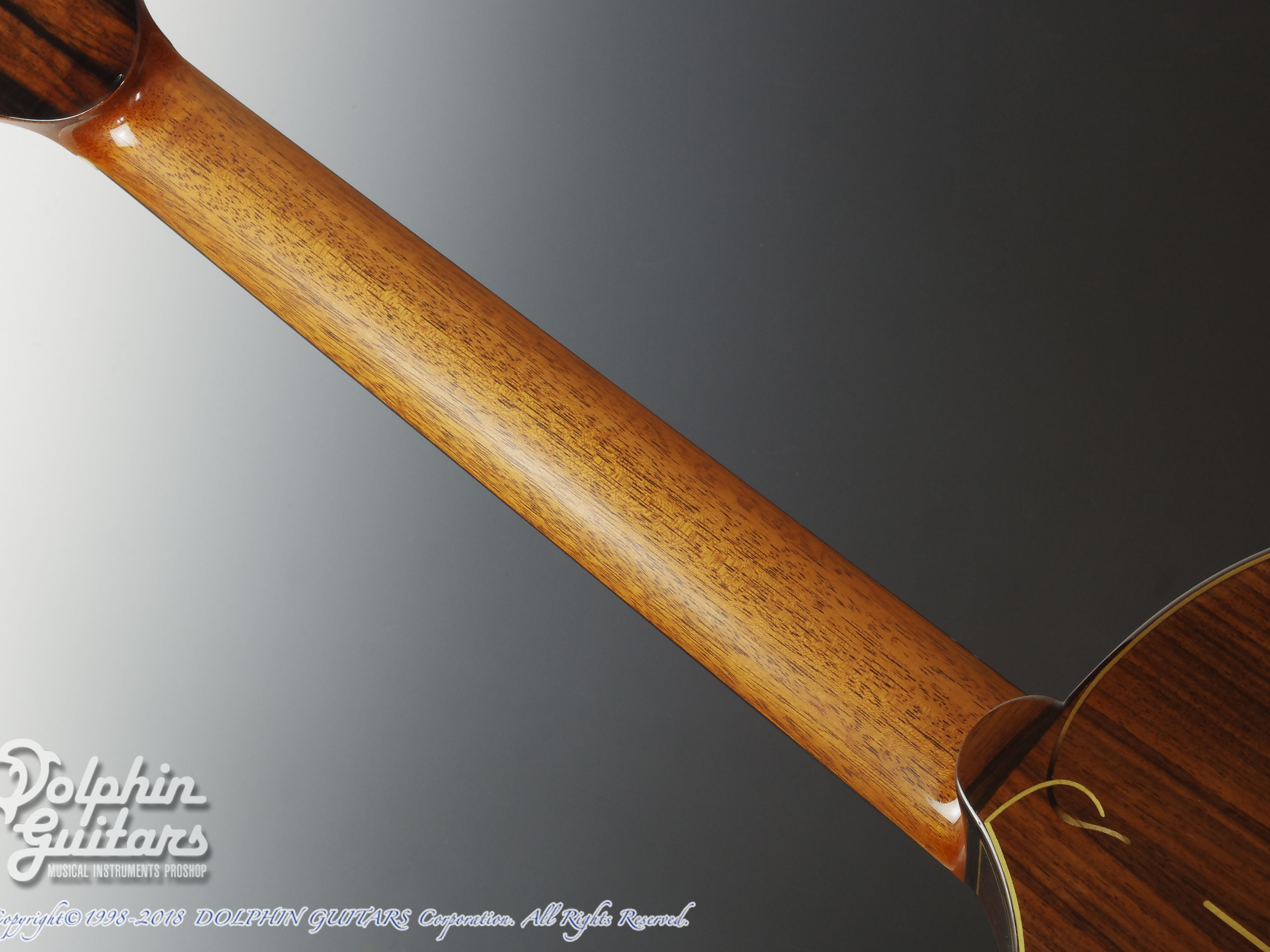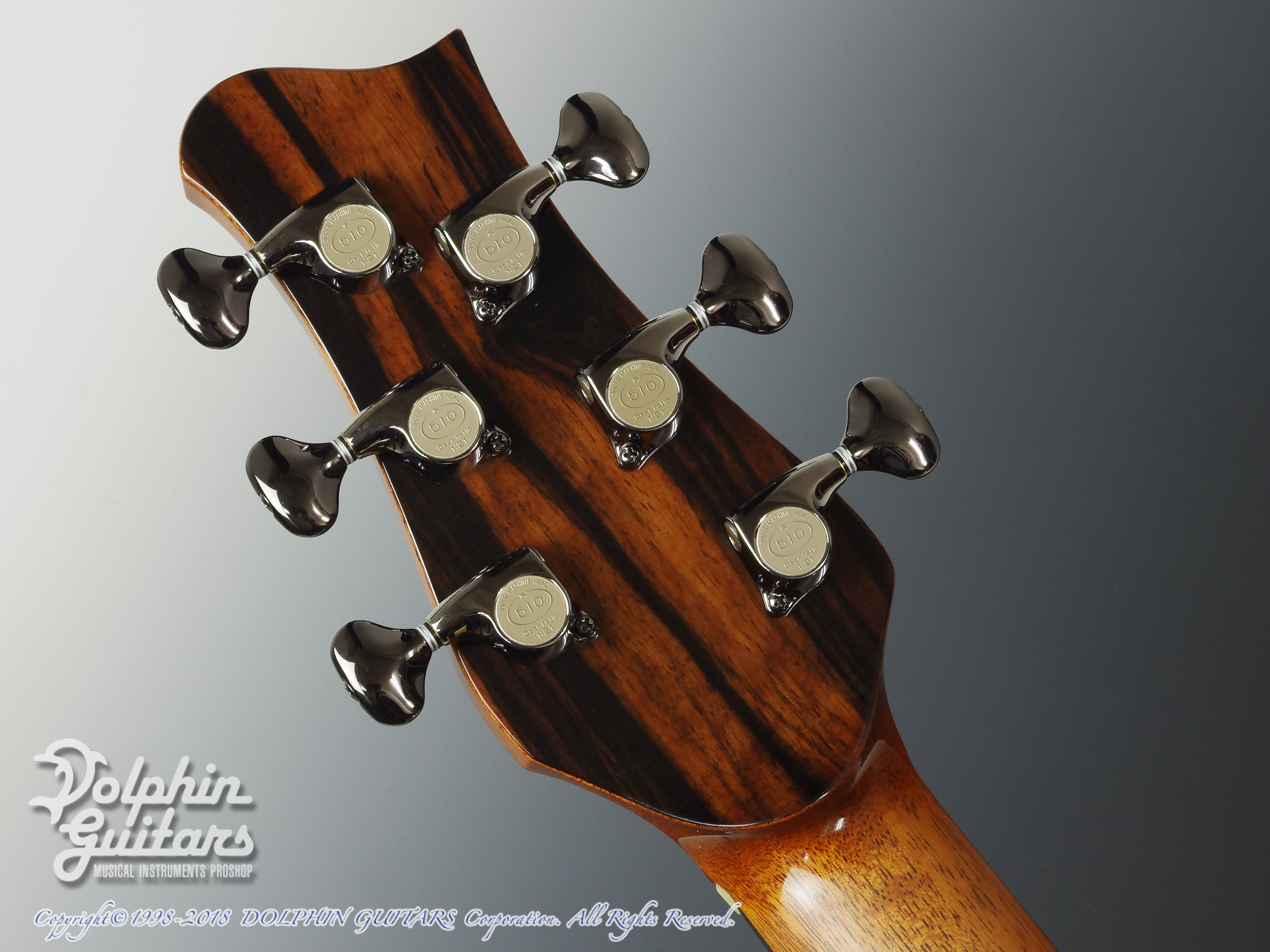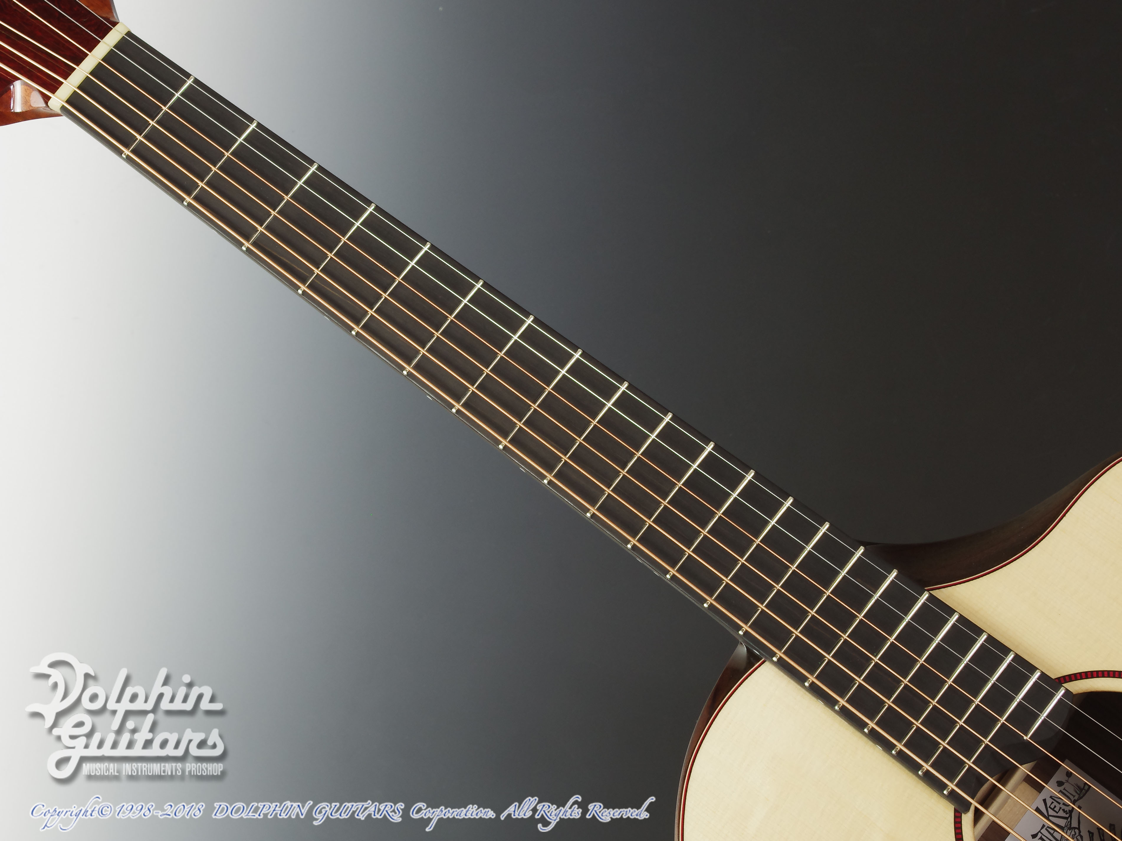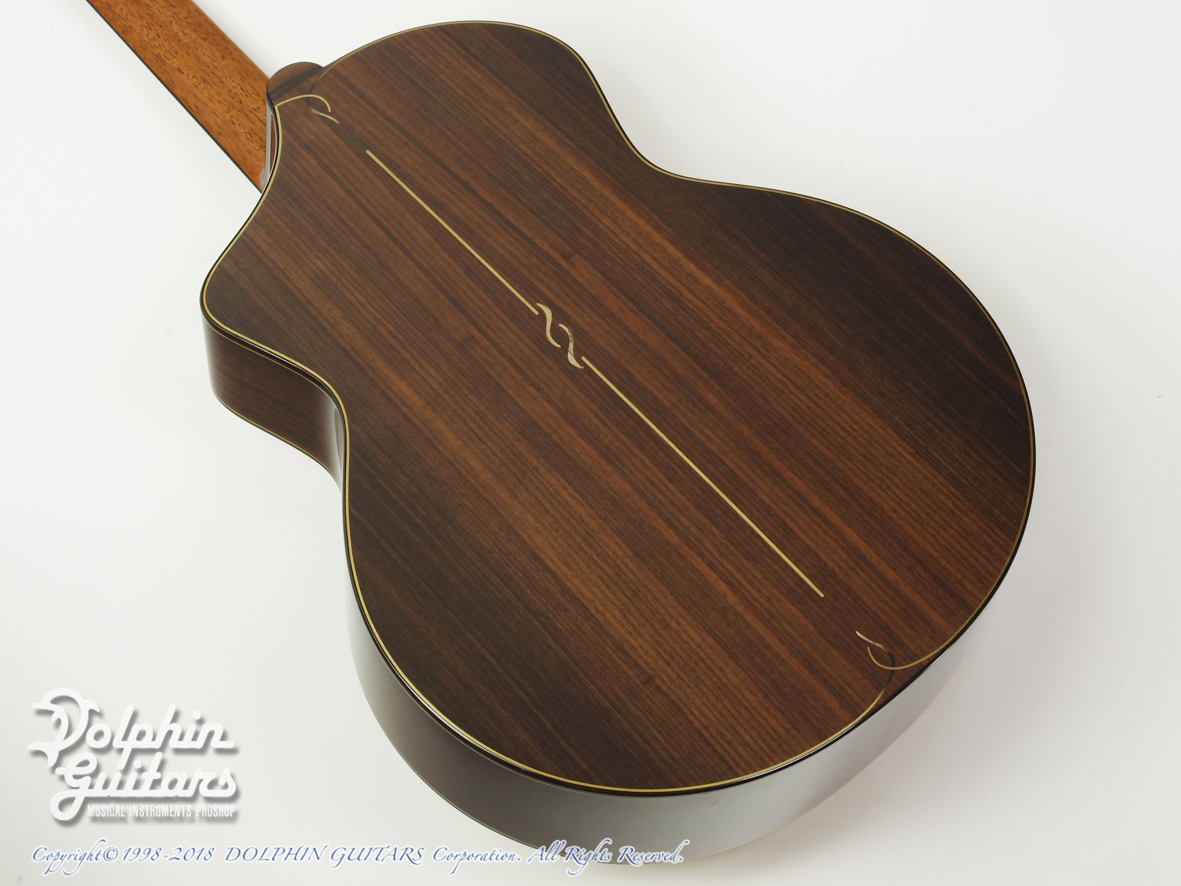 イングルマン・スプルーストップ、インディアン・ローズウッドS&B、マホガニーネック、エボニー指板&ブリッジ、ヒールレス・ネックジョイント、ベータチタニュウム製のトラスロッド、べヴェルド・カッタウェイ、スポルテッド・メイプル×パドックによるビルトイン・ピックガード。