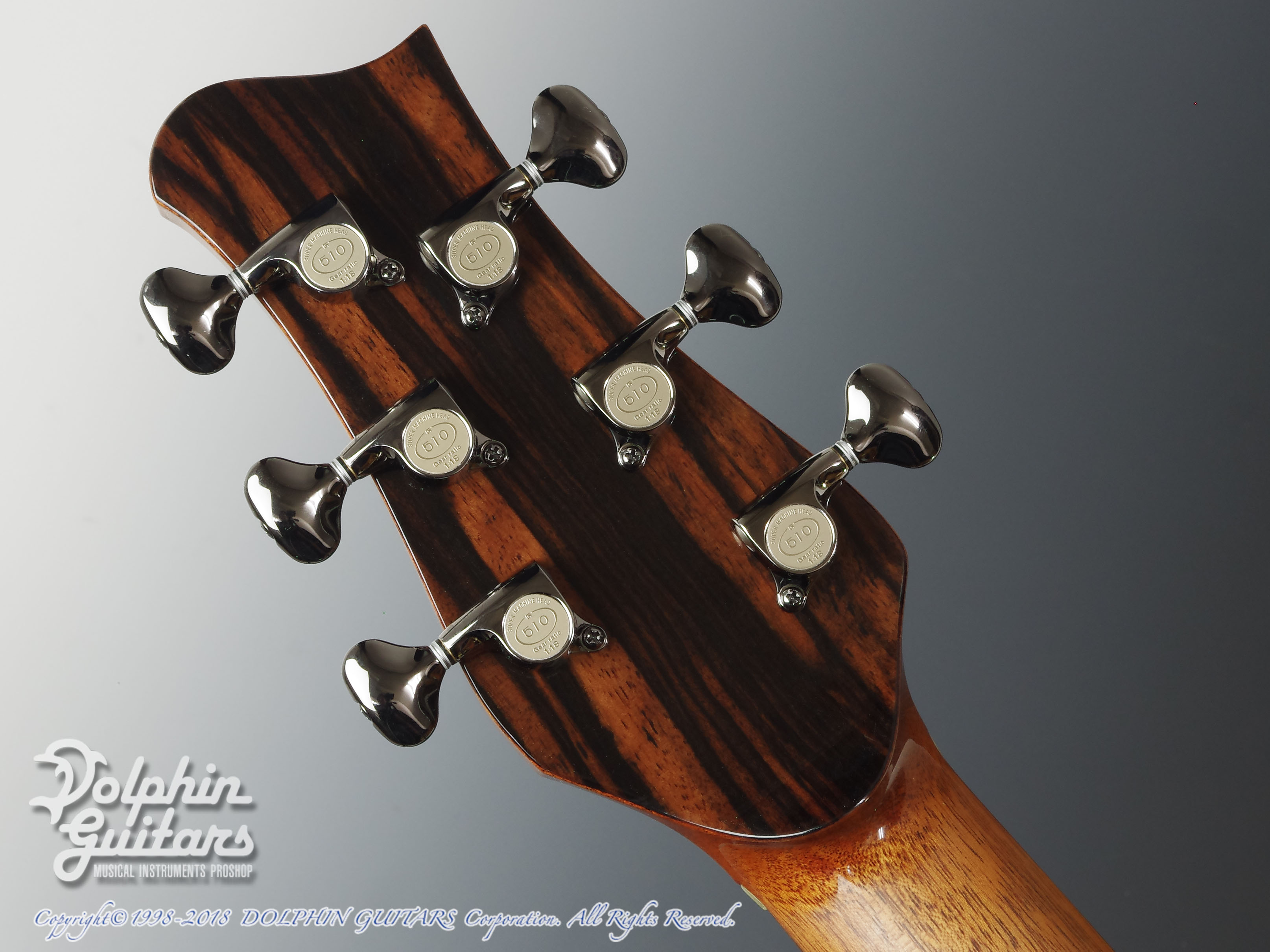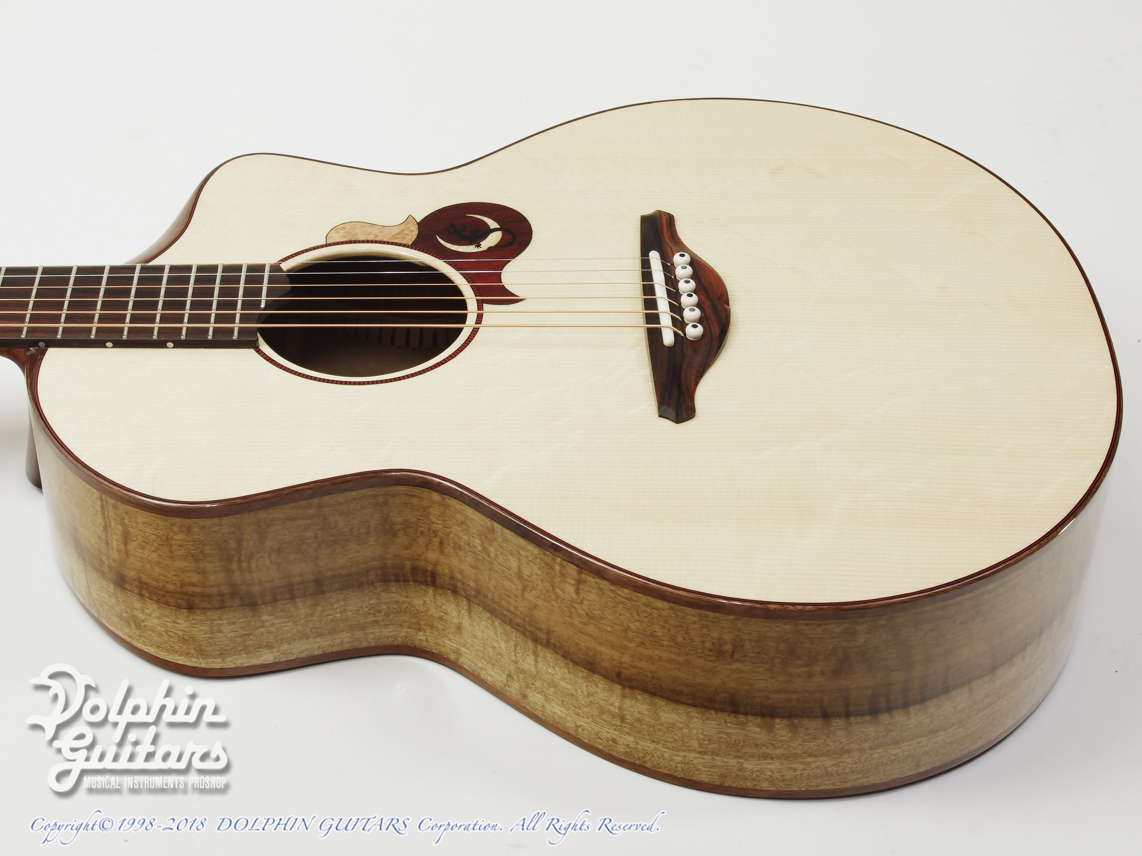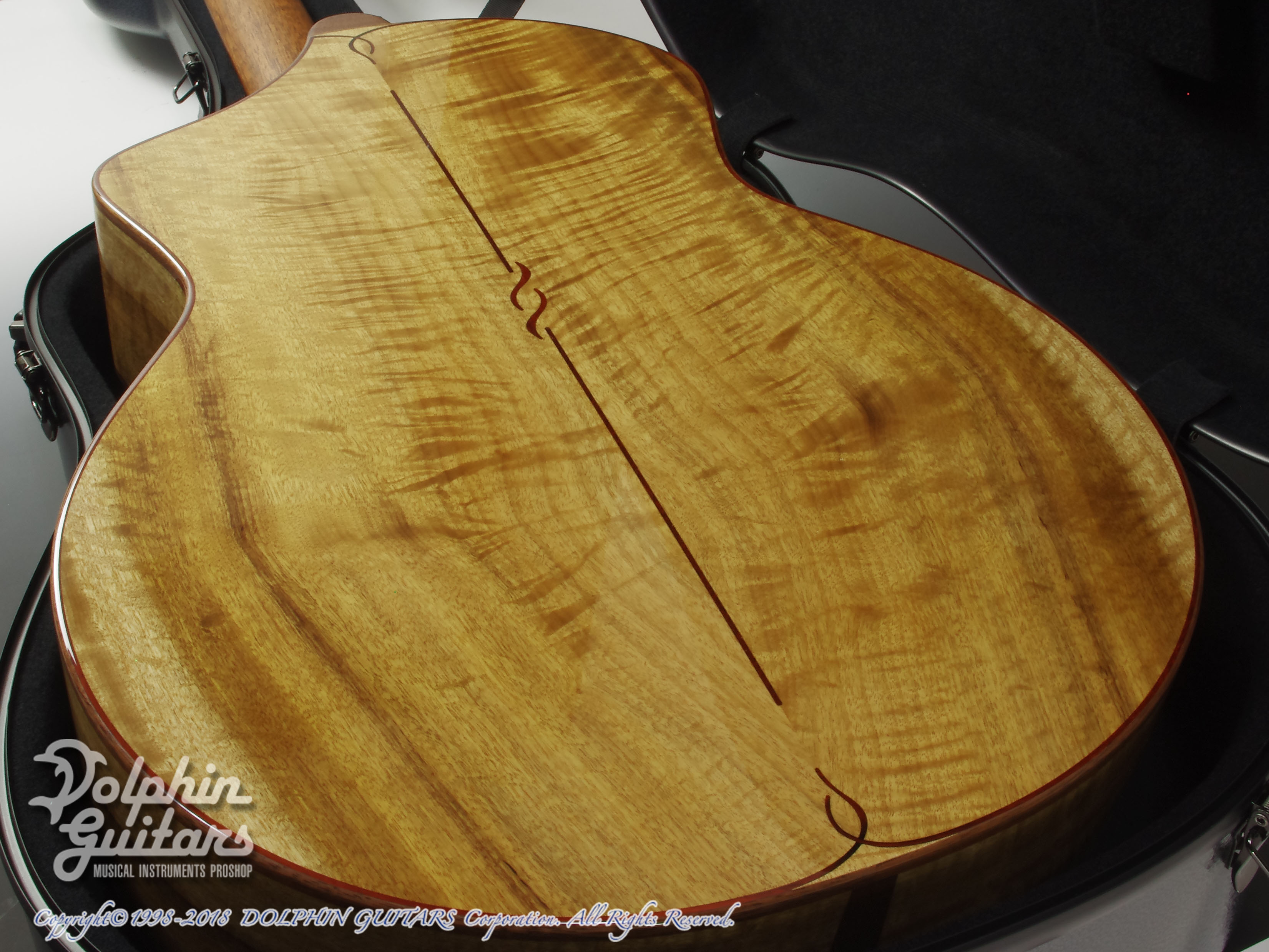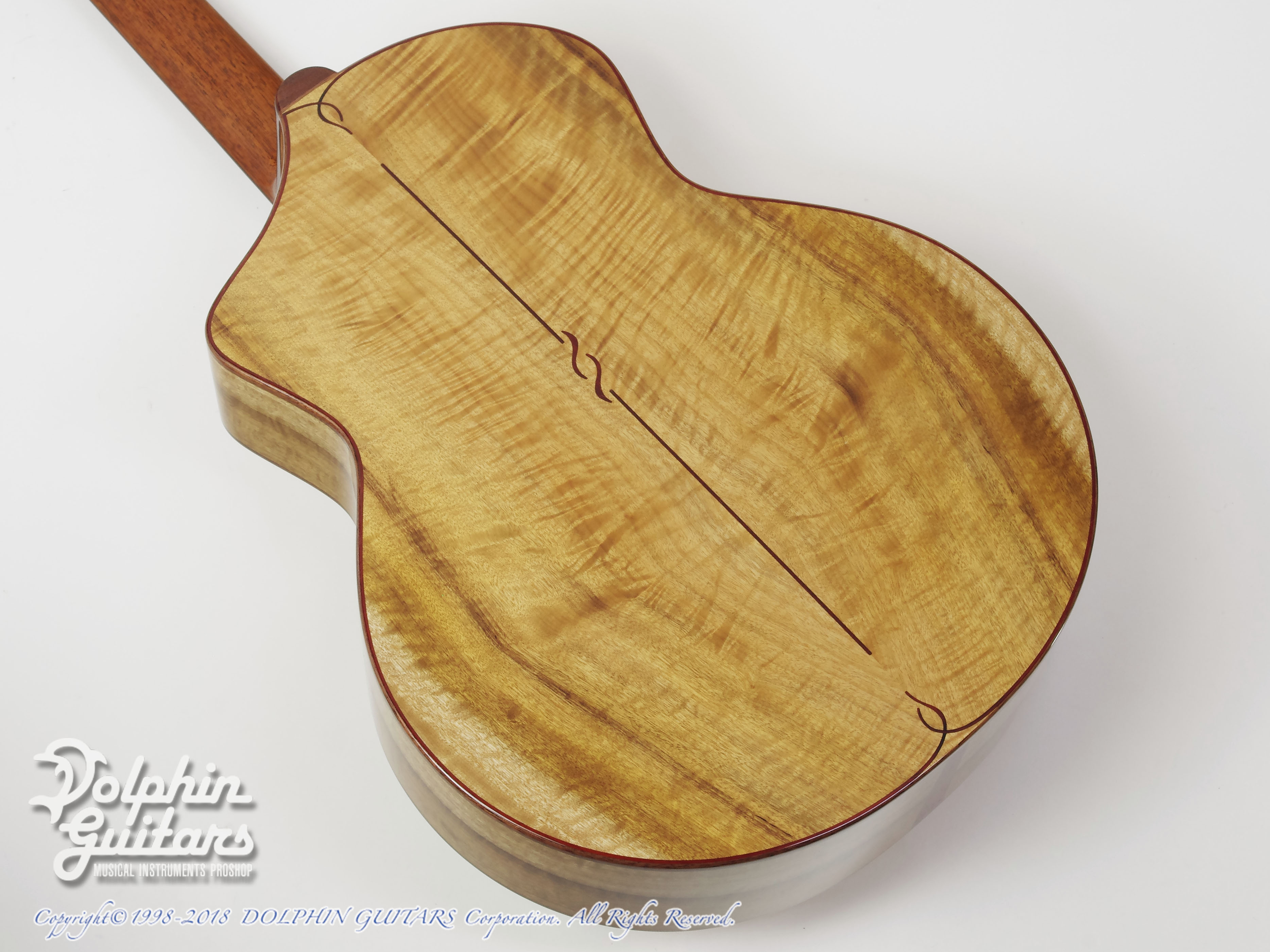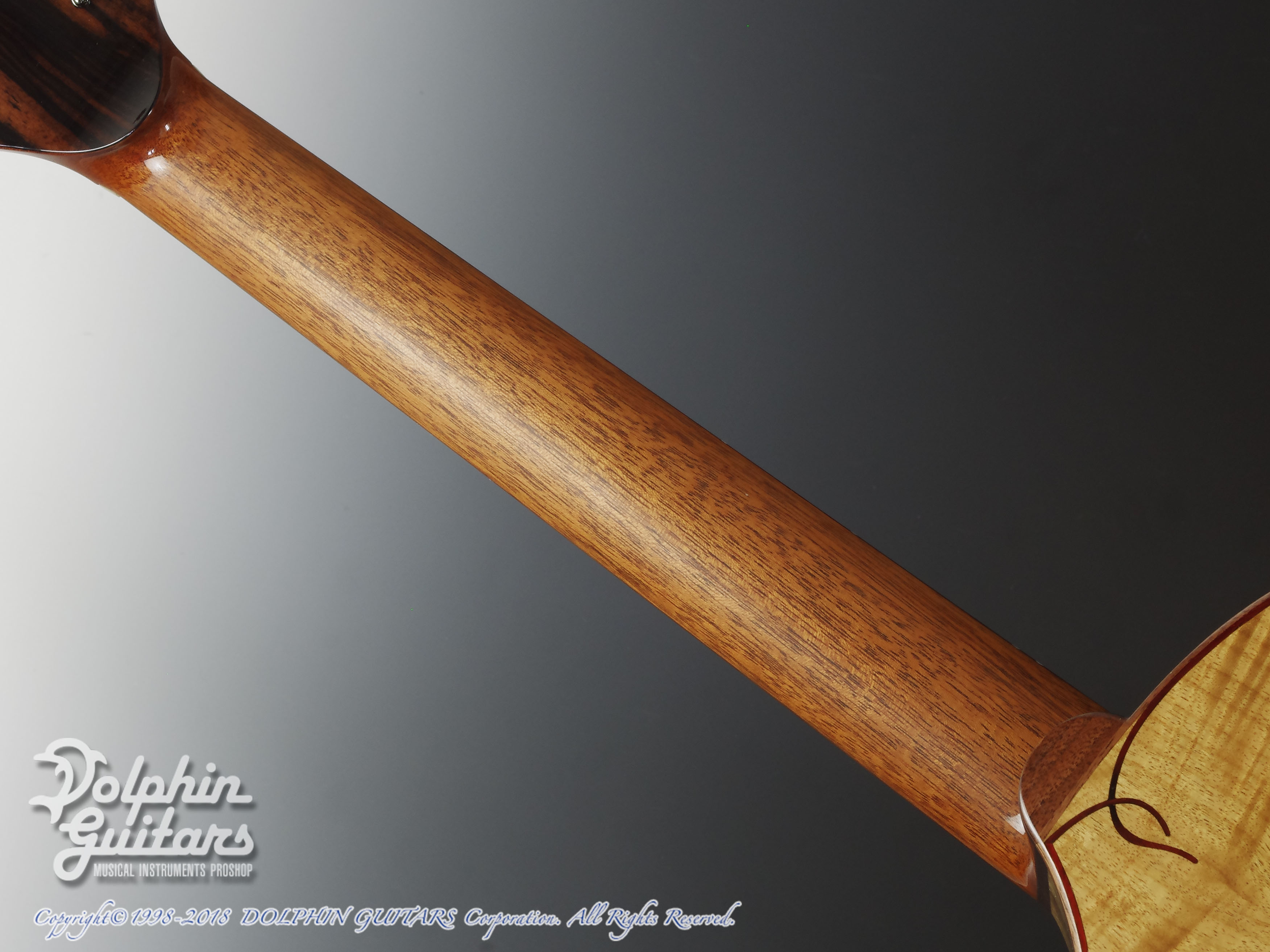 ジャーマン・スプルーストップ、フィギャード・マートルウッドS&B、マホガニーネック、エボニー指板&ブリッジ、ヒールレス・ネックジョイント、ベータチタニュウム製のトラスロッド、べヴェルド・カッタウェイ、スポルテッド・メイプル×パドックによるビルトイン・ピックガード。