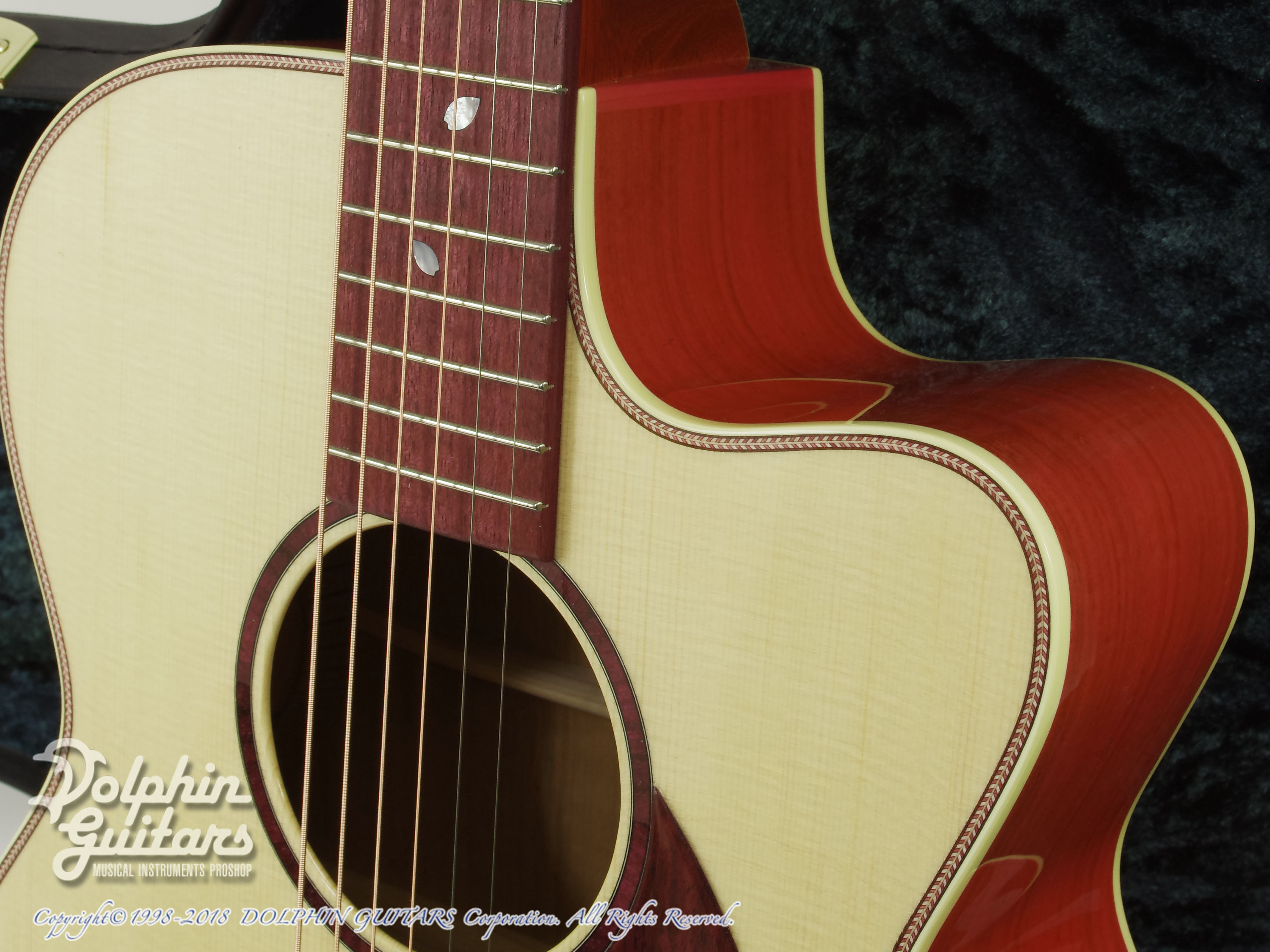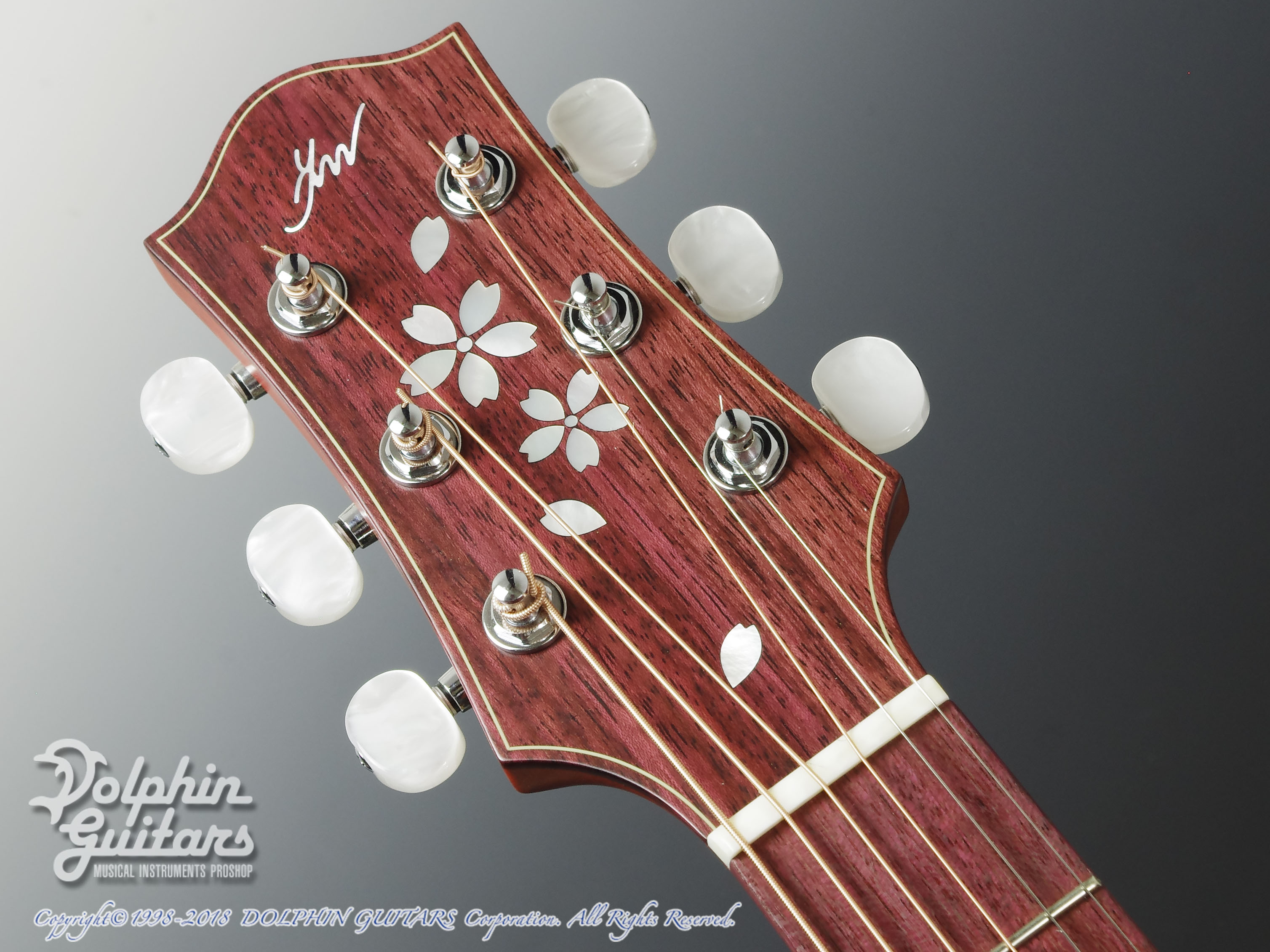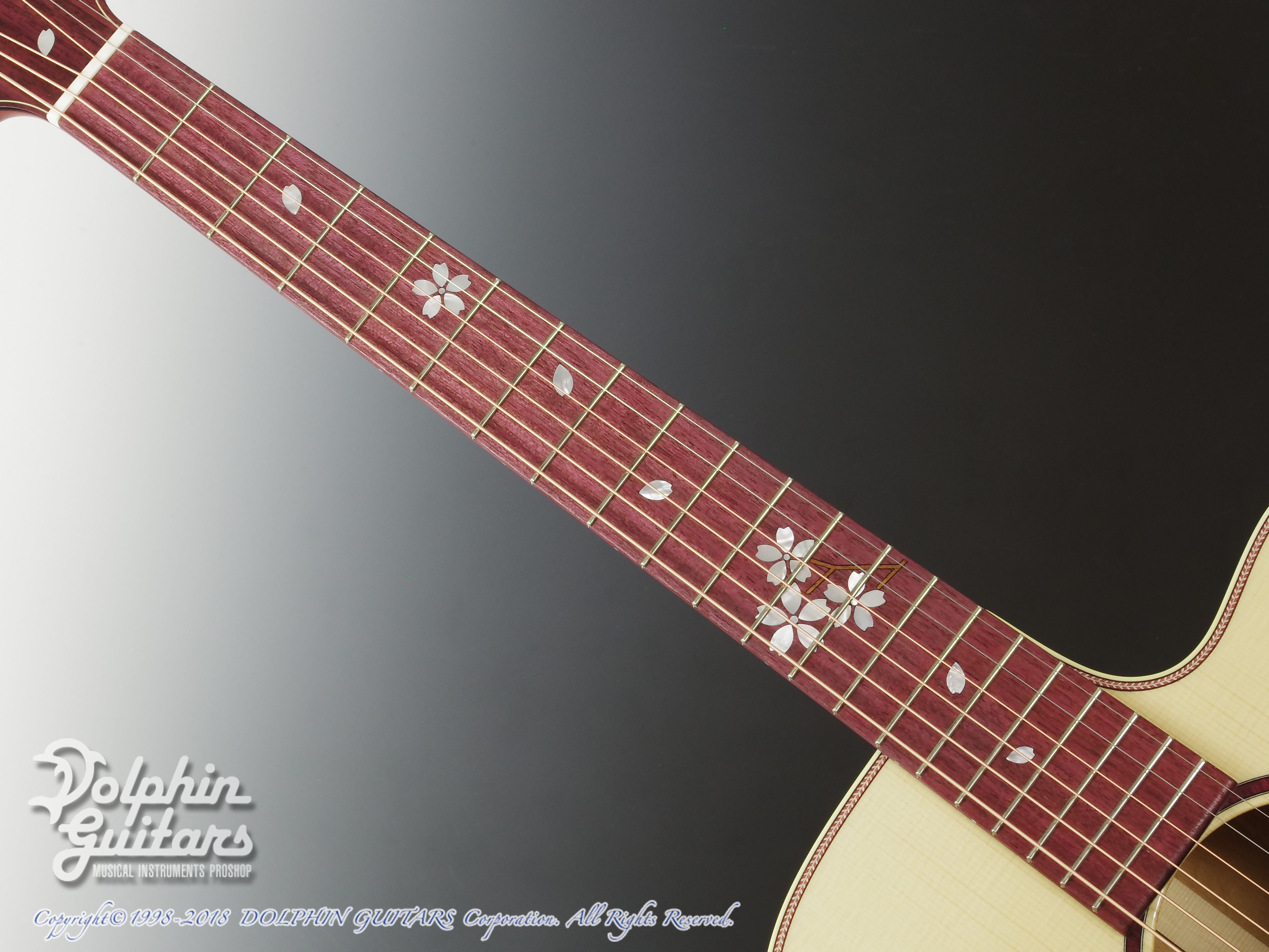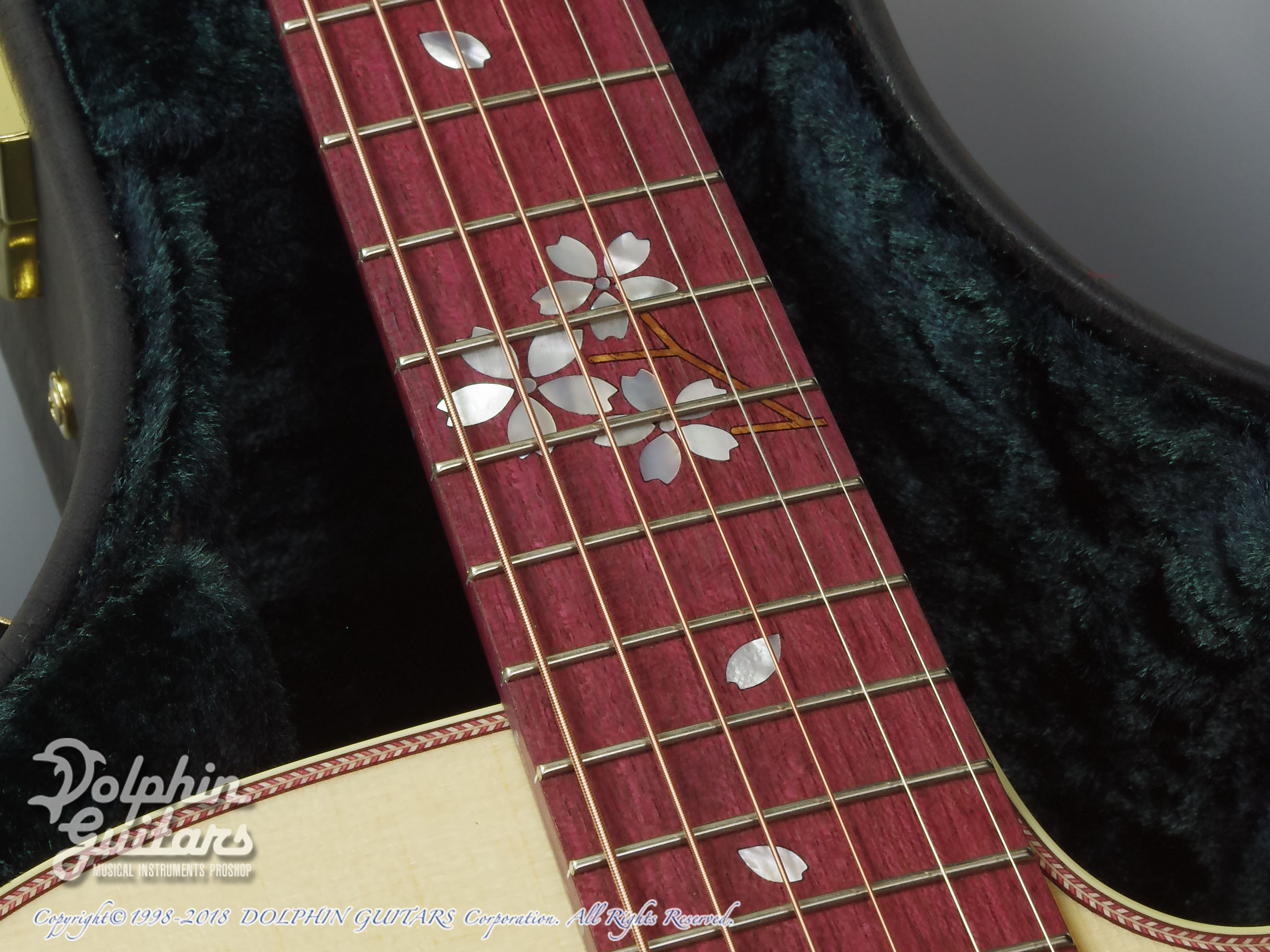 ホワイト・スプルーストップ、桜S&B、ホンデュラス・マホガニー1pネック、パープルハート指板&ブリッジ&ピックガード&ロゼッタ、アイボロイド・バインディング、ヘリンボーントリム、ベネチアンカッタウェイ、Gotohペグ。