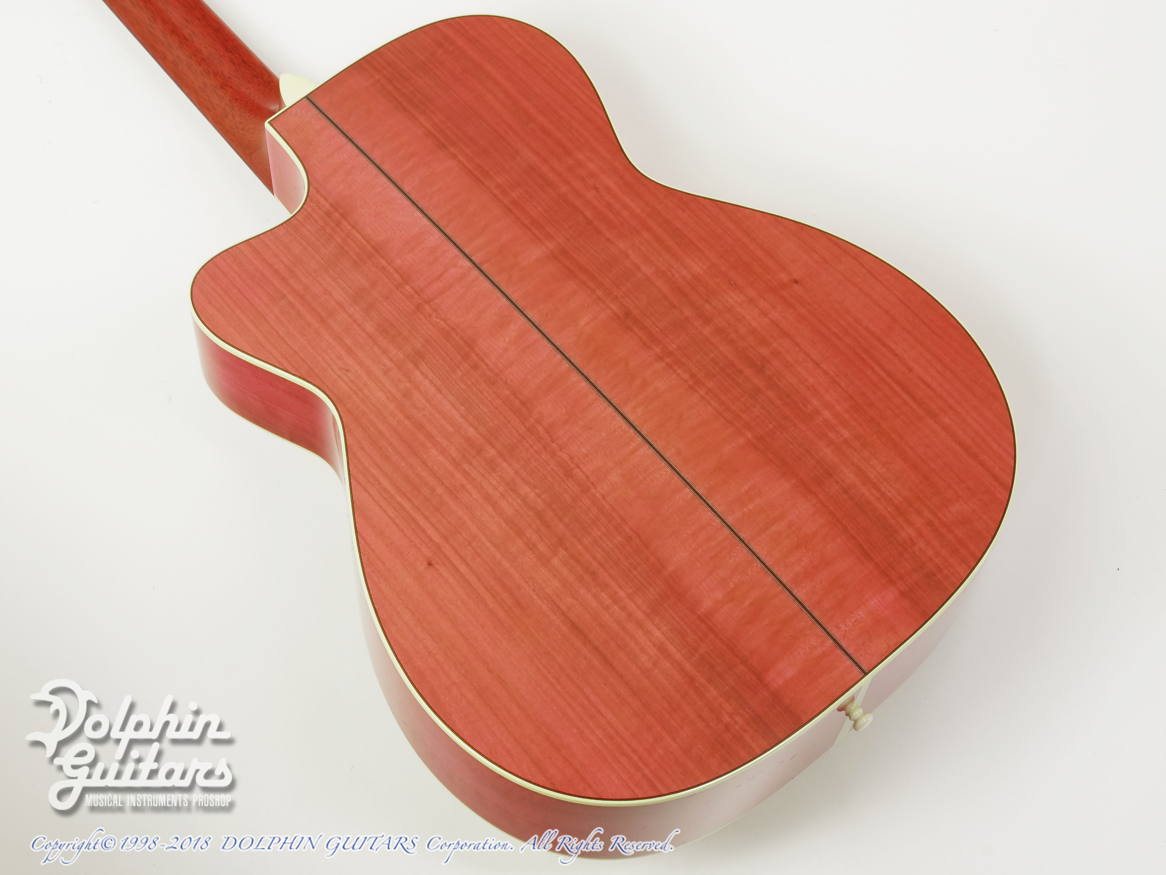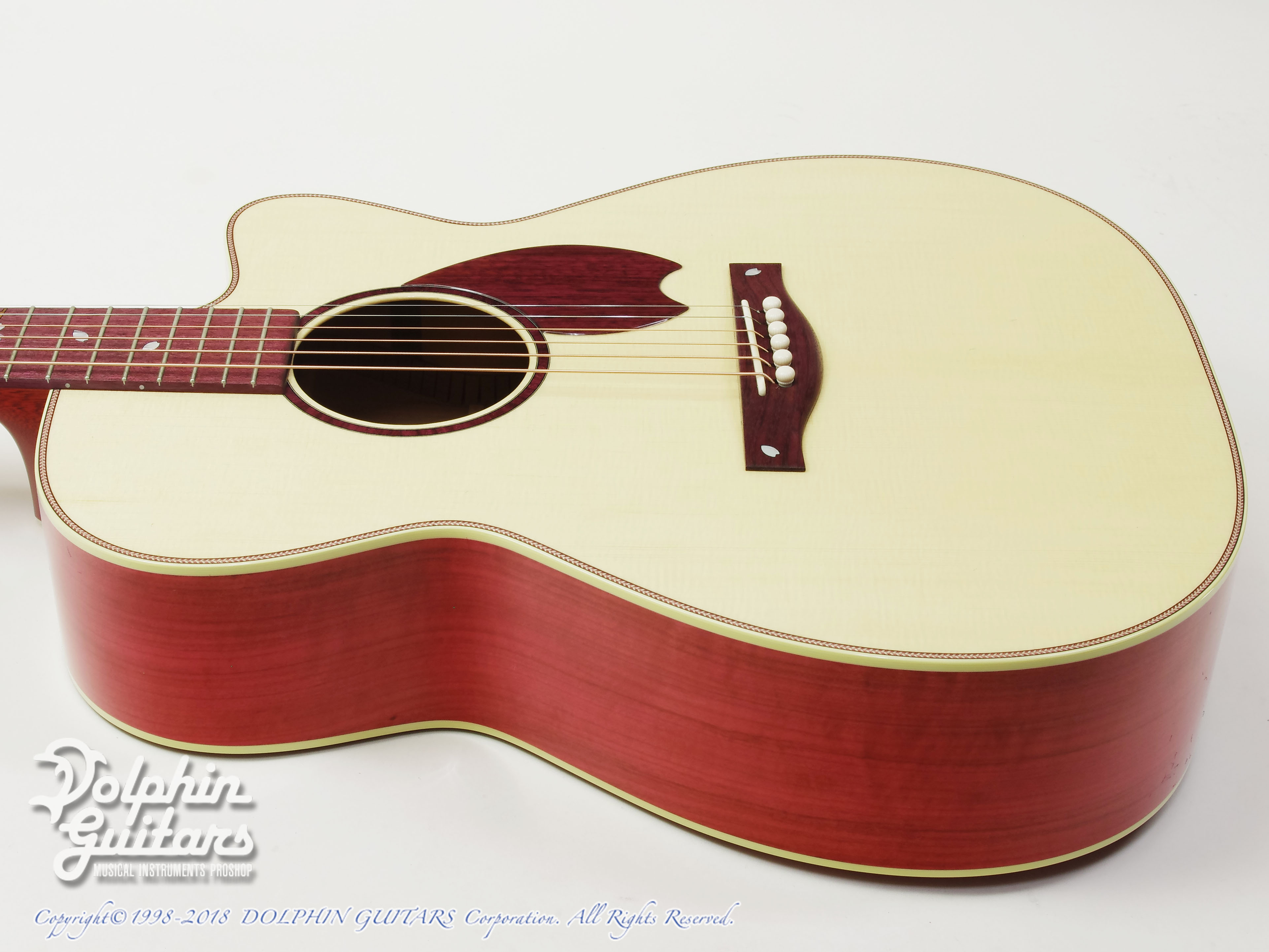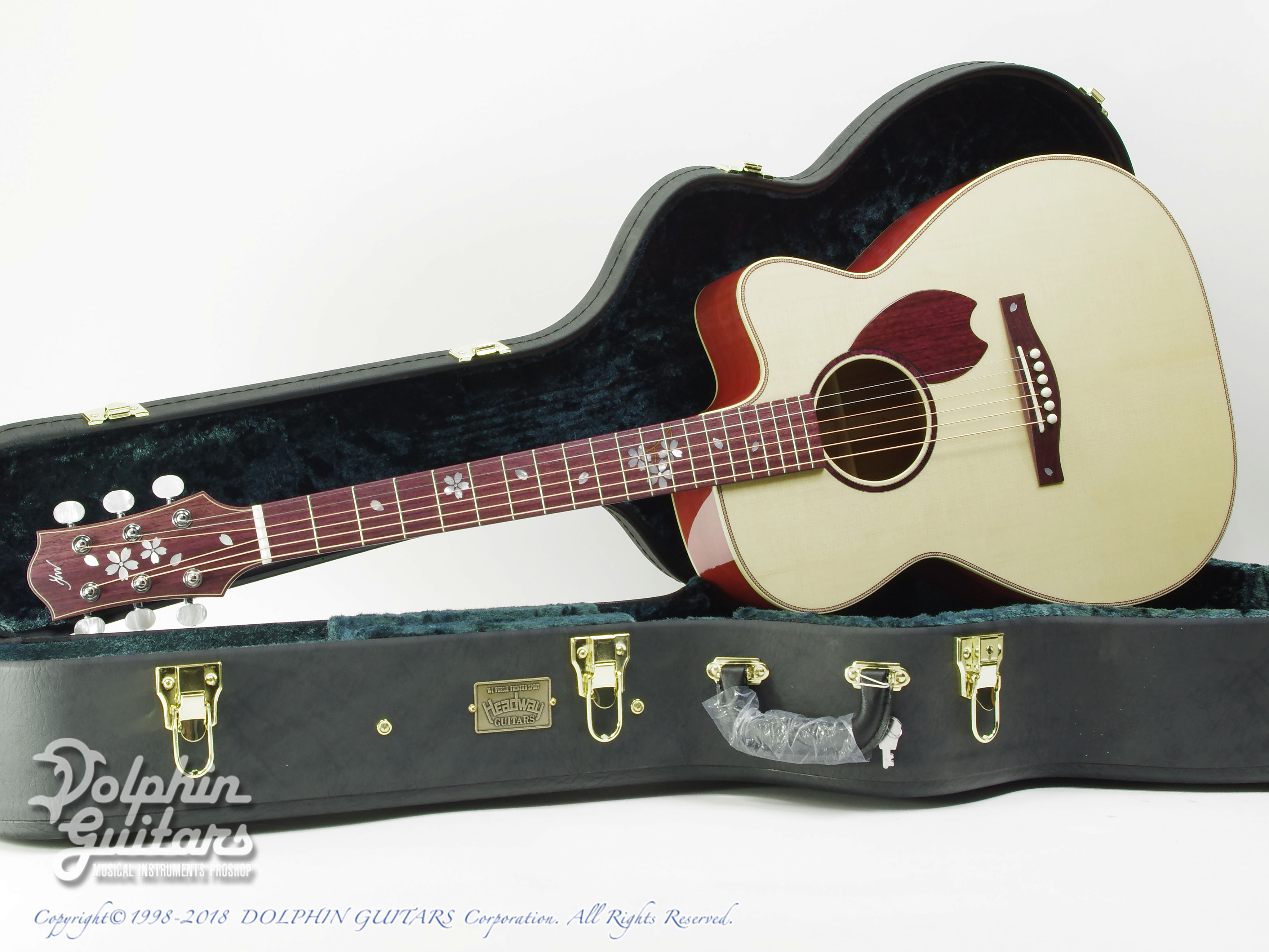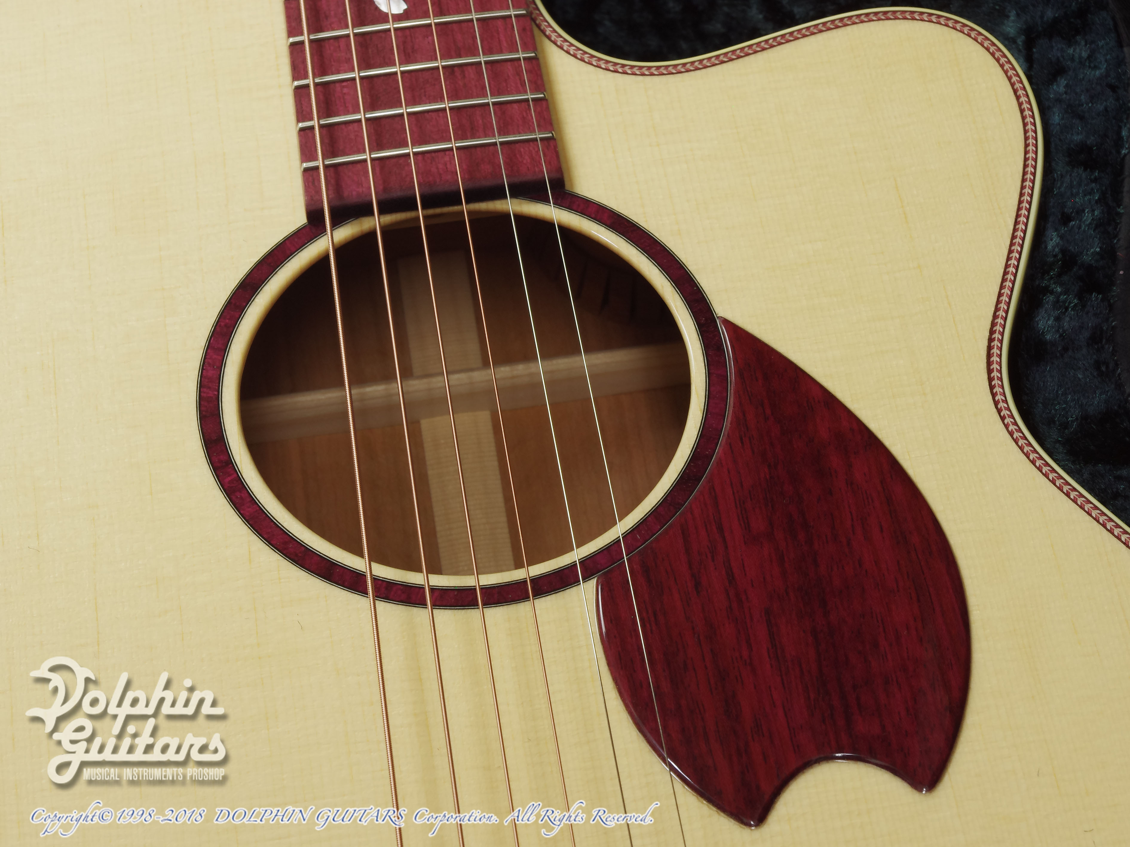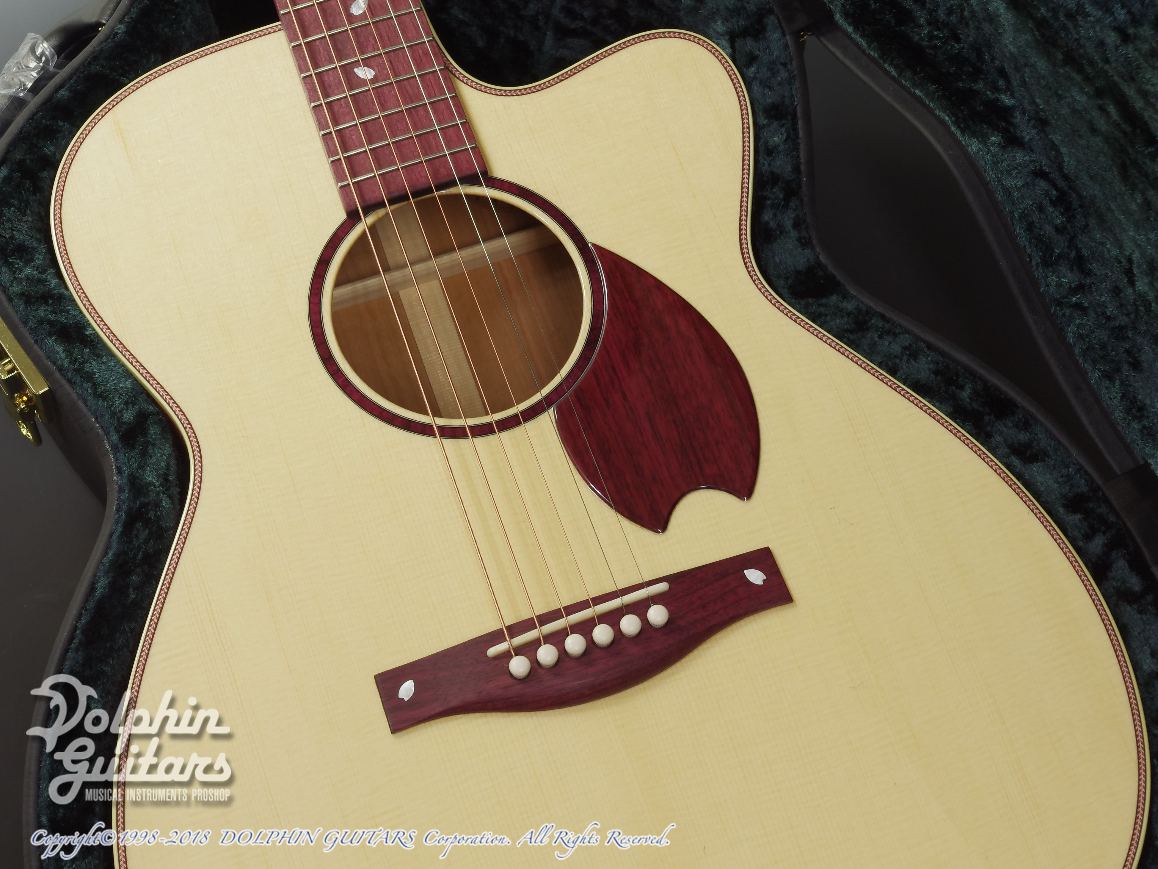 ホワイト・スプルーストップ、桜S&B、ホンデュラス・マホガニー1pネック、パープルハート指板&ブリッジ&ピックガード&ロゼッタ、アイボロイド・バインディング、ヘリンボーントリム、ベネチアンカッタウェイ、Gotohペグ。