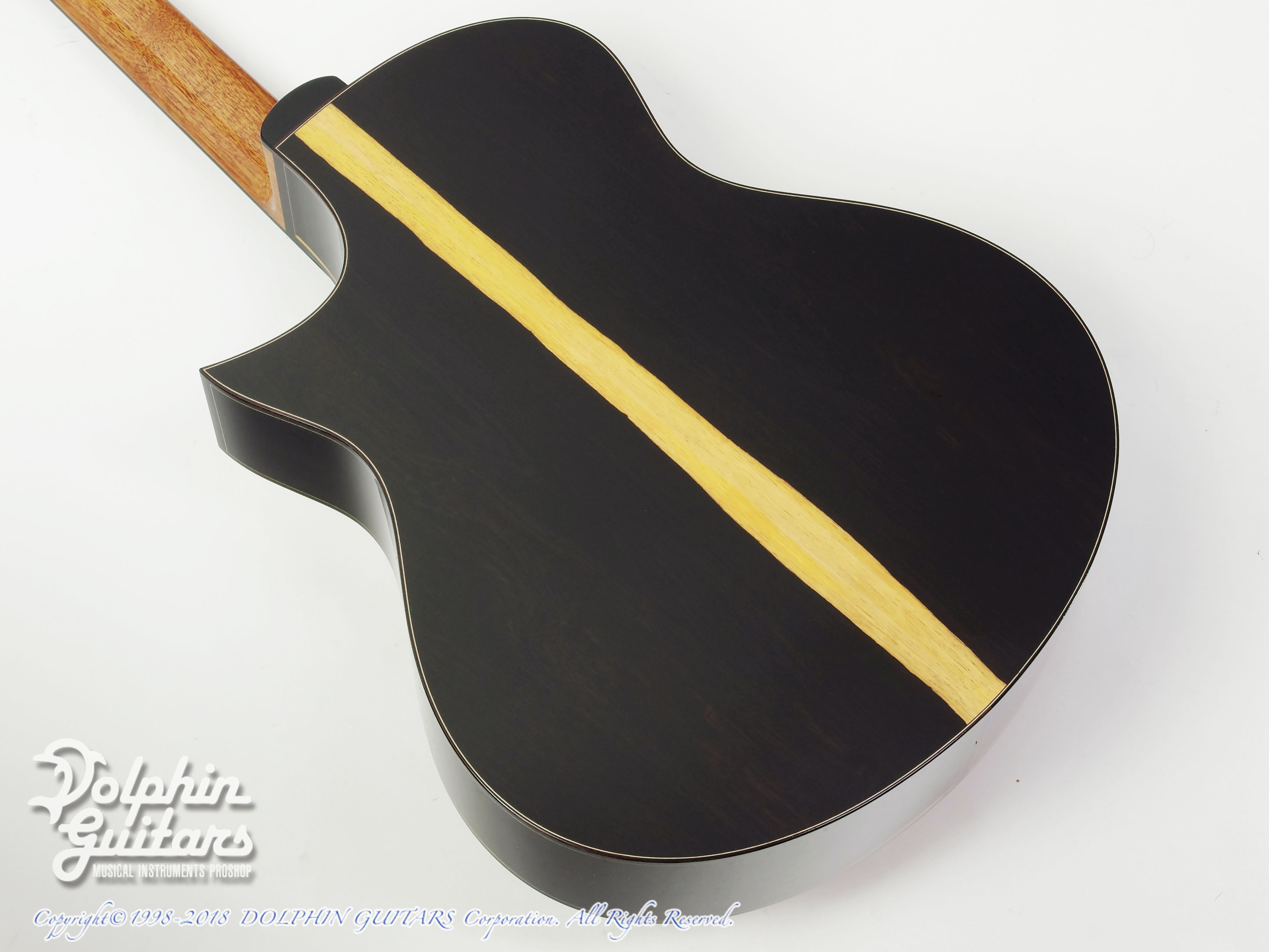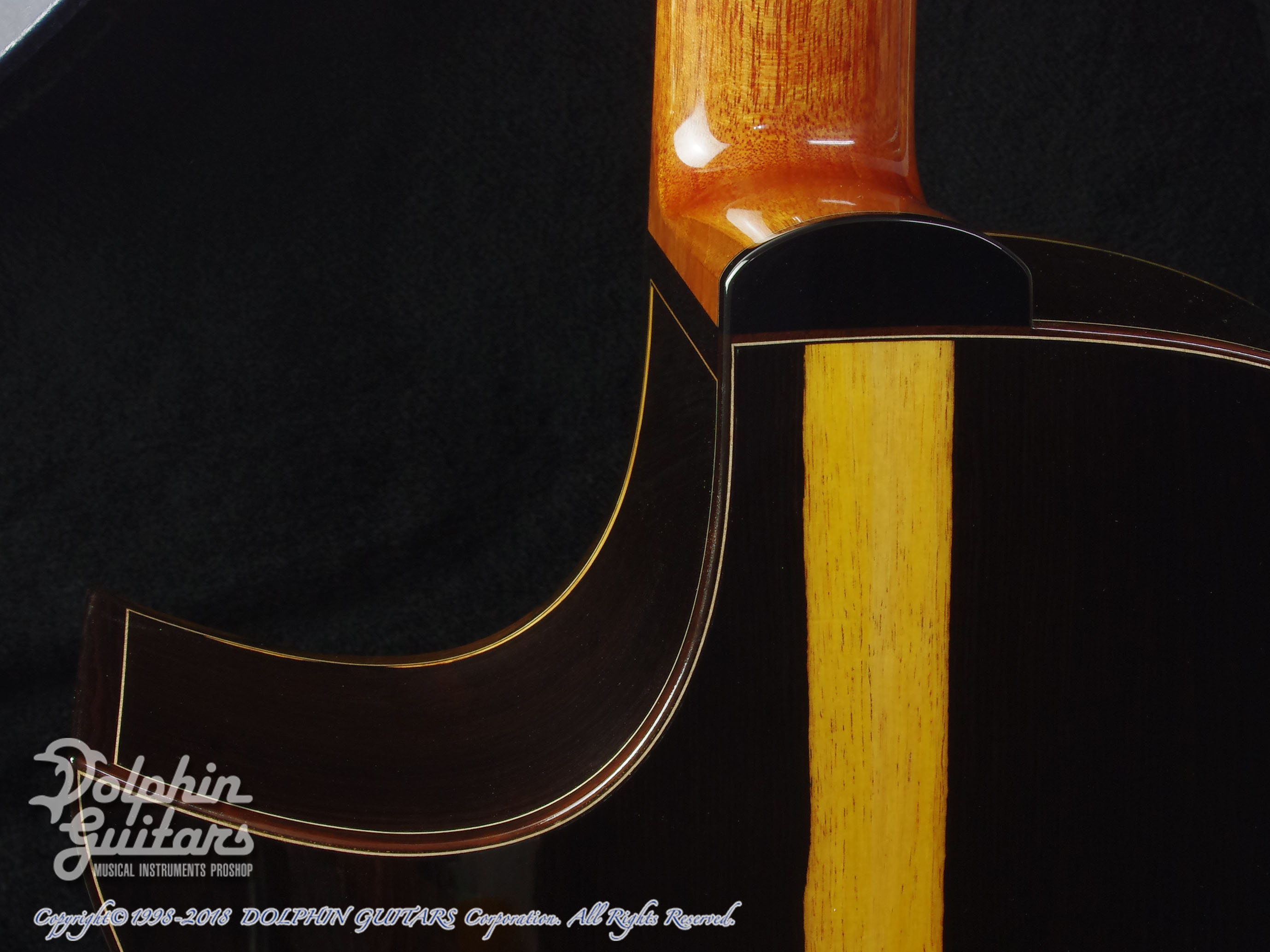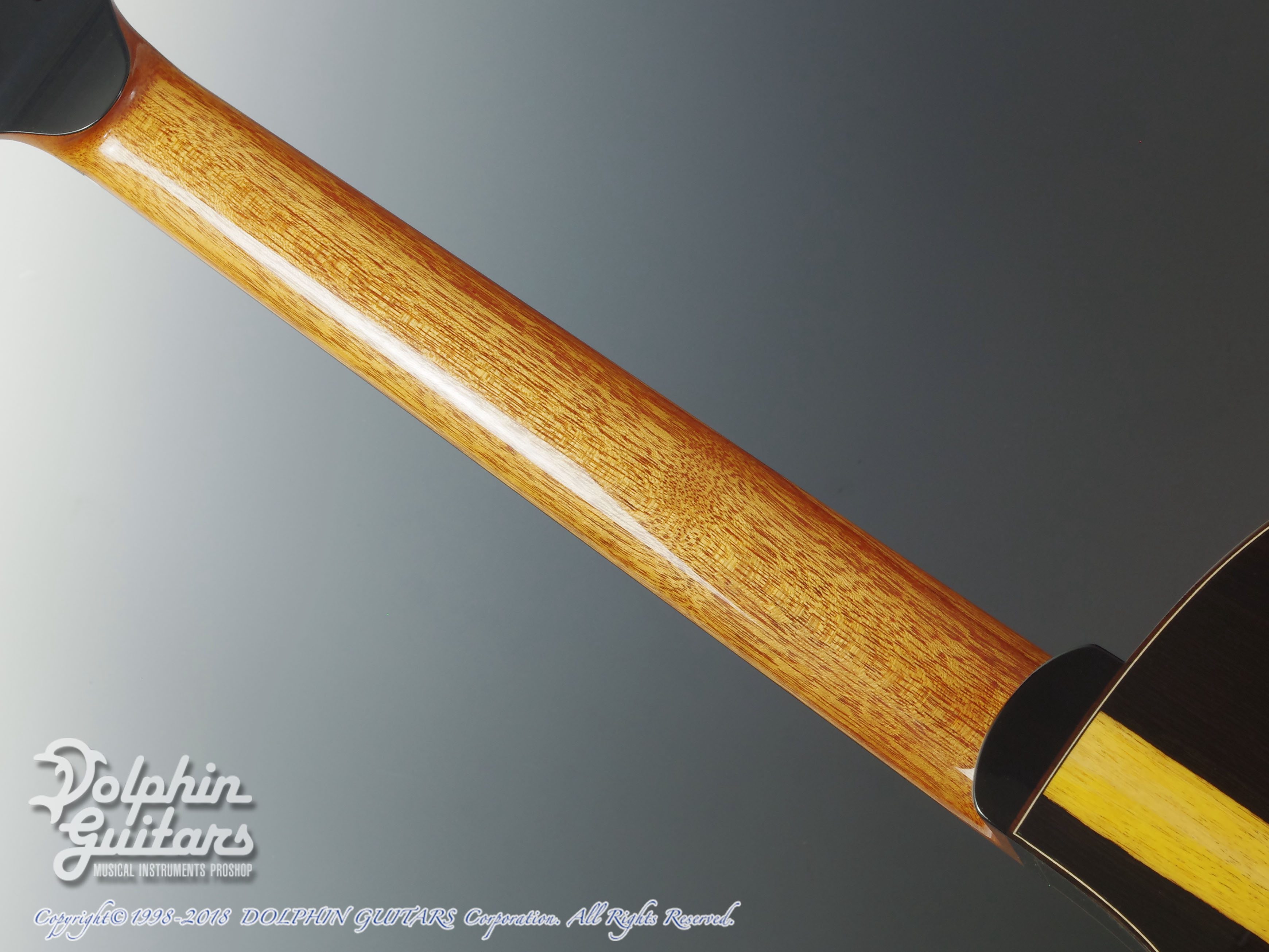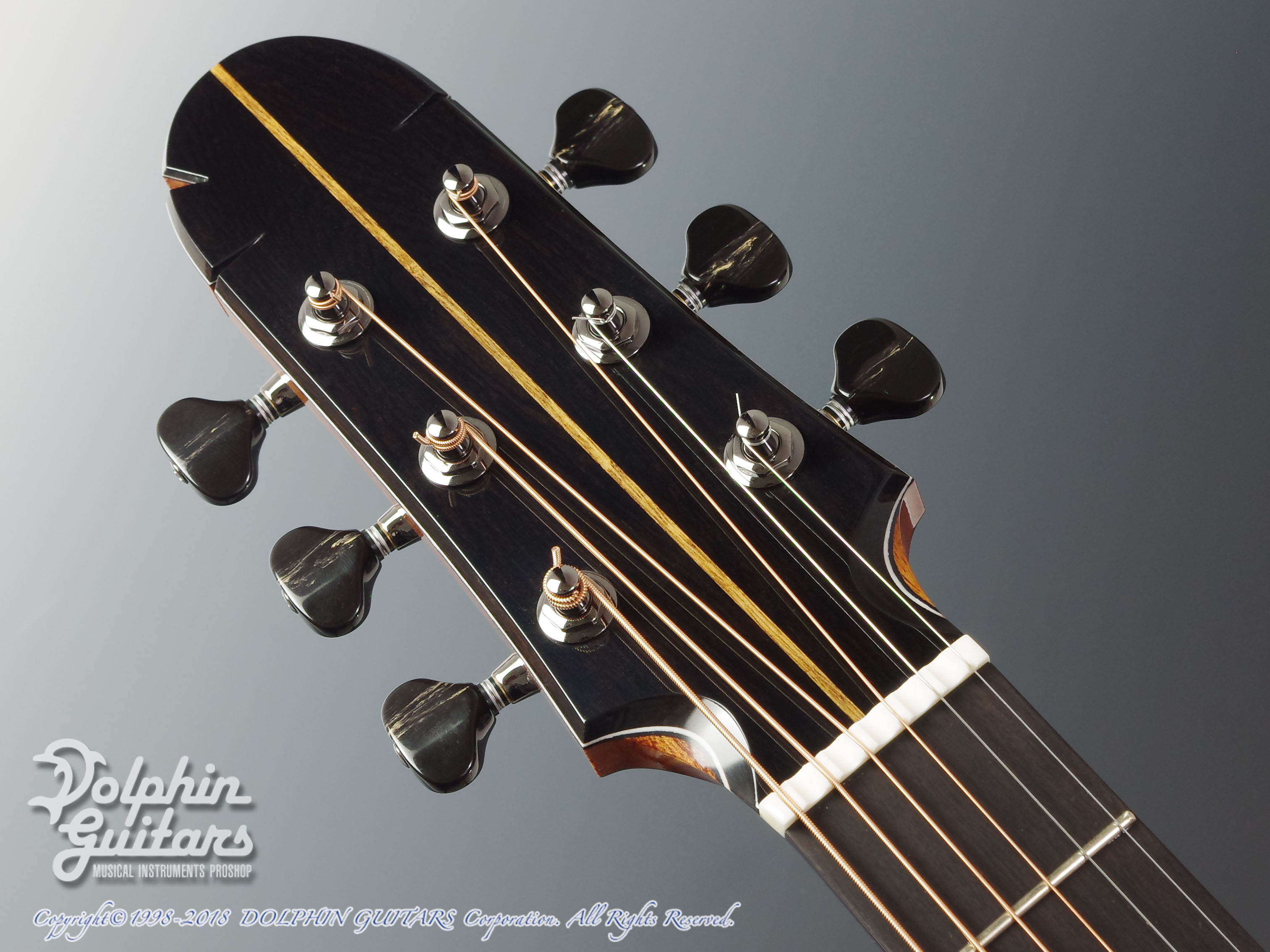 ジャーマン・スプルーストップ、アフリカンブラックウッドS&B、ホンデュラスマホガニー1pネック(アジャスタブルロッド)、オリジナルブレイスパターン、エボニー指板、アフリカンブラックウッドブリッジ、44,5mm幅・スキャロップドナット、約641mmスケール、ウッドロゼッタ、Gotoh510ペグ仕様。